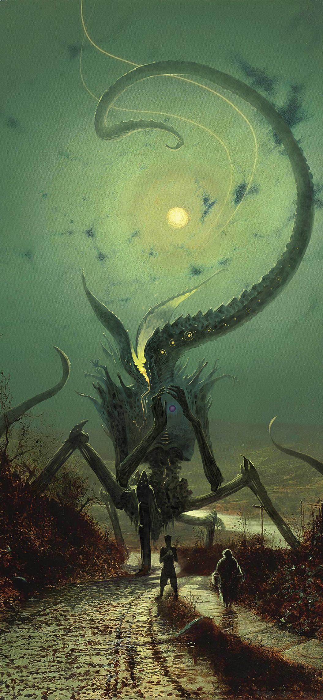 Giant Eldritch Monster On Road iPhone Wallpaper A giant eldritch monster with long tentacles stands on a road next to two people under a glowing moon in a dark fantasy setting. cn369 441.25 KB 1055x2285 Download original File Size: Dimensions: Format: Mobile ID: Creature Fantasy Green Horror Monster Night Tentacles