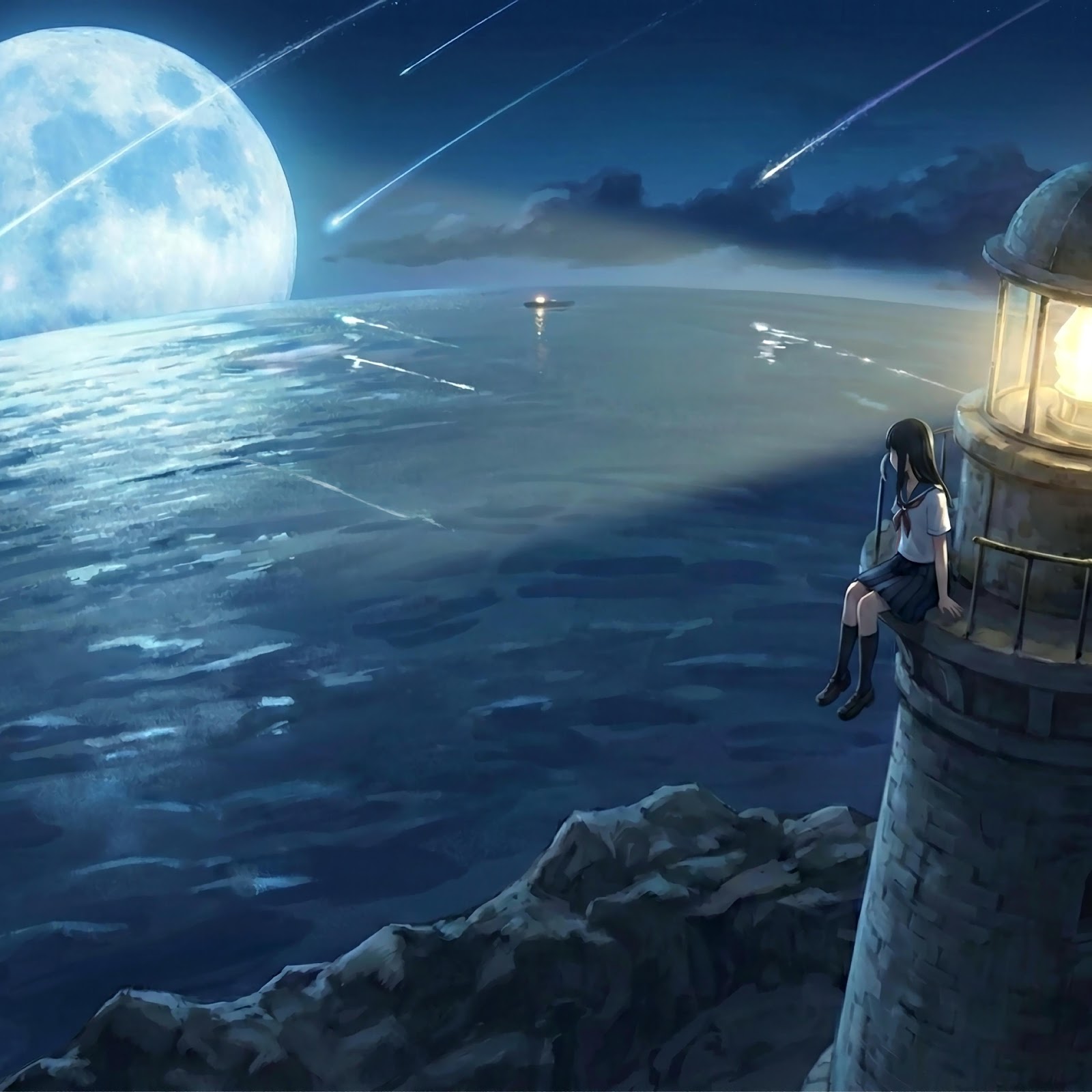 A girl sits on a lighthouse watching the bright, gigantic moon over a dark blue ocean with many shooting stars falling.