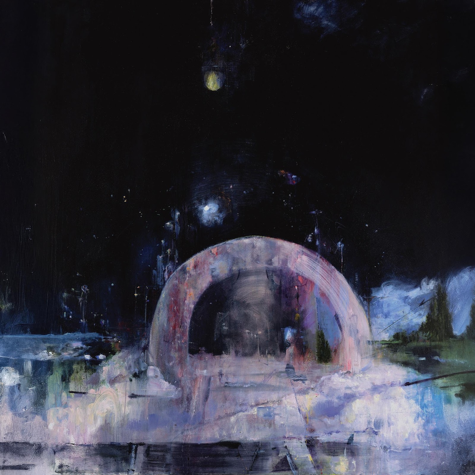 A glowing circular archway stands in a dark abstract landscape under a black sky with hazy trees and mystical light effects.