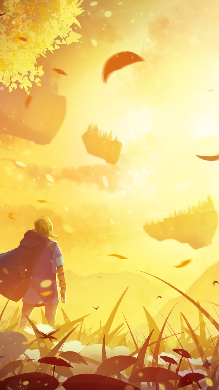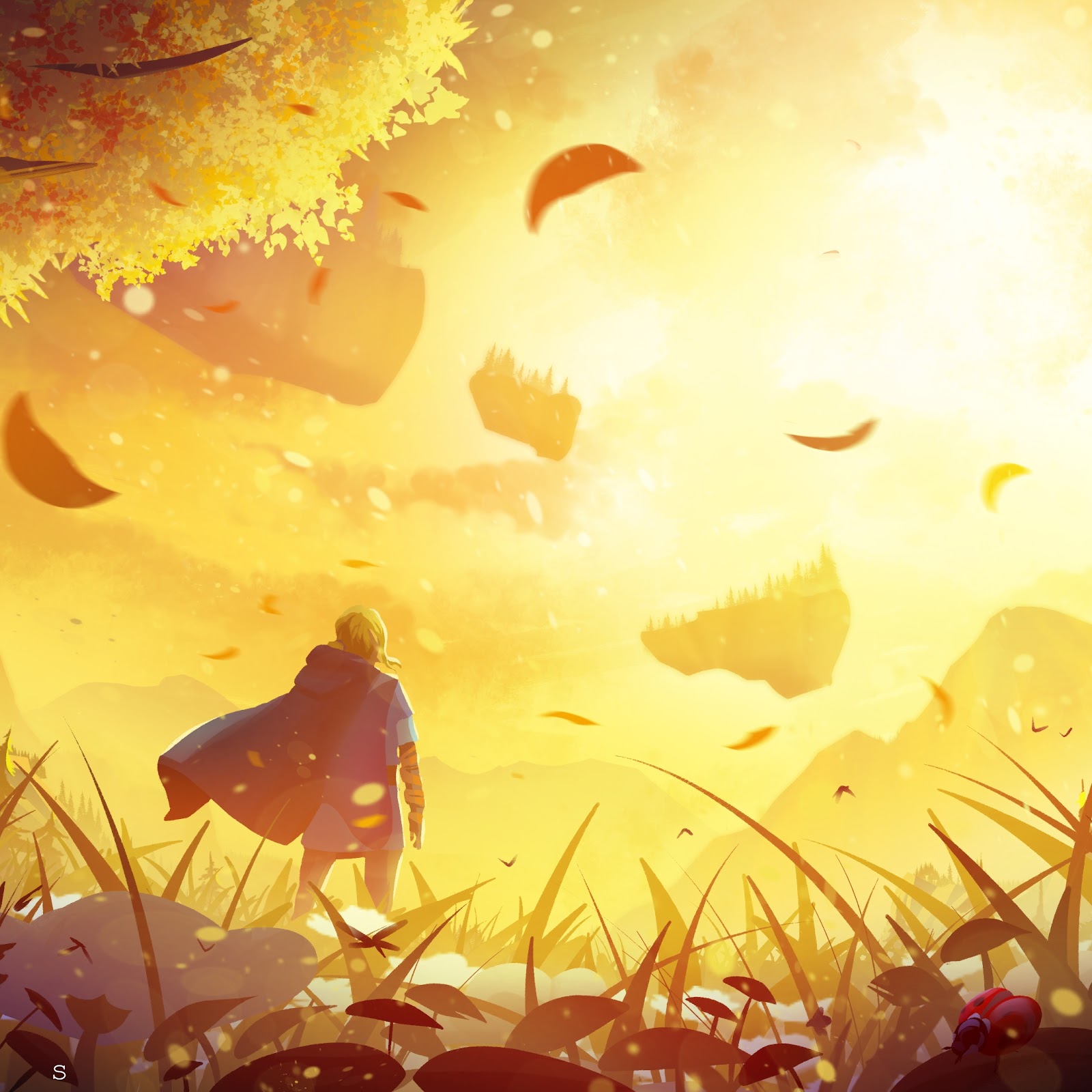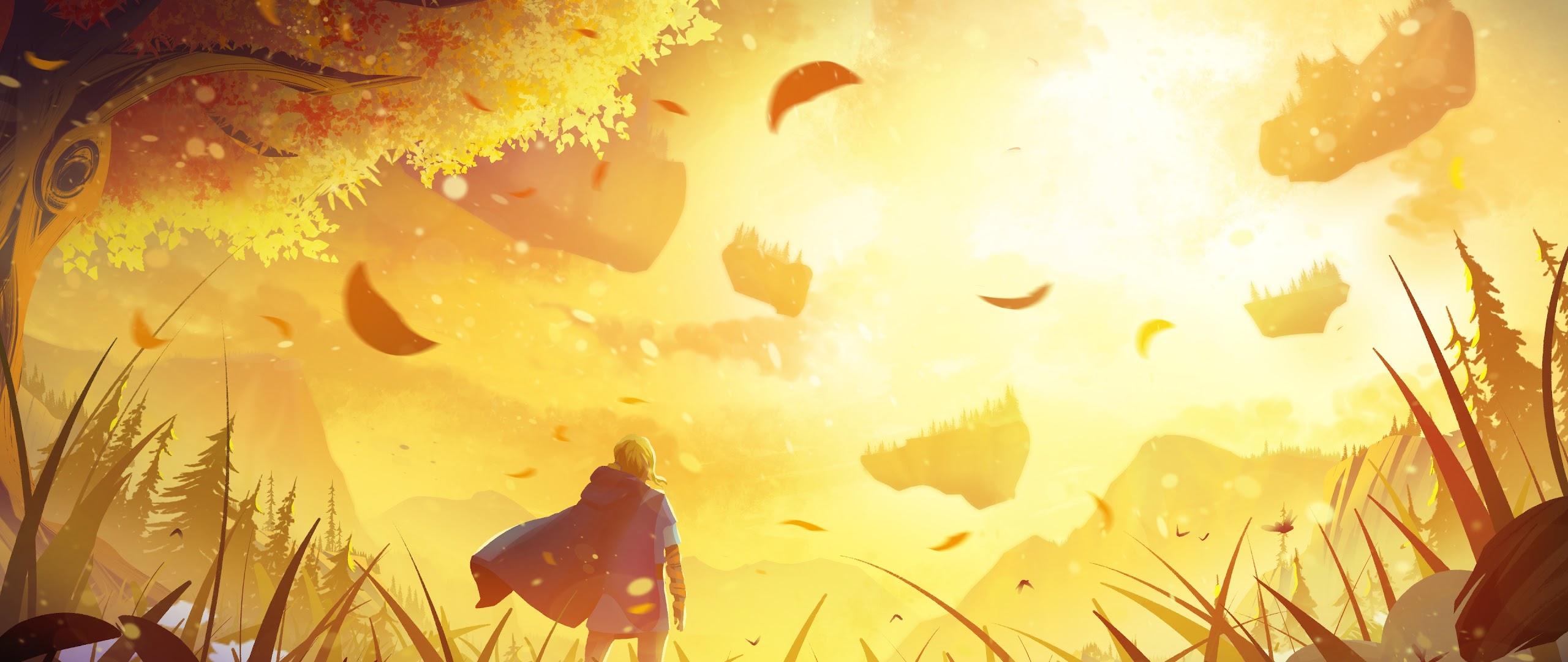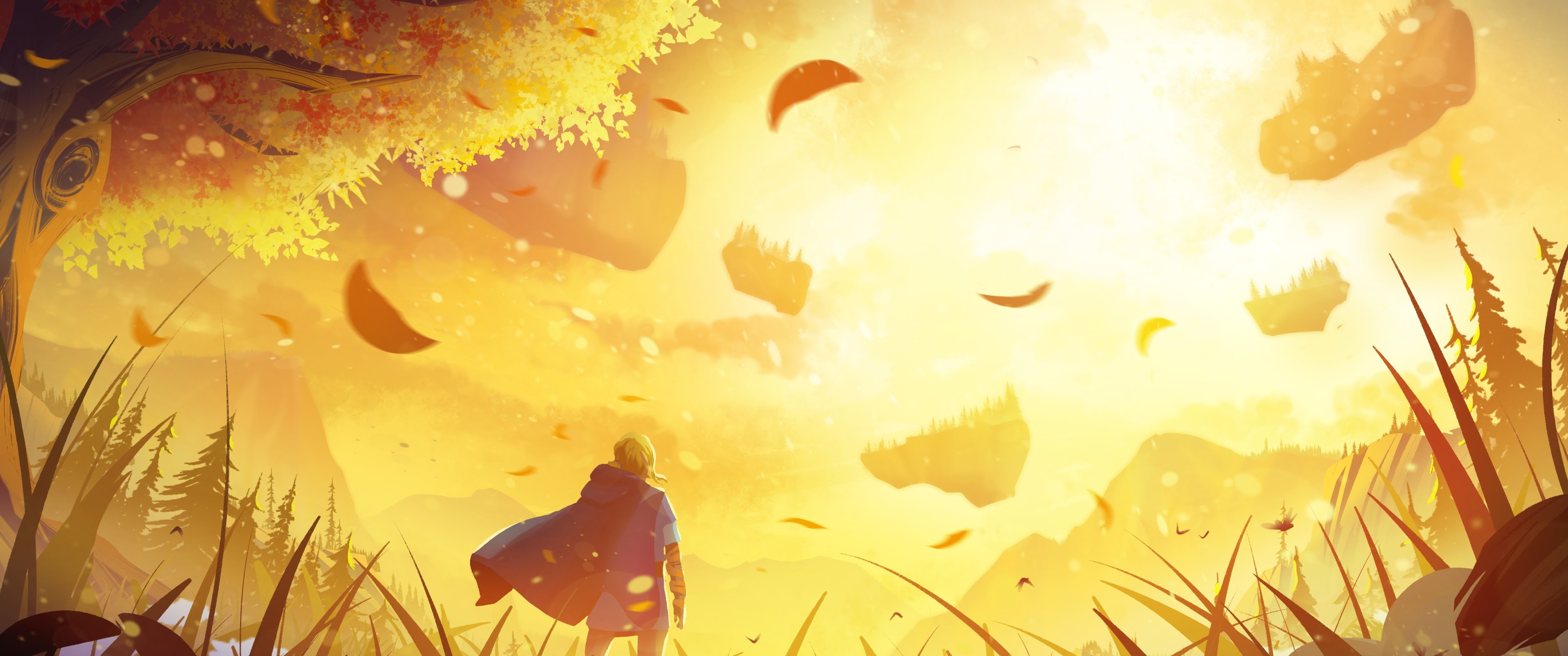 An adventurer wearing a blue cloak stands in a tall golden meadow looking at floating fantasy islands in intense sunlight.