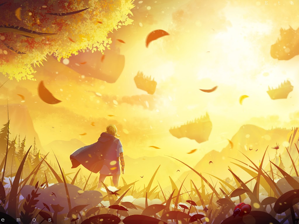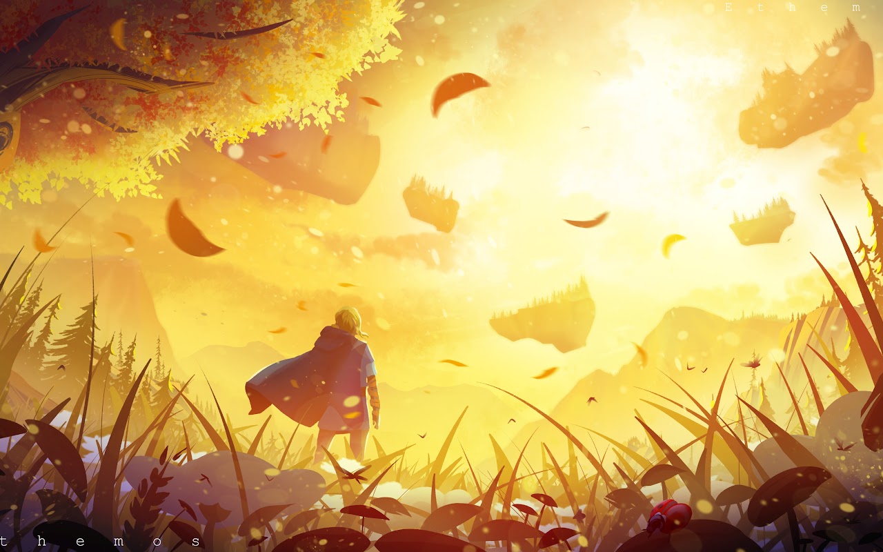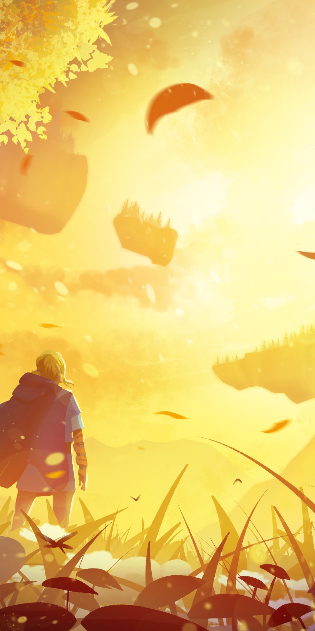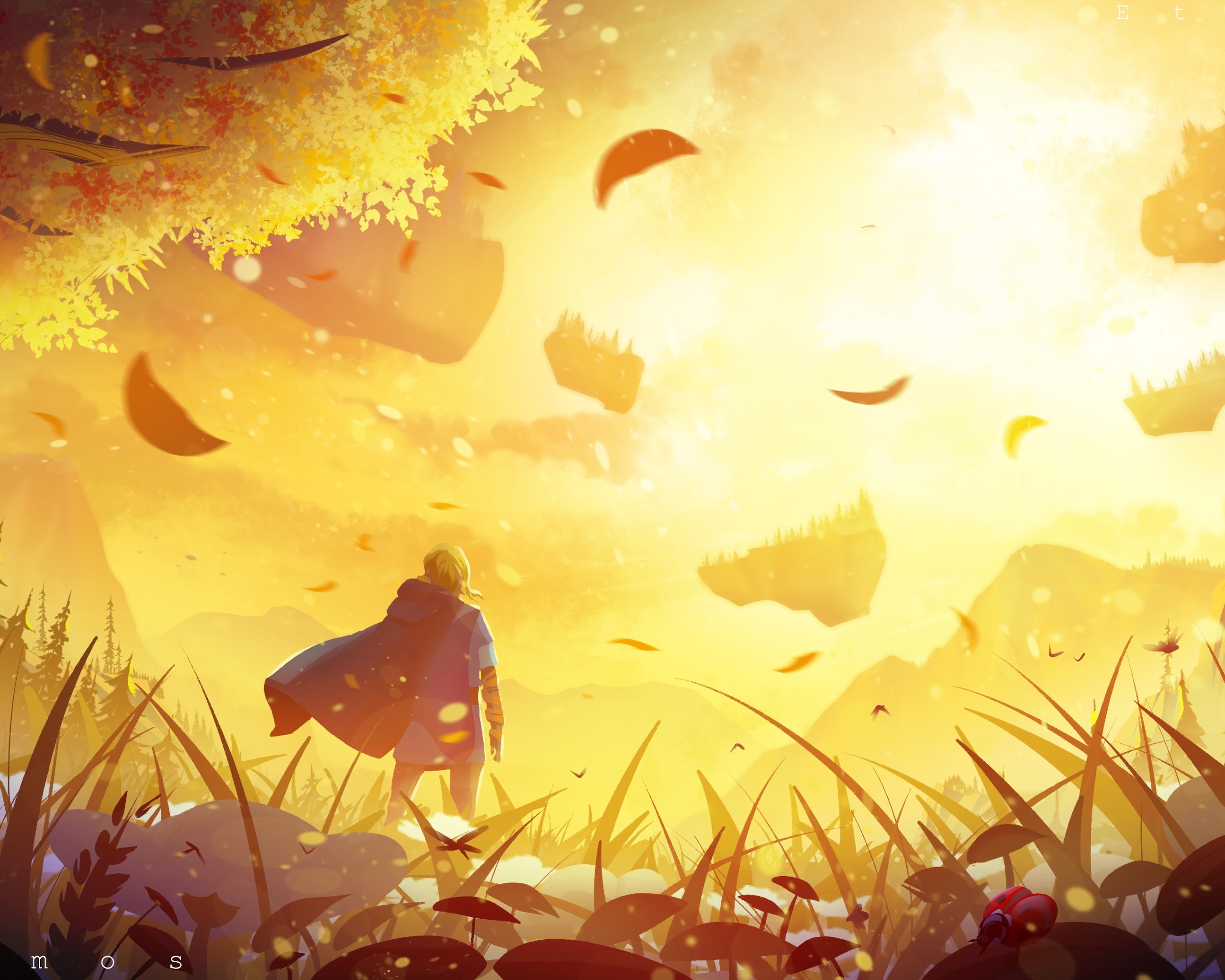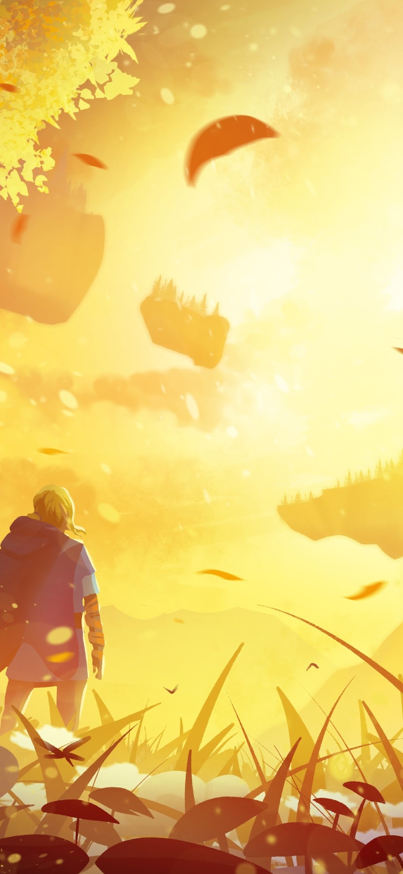 An adventurer wearing a blue cloak stands in a tall golden meadow looking at floating fantasy islands in intense sunlight.
