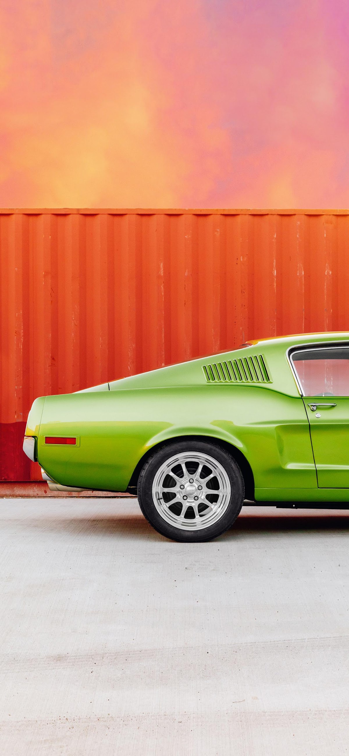 A classic lime green Ford Mustang Fastback sits parked against a vibrant orange shipping container under a colorful sunset sky with a clean industrial vibe.