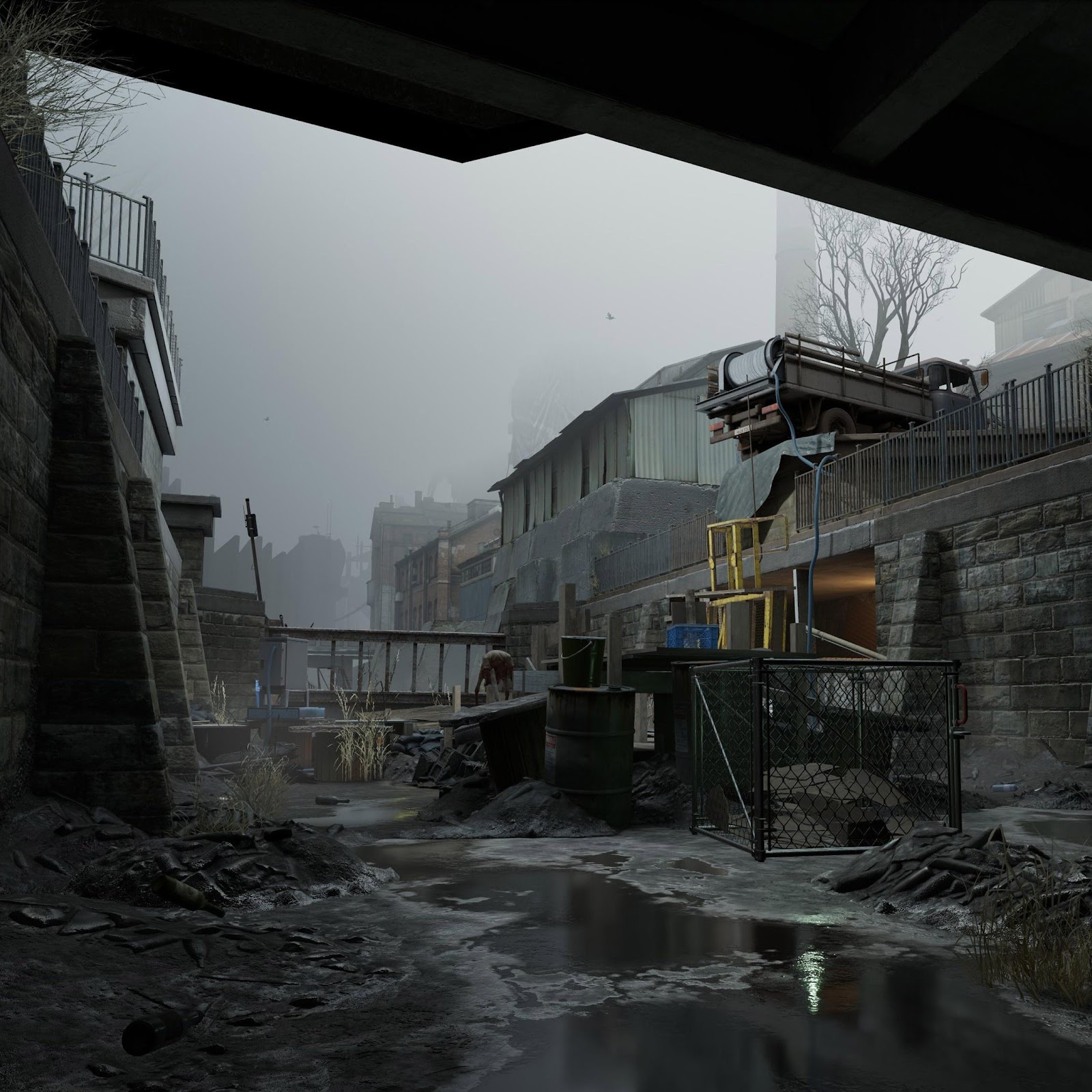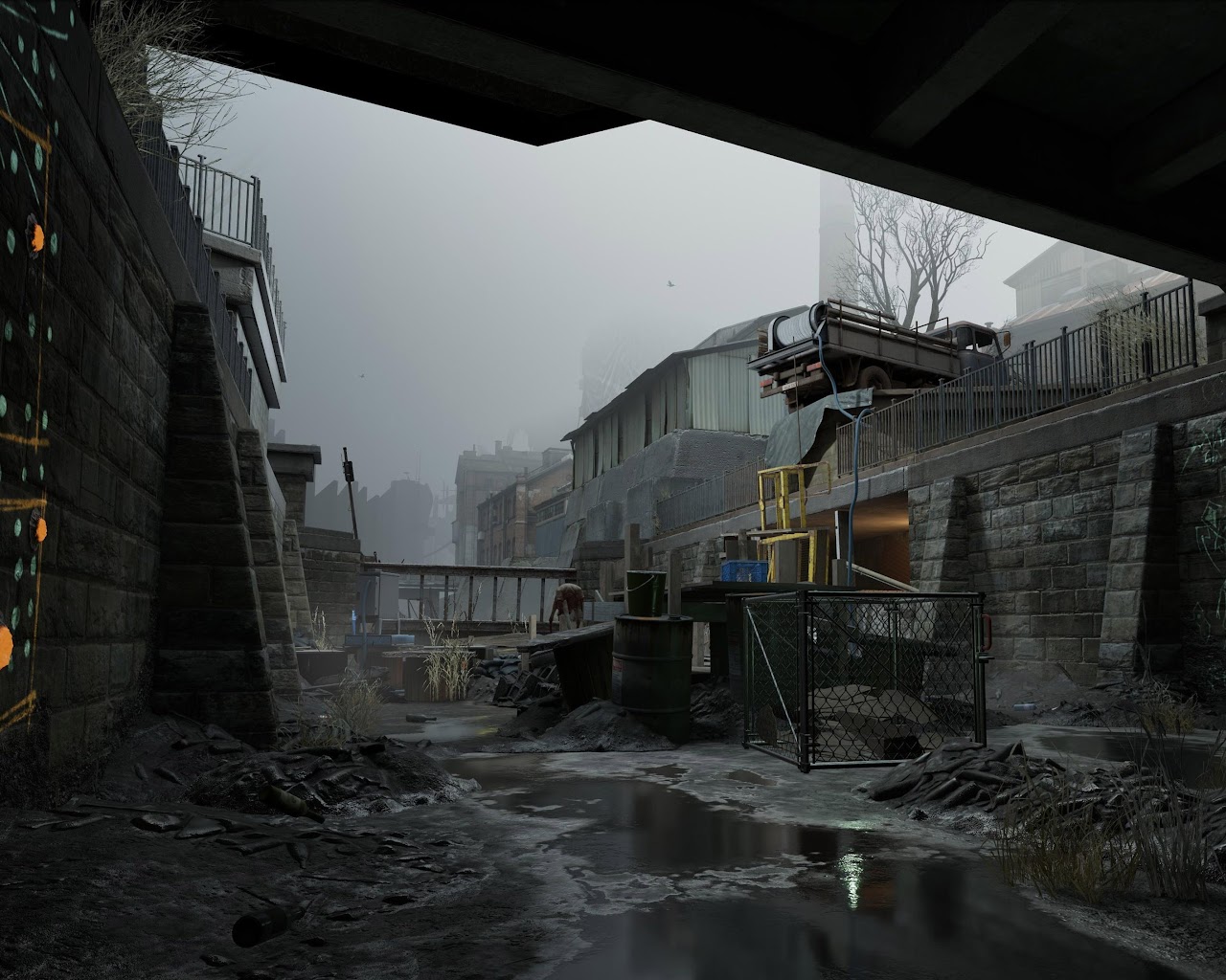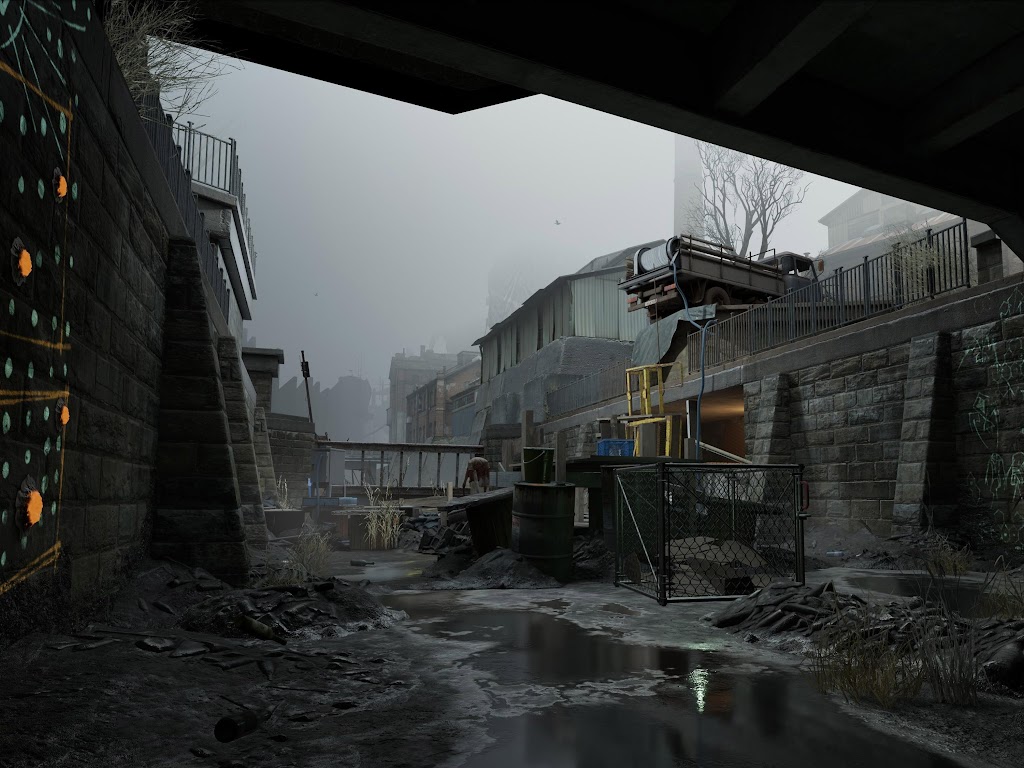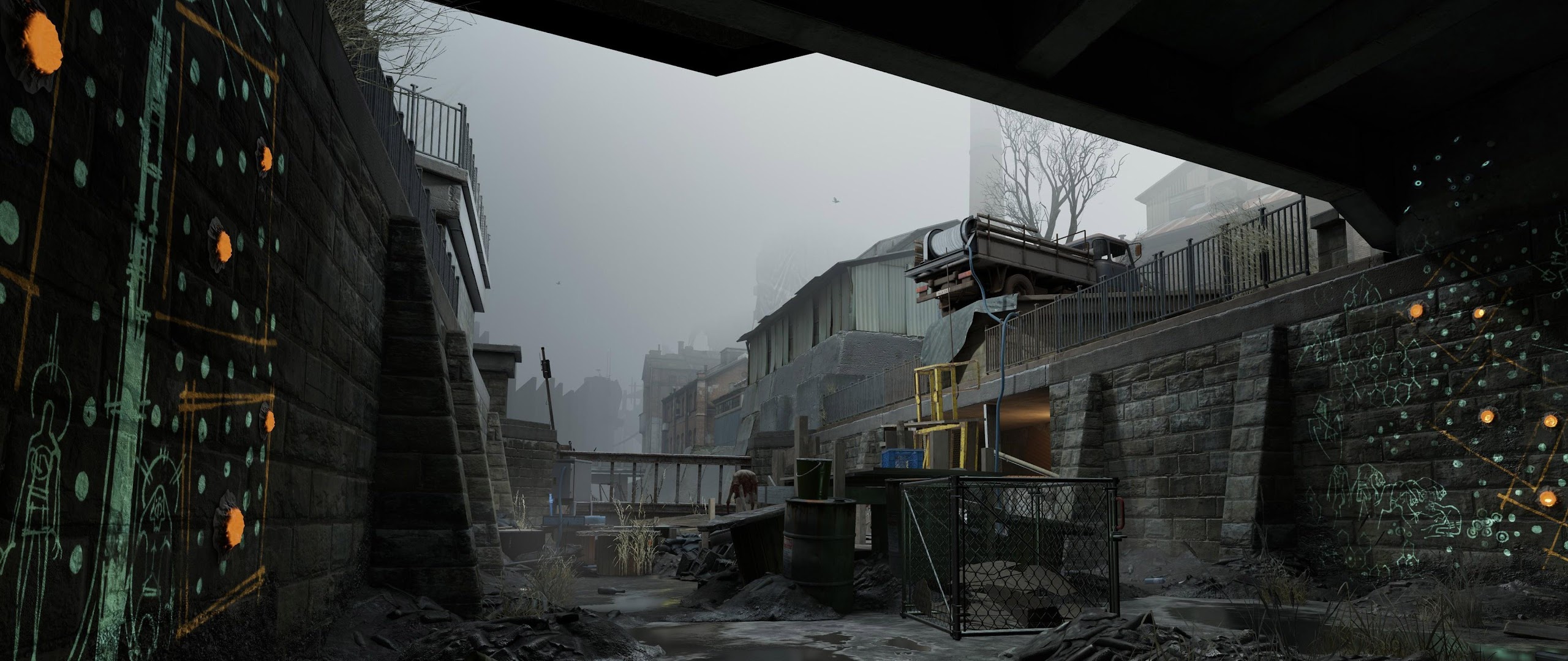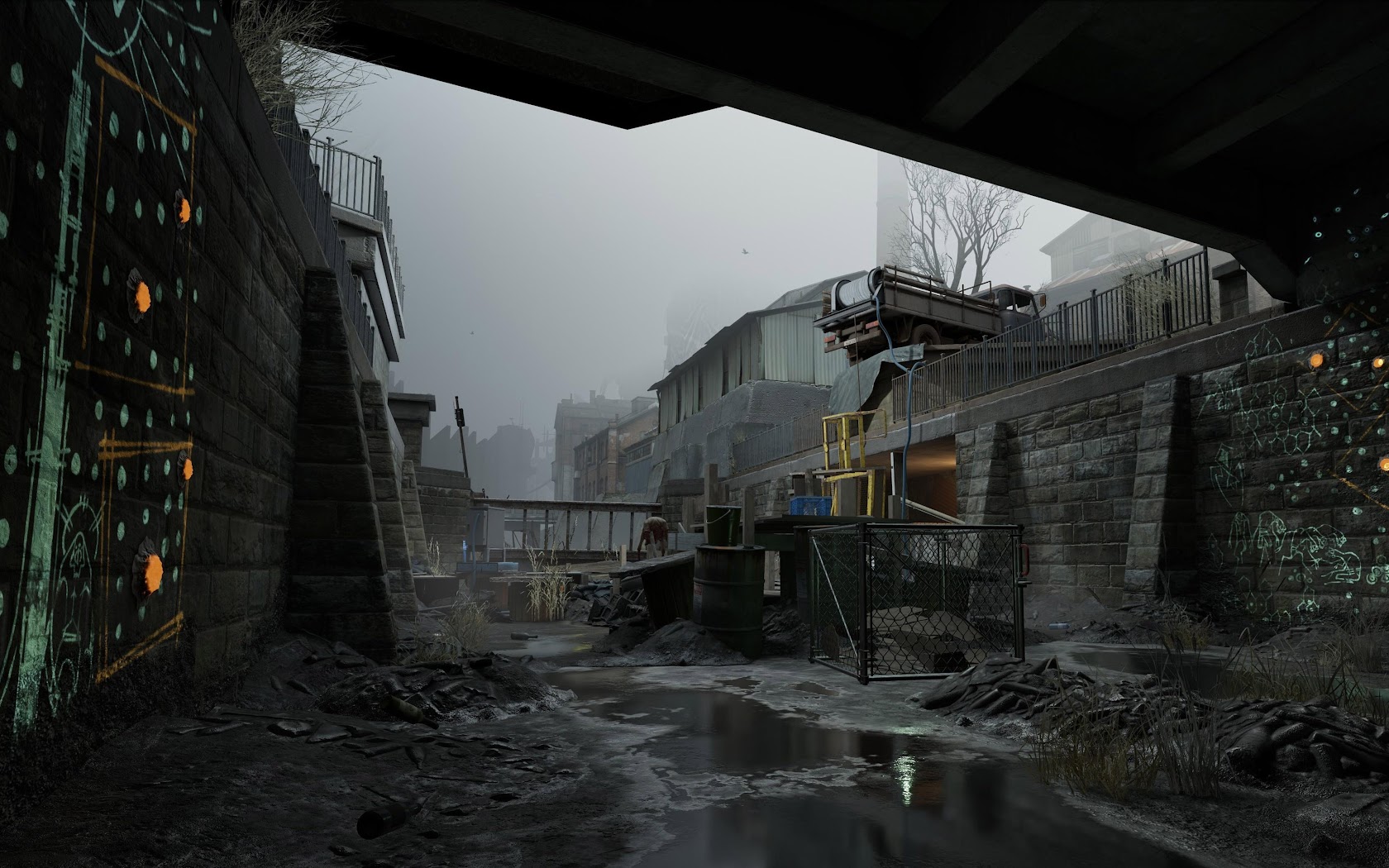 A gritty scene from Half-Life Alyx shows a flooded concrete canal under a dark bridge with glowing green graffiti and rubble under a foggy gray sky.