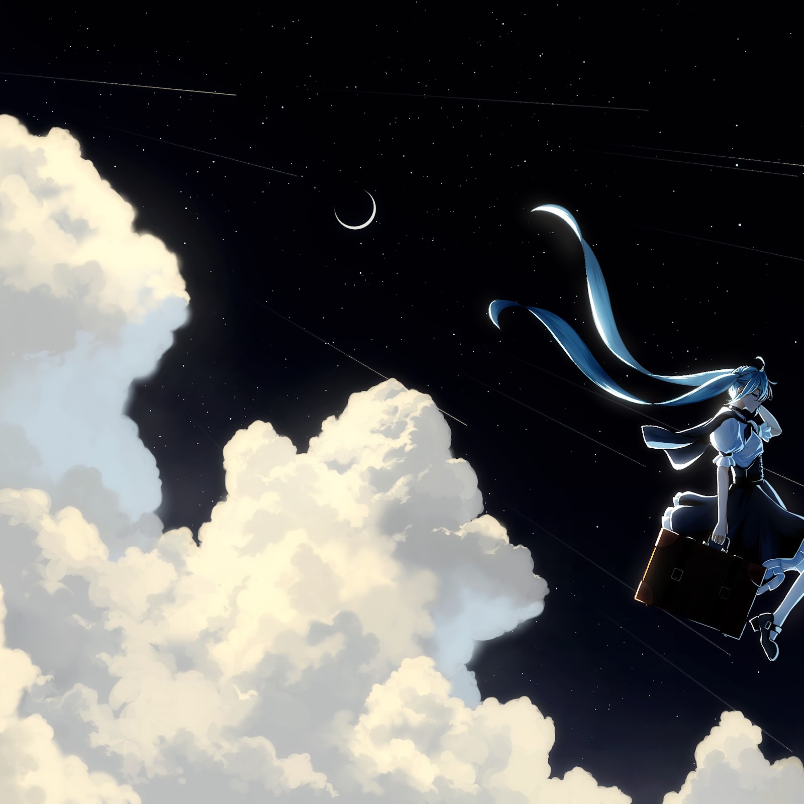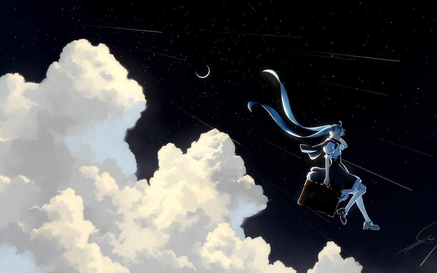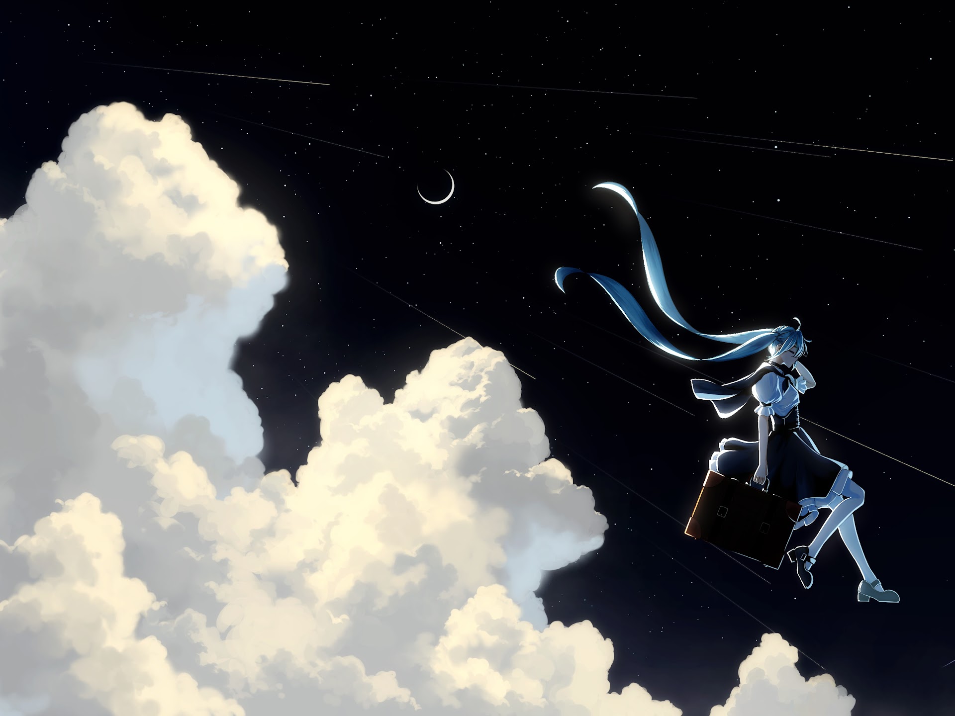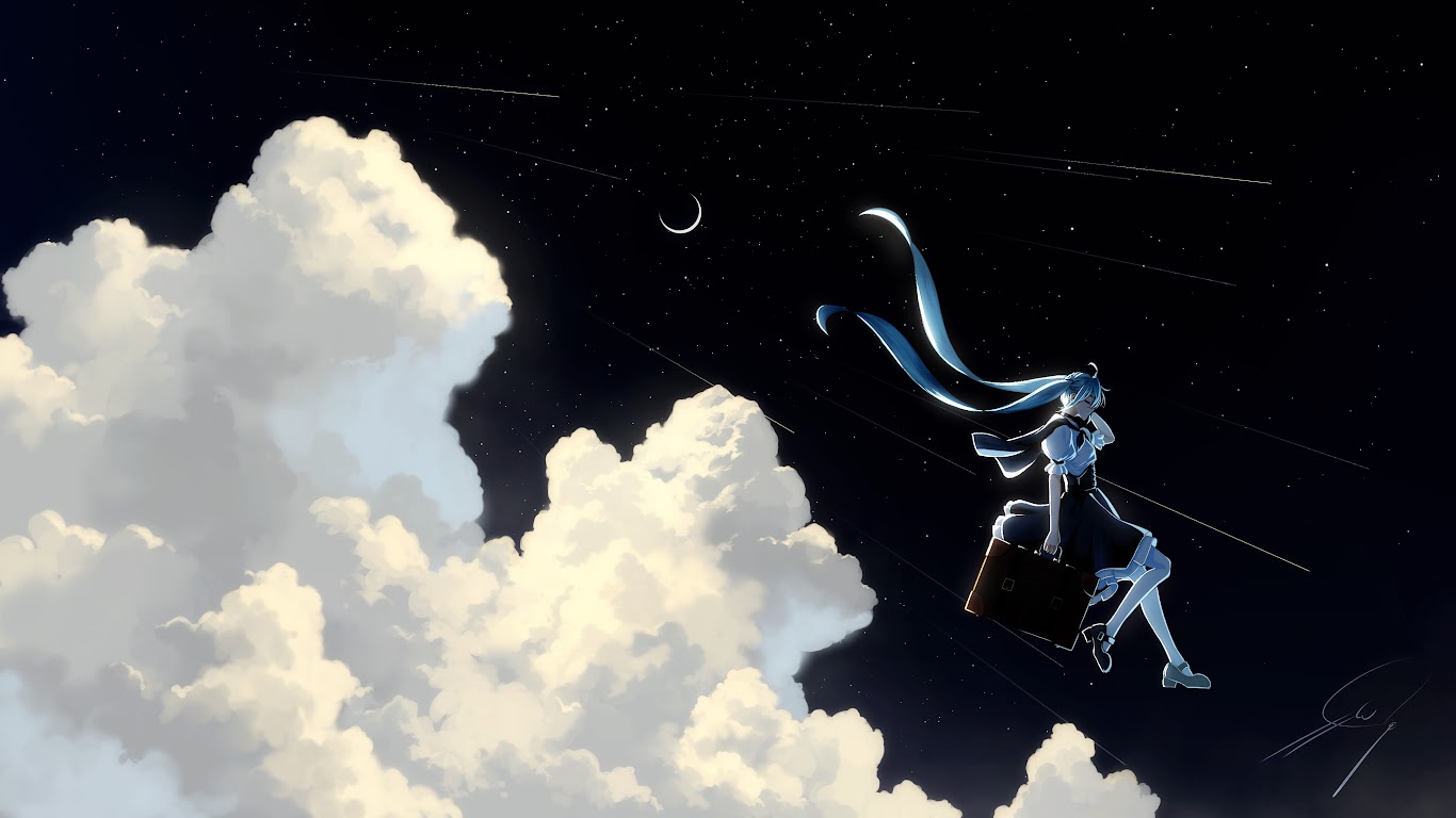 Hatsune Miku floats in the starry night sky holding a small suitcase with dramatic, brightly lit white clouds below her.