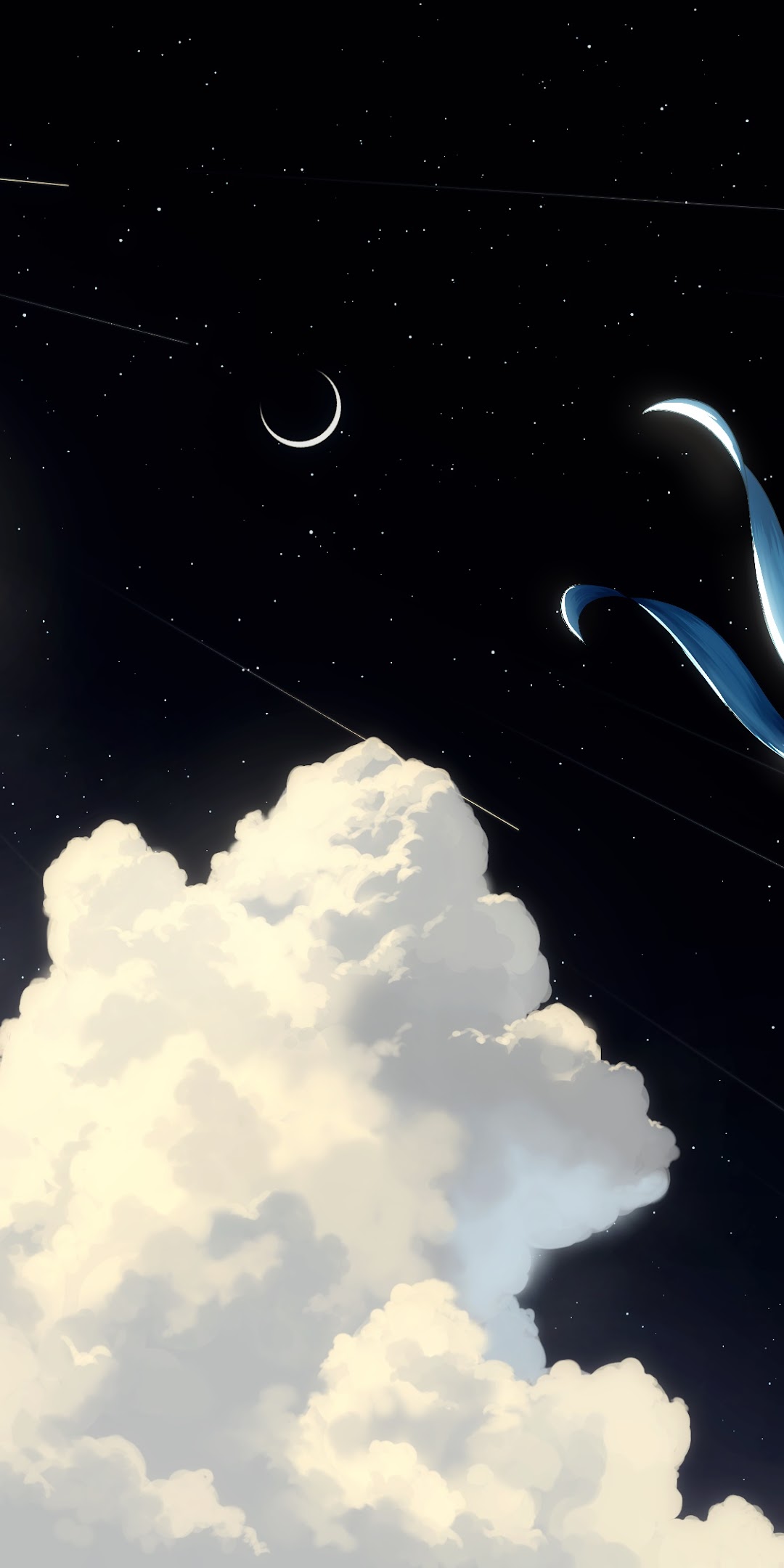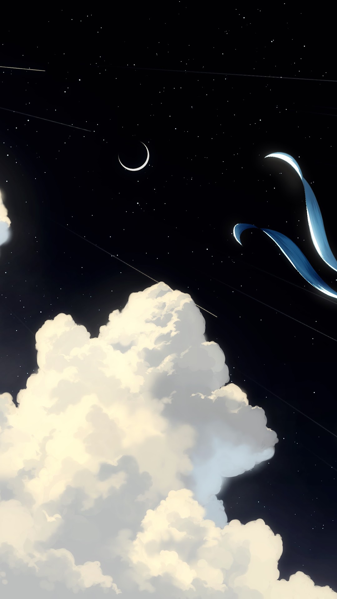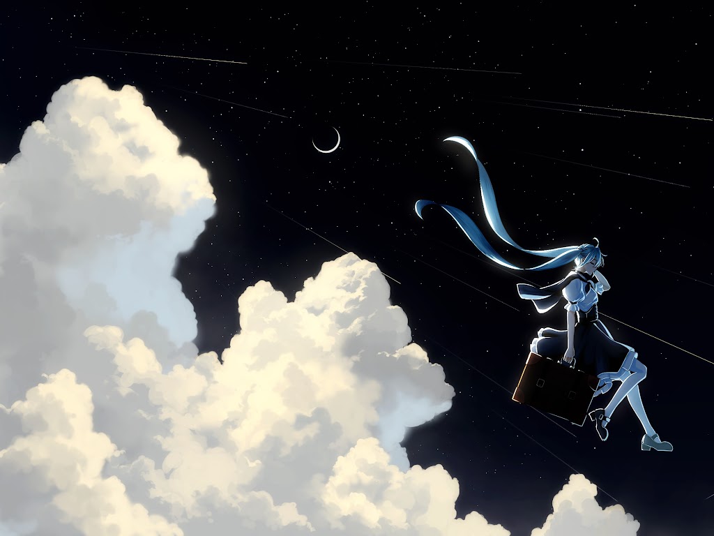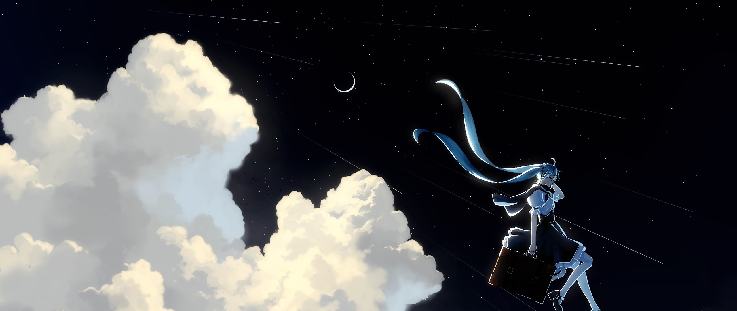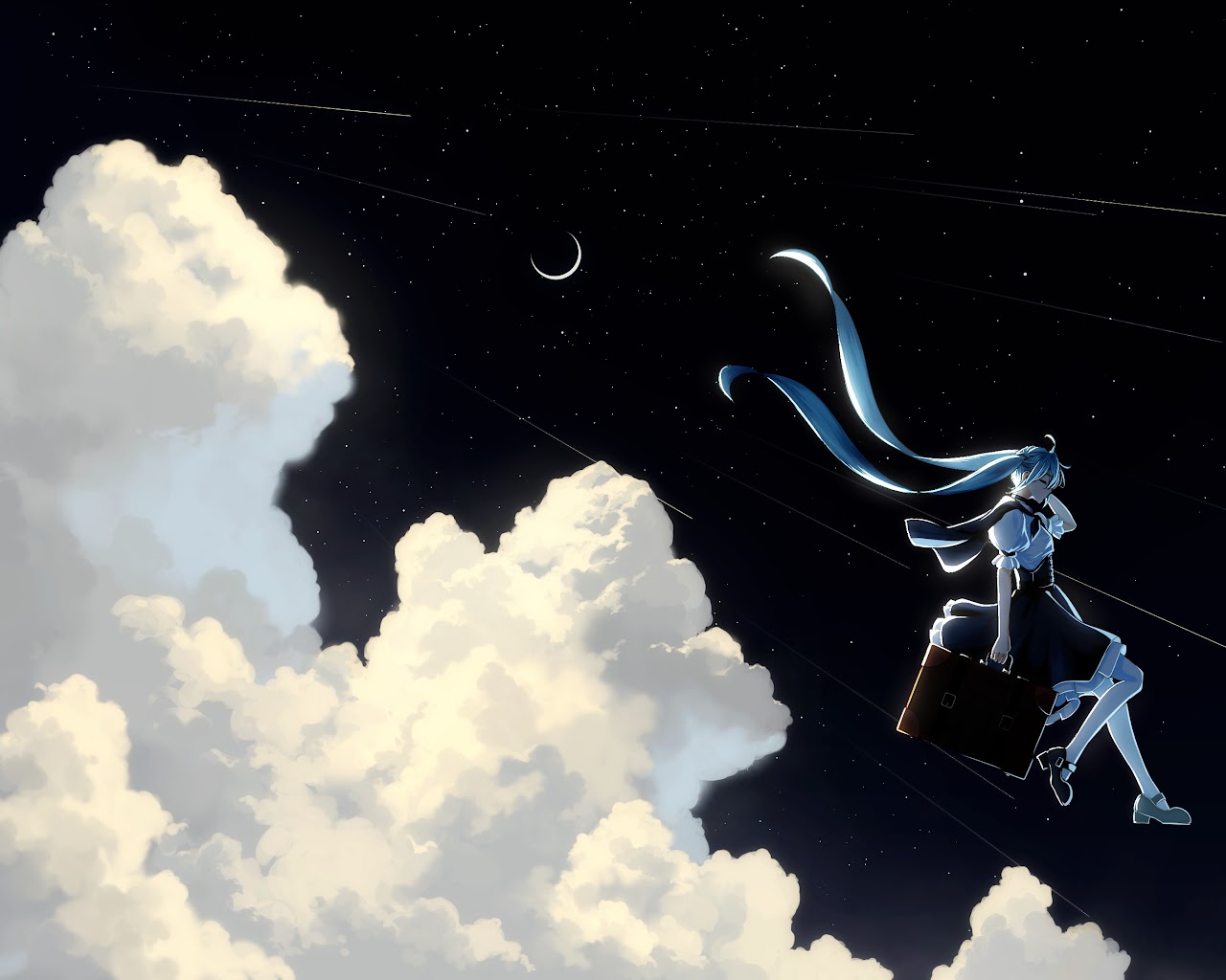 Hatsune Miku floats in the starry night sky holding a small suitcase with dramatic, brightly lit white clouds below her.
