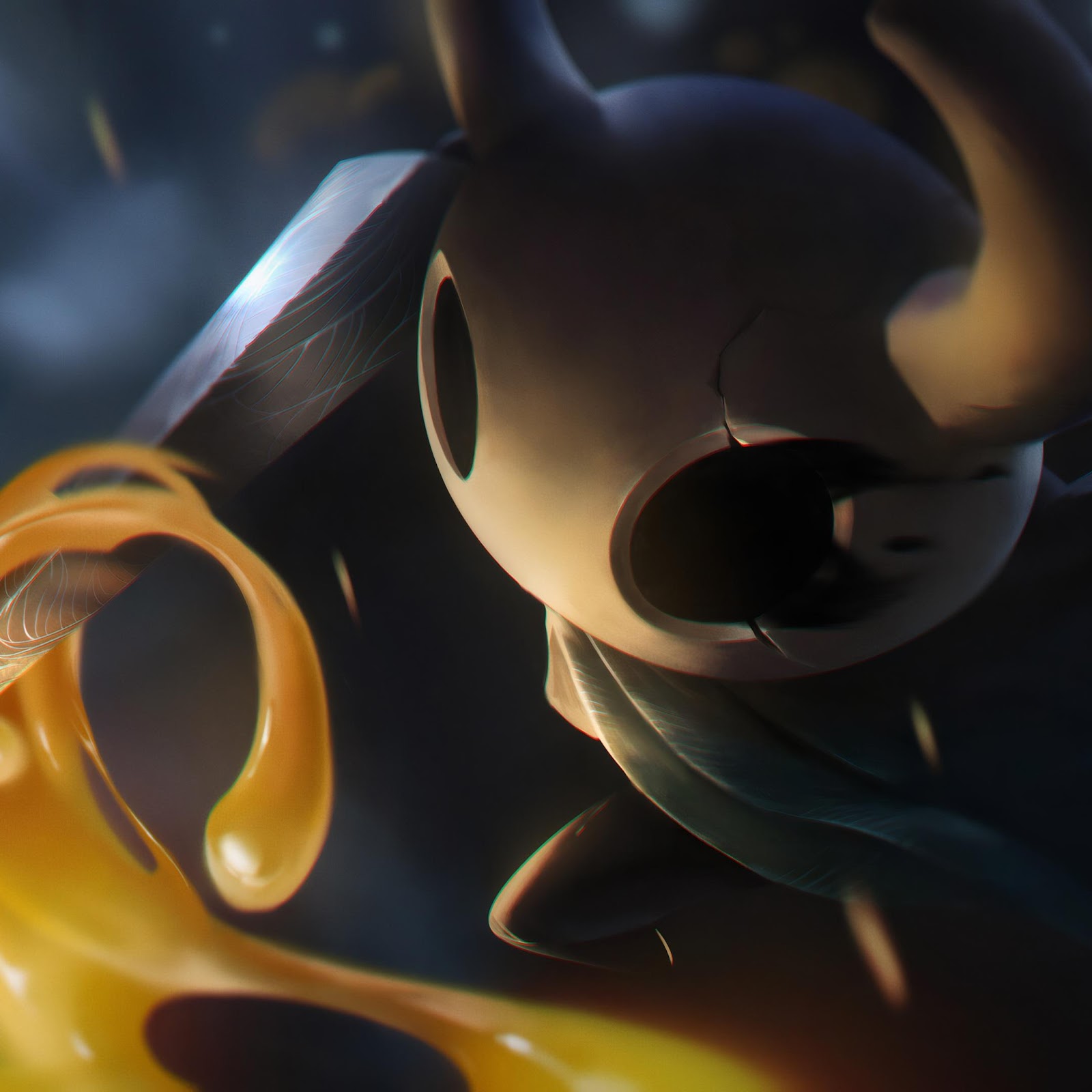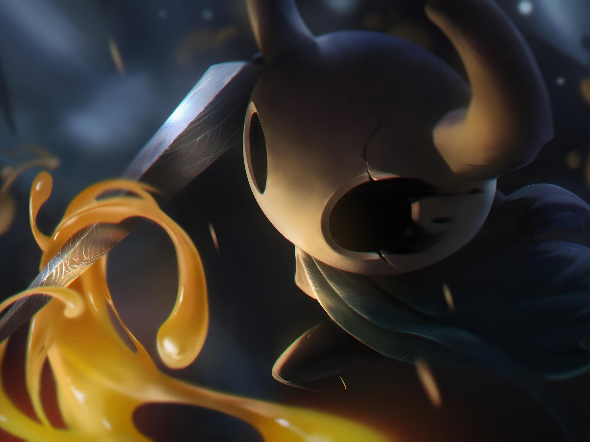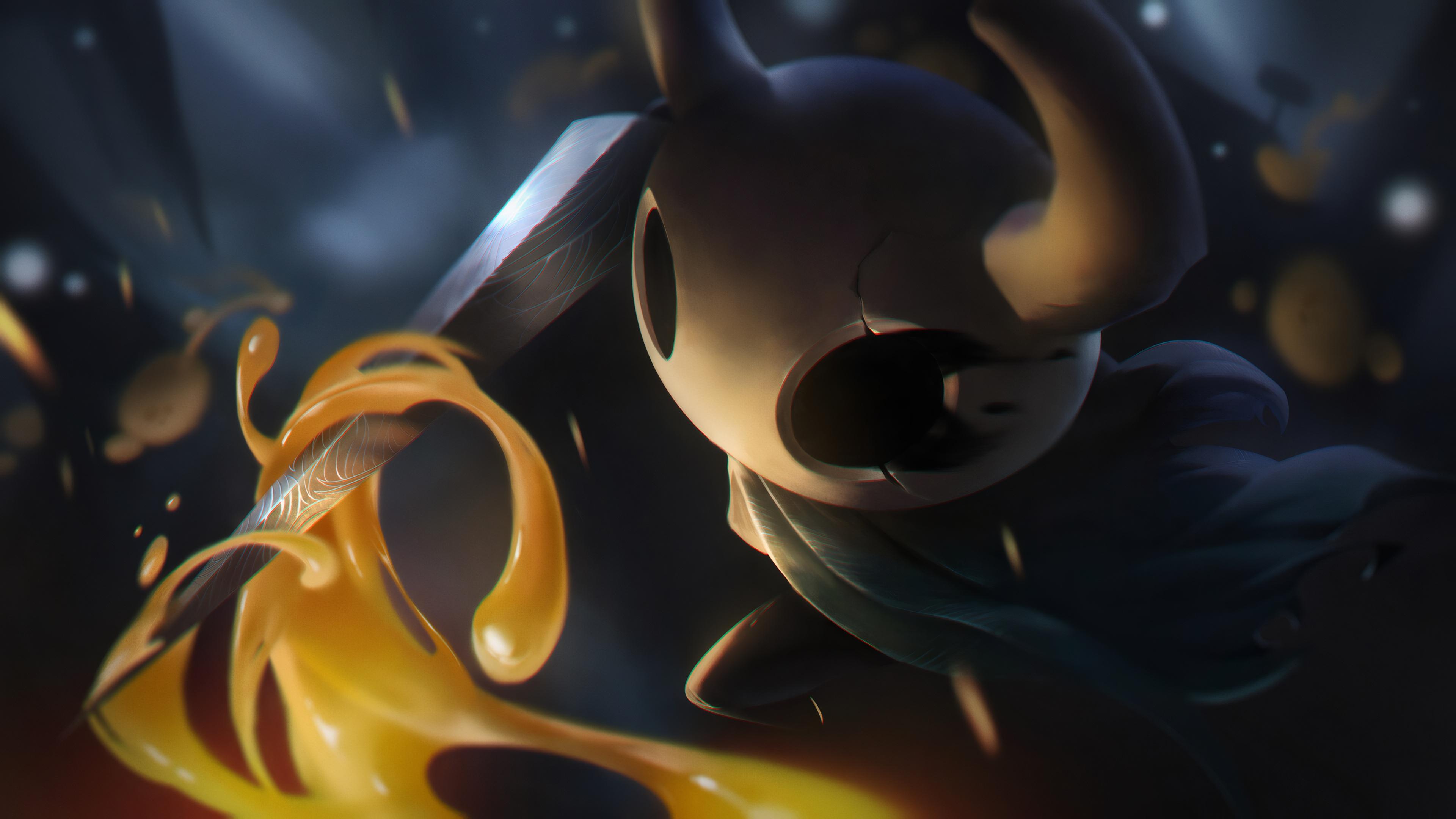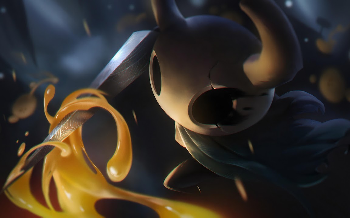 The Knight from Hollow Knight swings a sharp nail through glowing orange liquid in a dark cave with a cinematic digital art style.