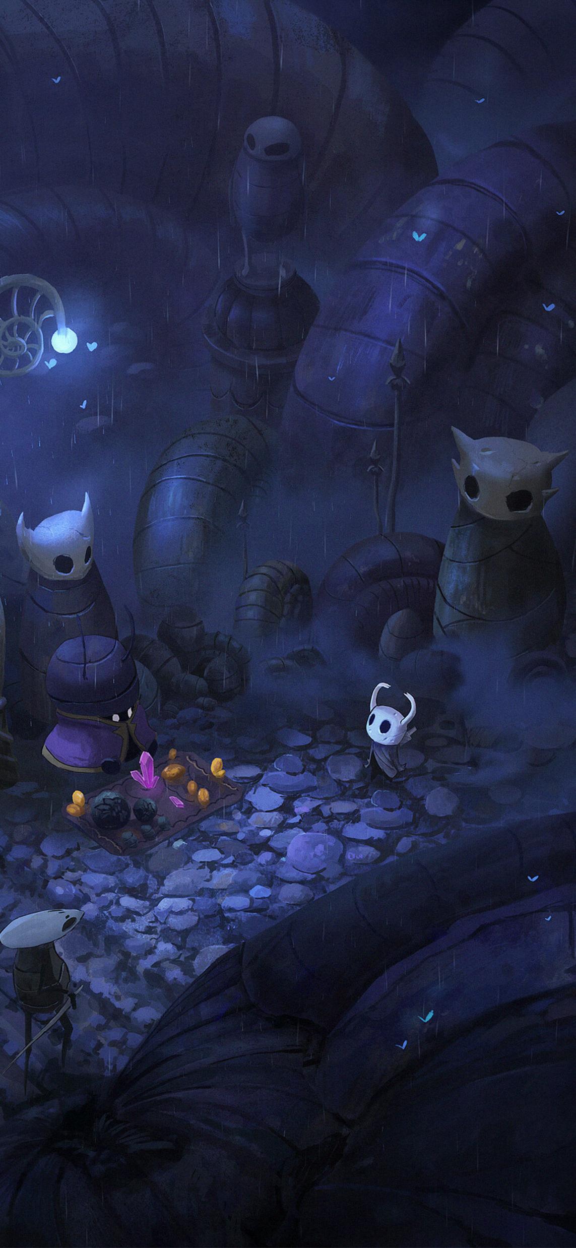 Hollow Knight Rainy Merchant Den Full HD iPhone Wallpaper The Knight from Hollow Knight stands next to a merchant character selling glowing items in a dark, rain-filled underground den. aj452 300.01 KB 1143x2476 Download original File Size: Dimensions: Resolution: Full HD Format: Mobile ID: Blue Fantasy Illustration Hollow Knight Rainy Setting Sly The Knight Video Game Art