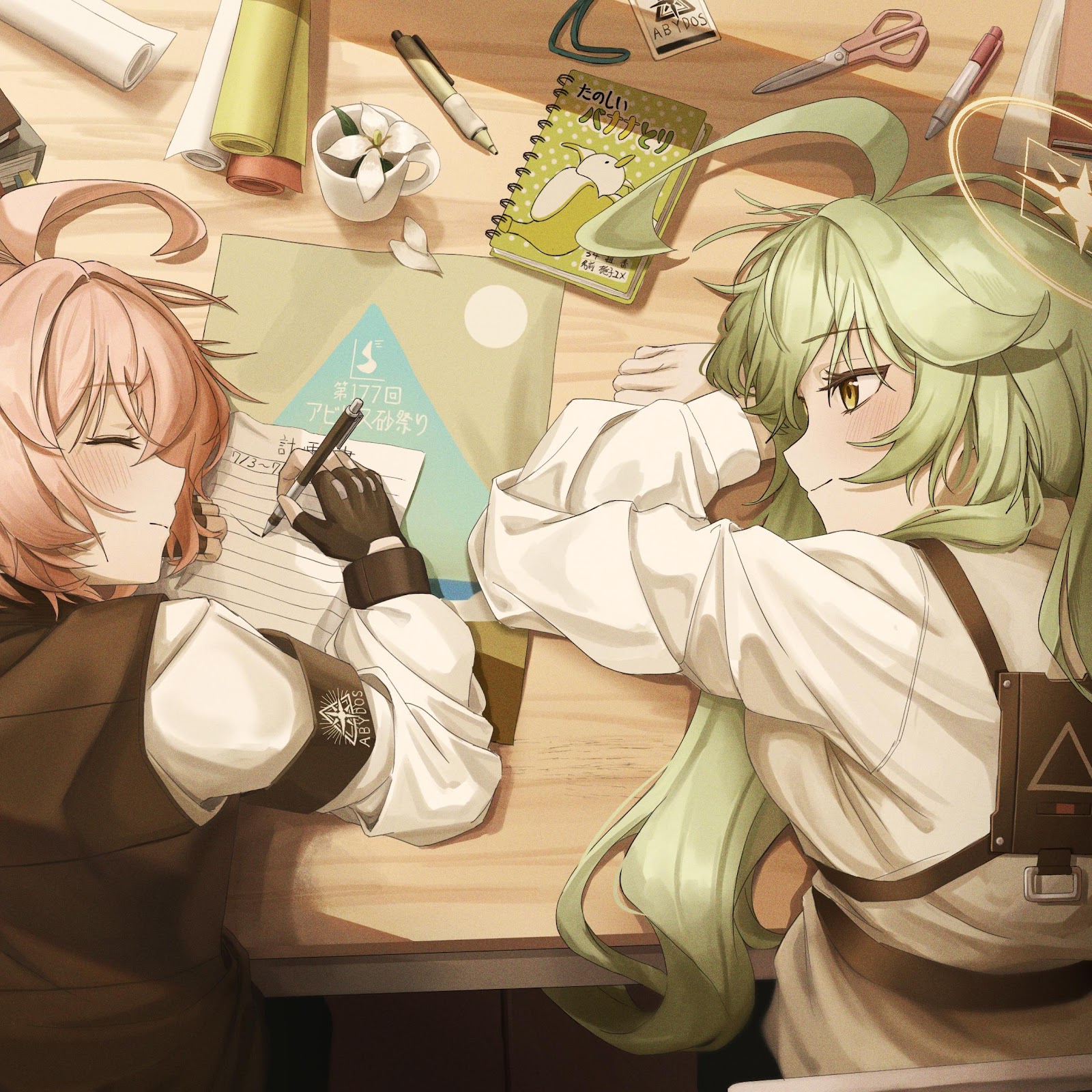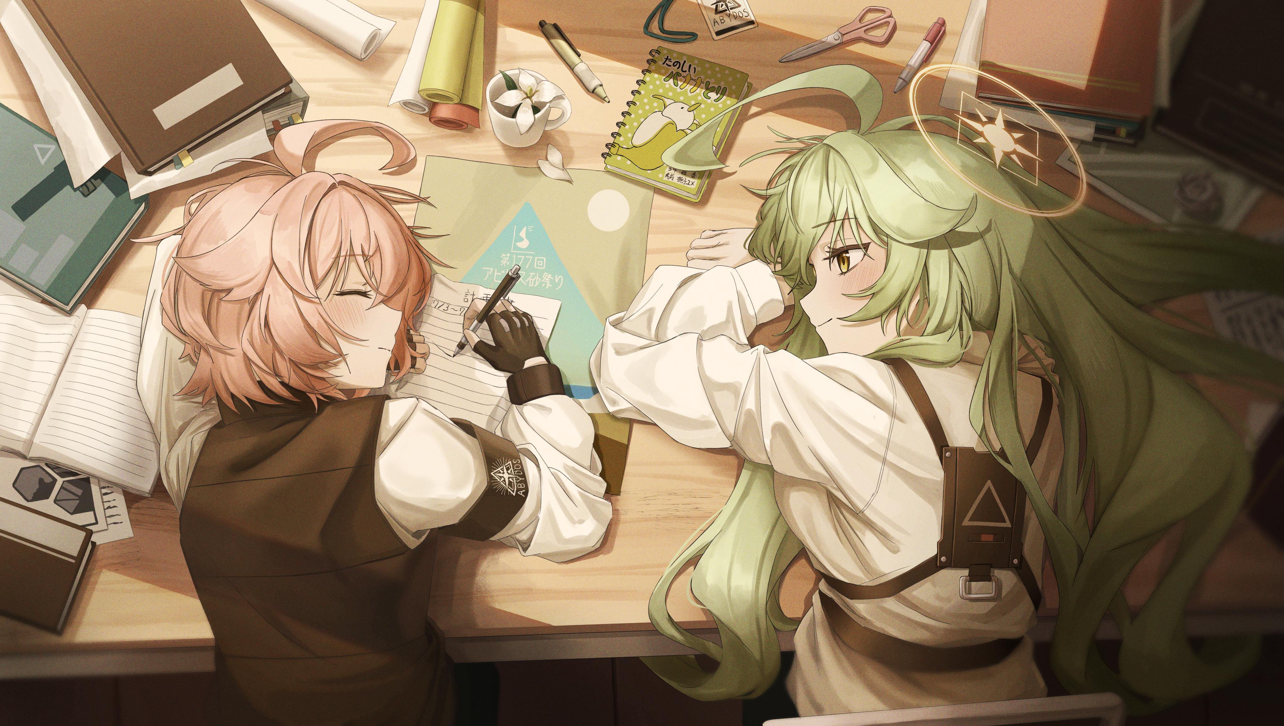 Hoshino and Nonomi from Blue Archive rest together at a cluttered school desk with papers and stationery while sharing a cozy moment in this warm digital art.