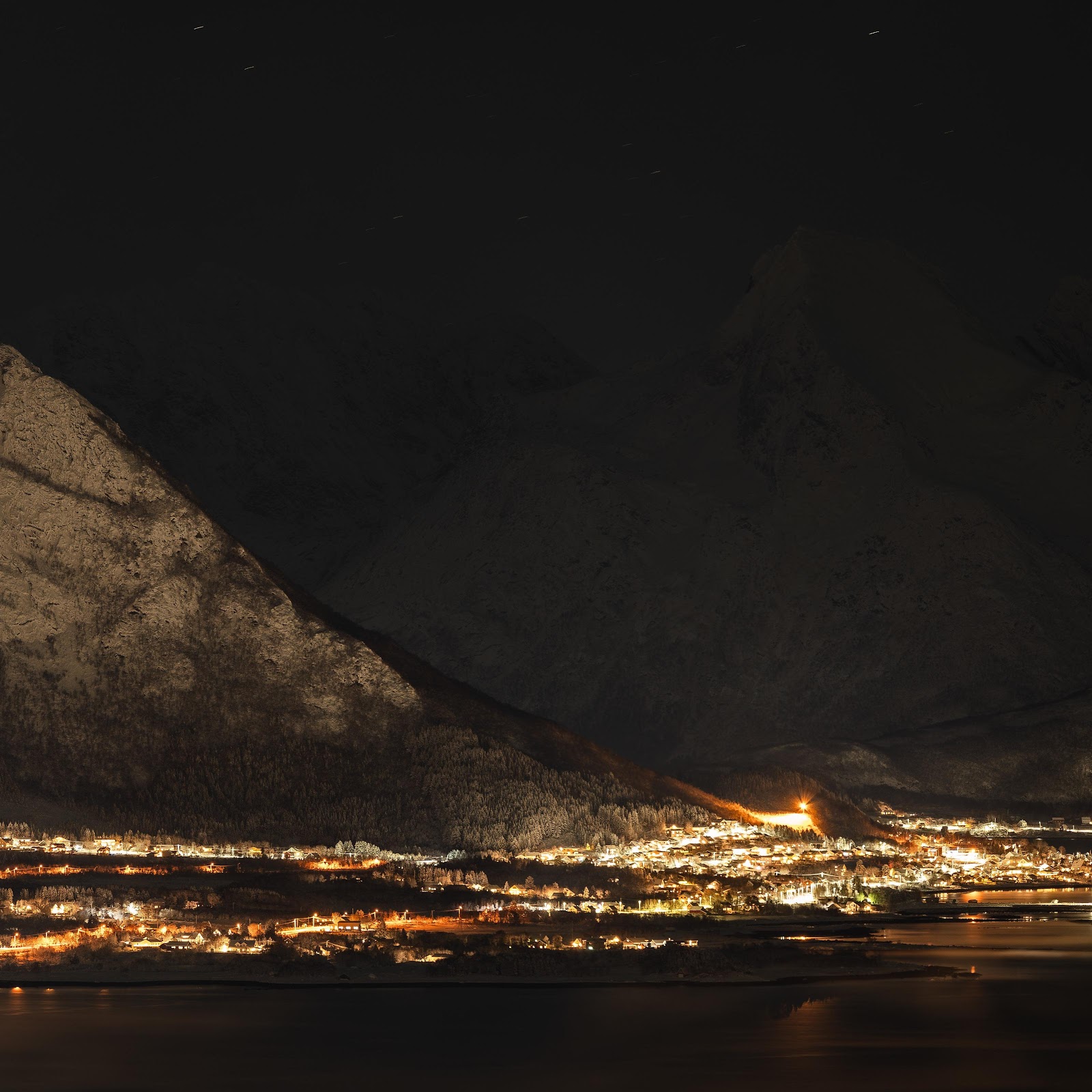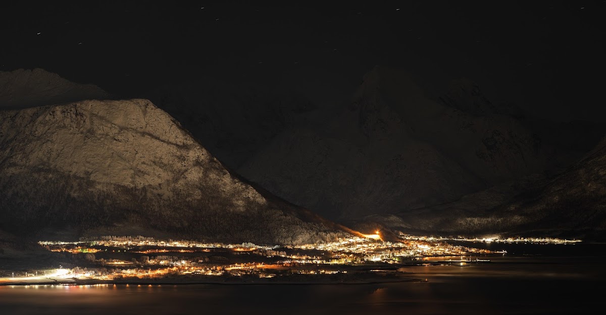 A glowing village sits nestled beneath large snow-covered mountains, showing a warm light against the cold darkness.