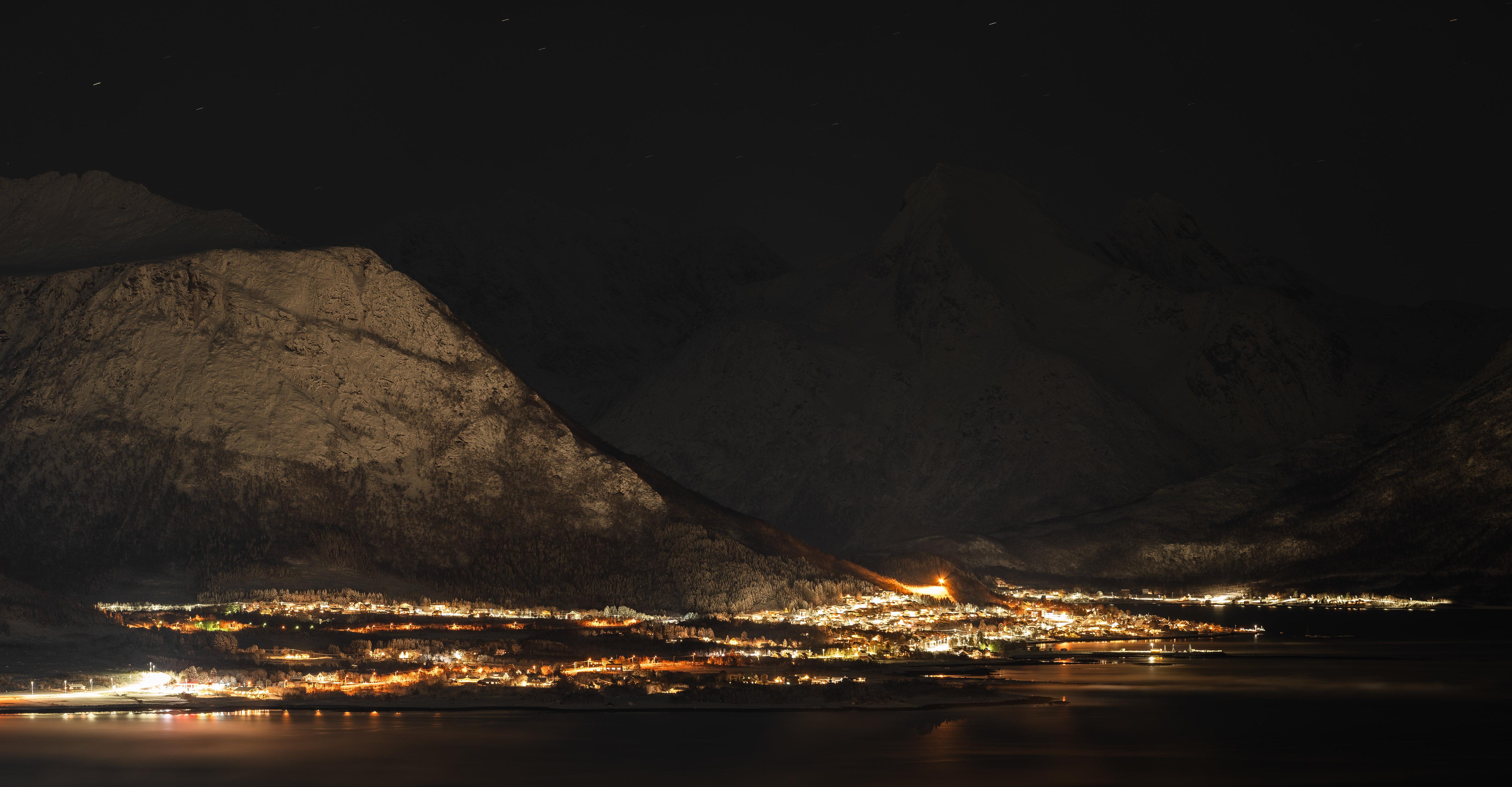 Illuminated Mountain Village At Night 5K Desktop Wallpaper