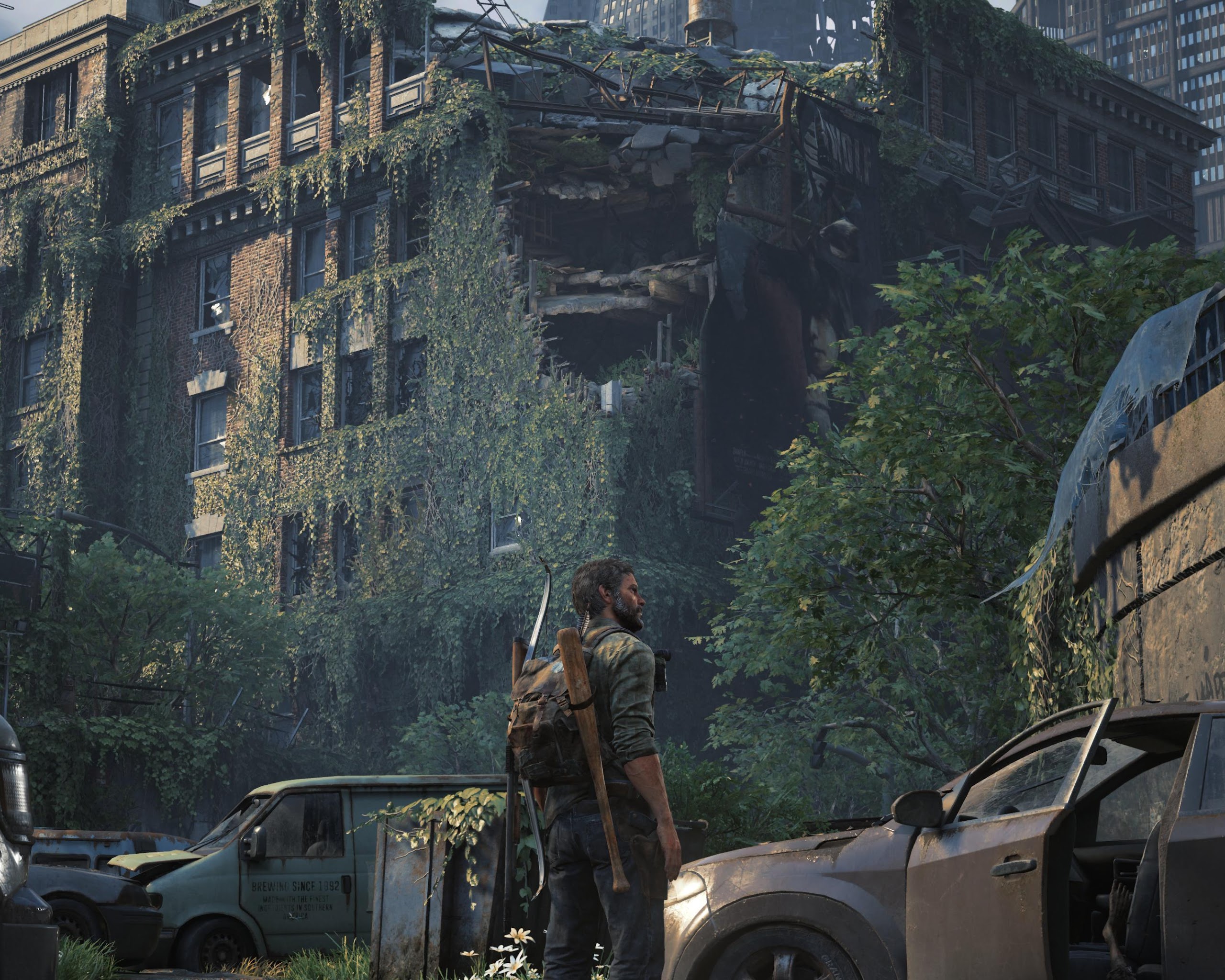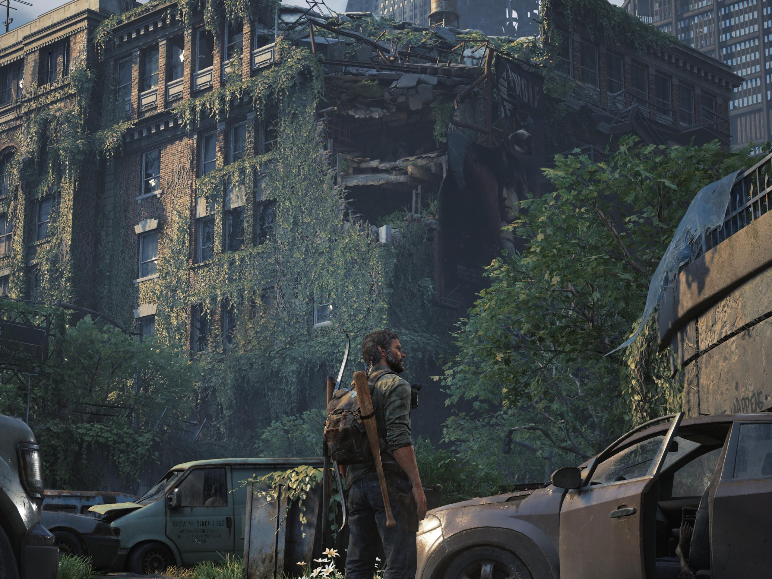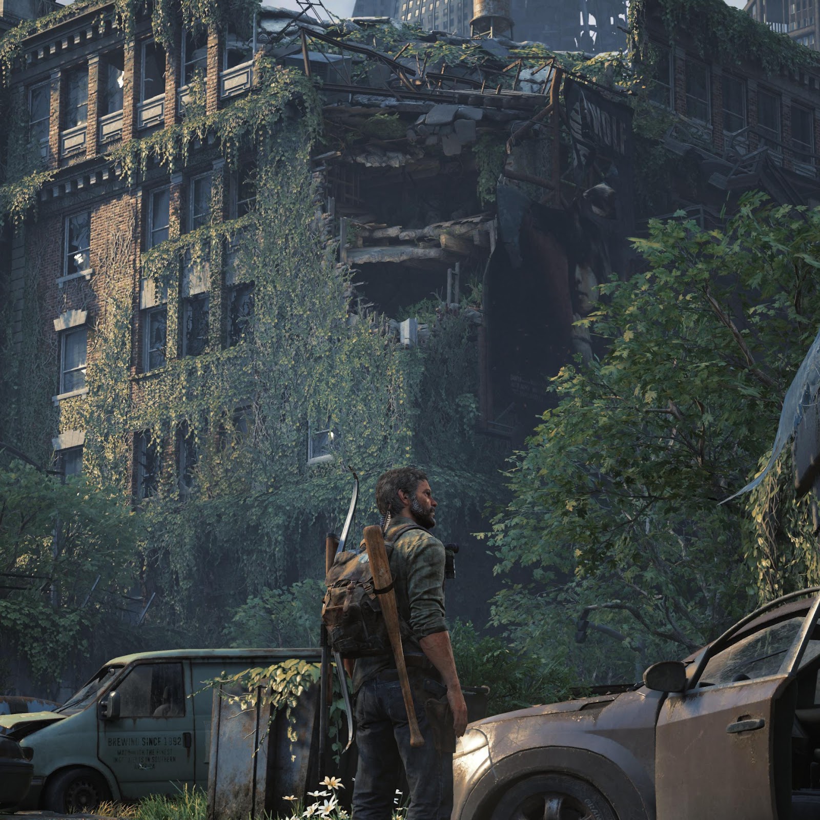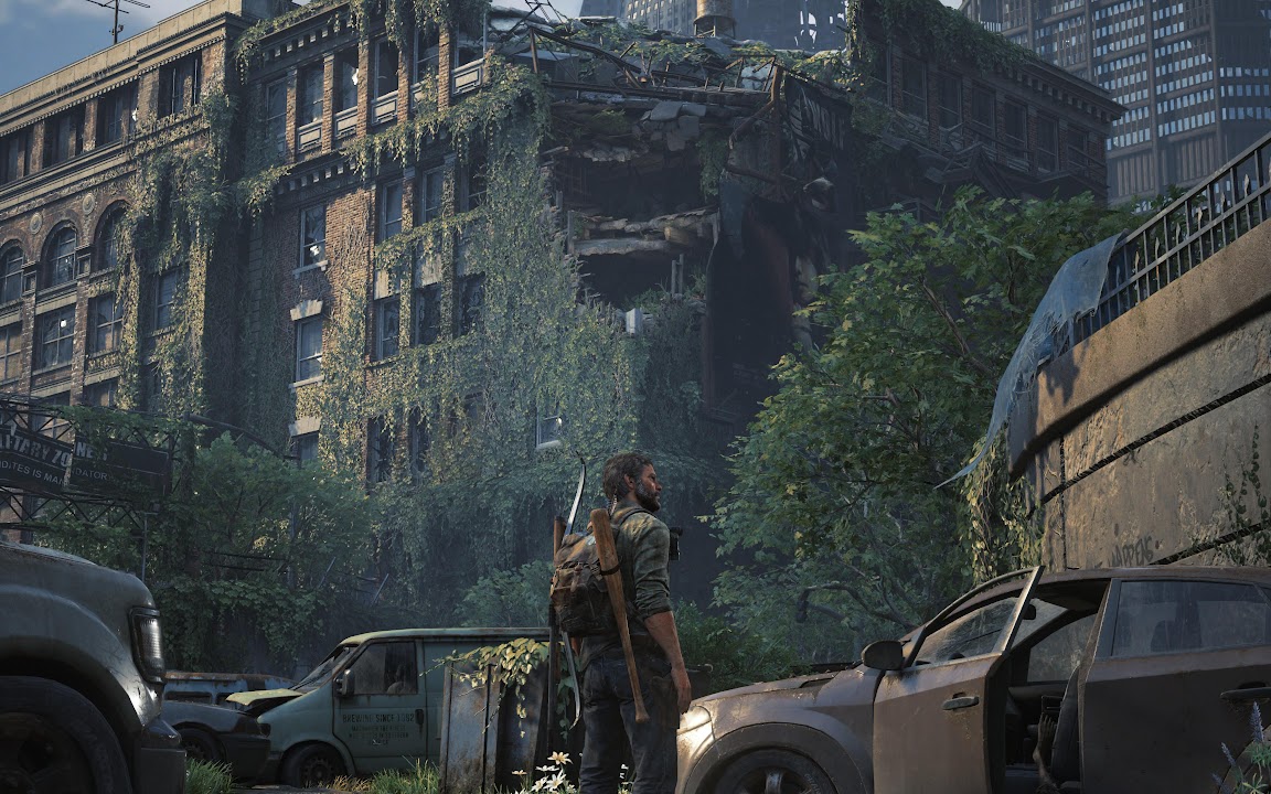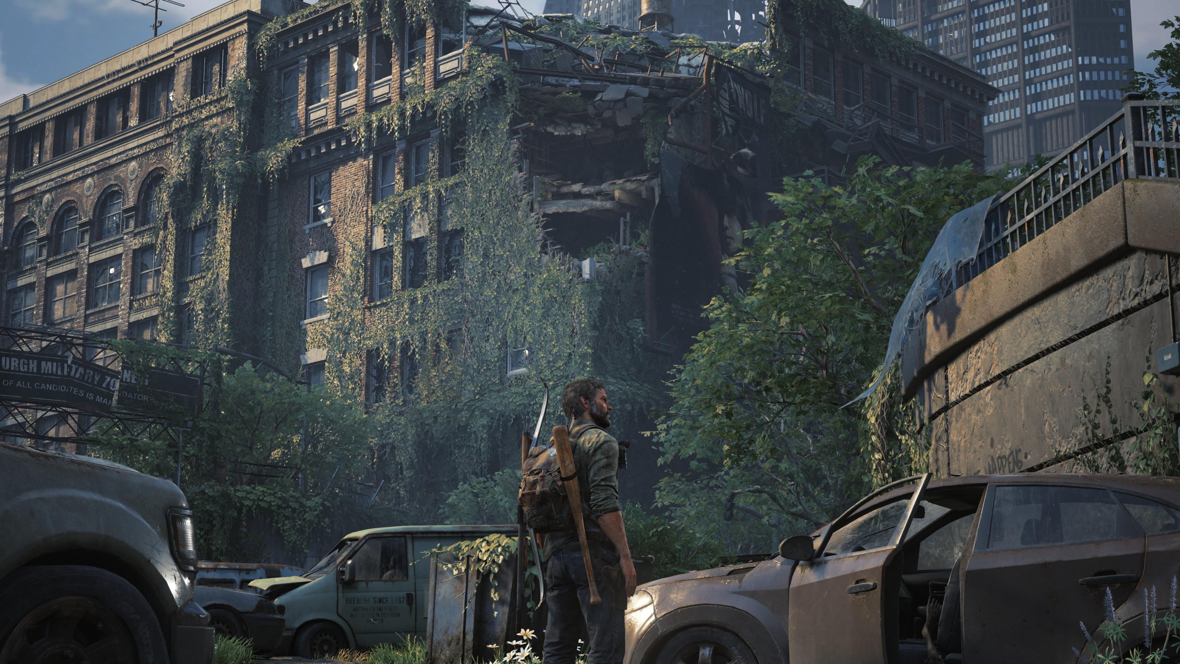 Joel from The Last of Us Part I stands in a ruined city street covered in thick green vines next to abandoned cars and destroyed brick buildings.