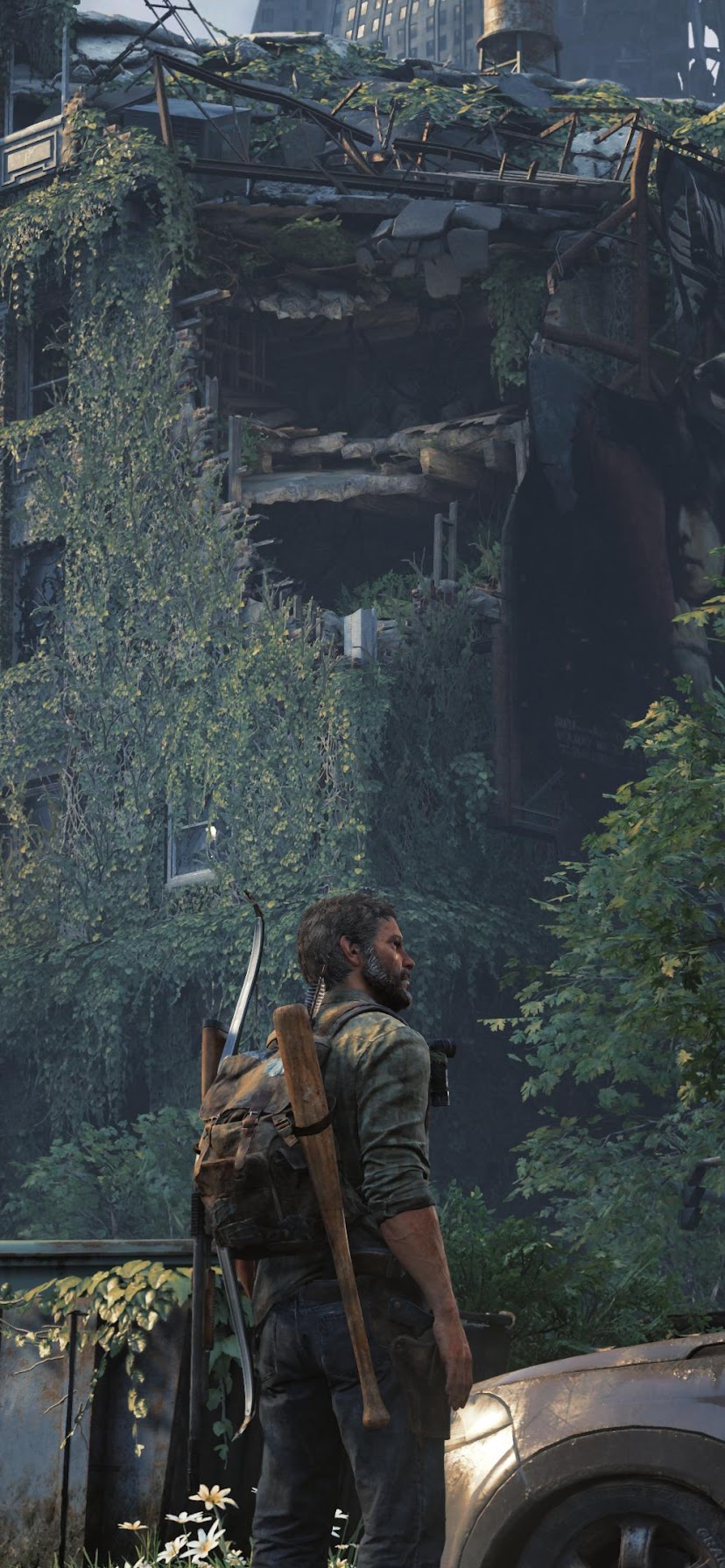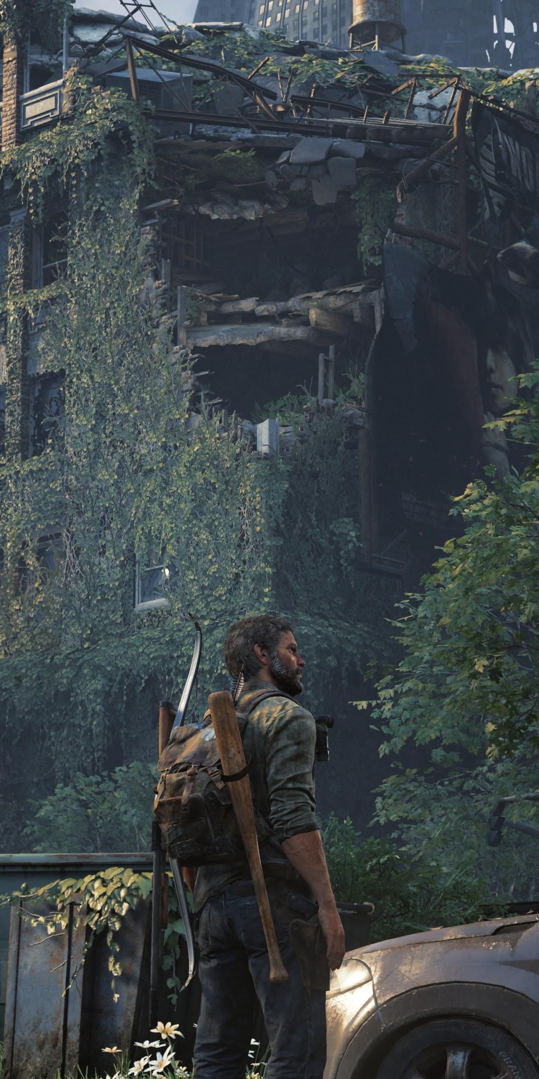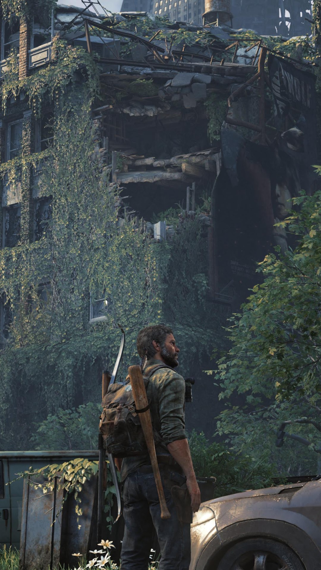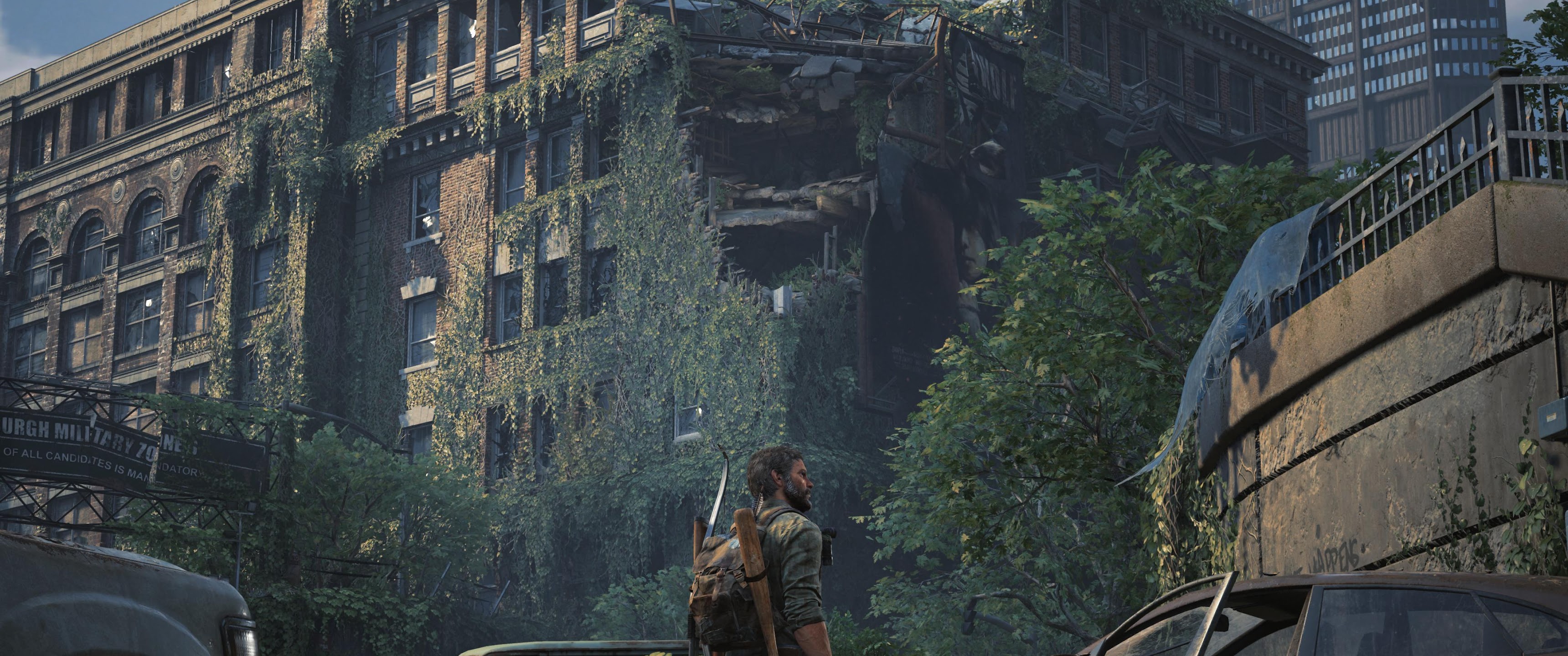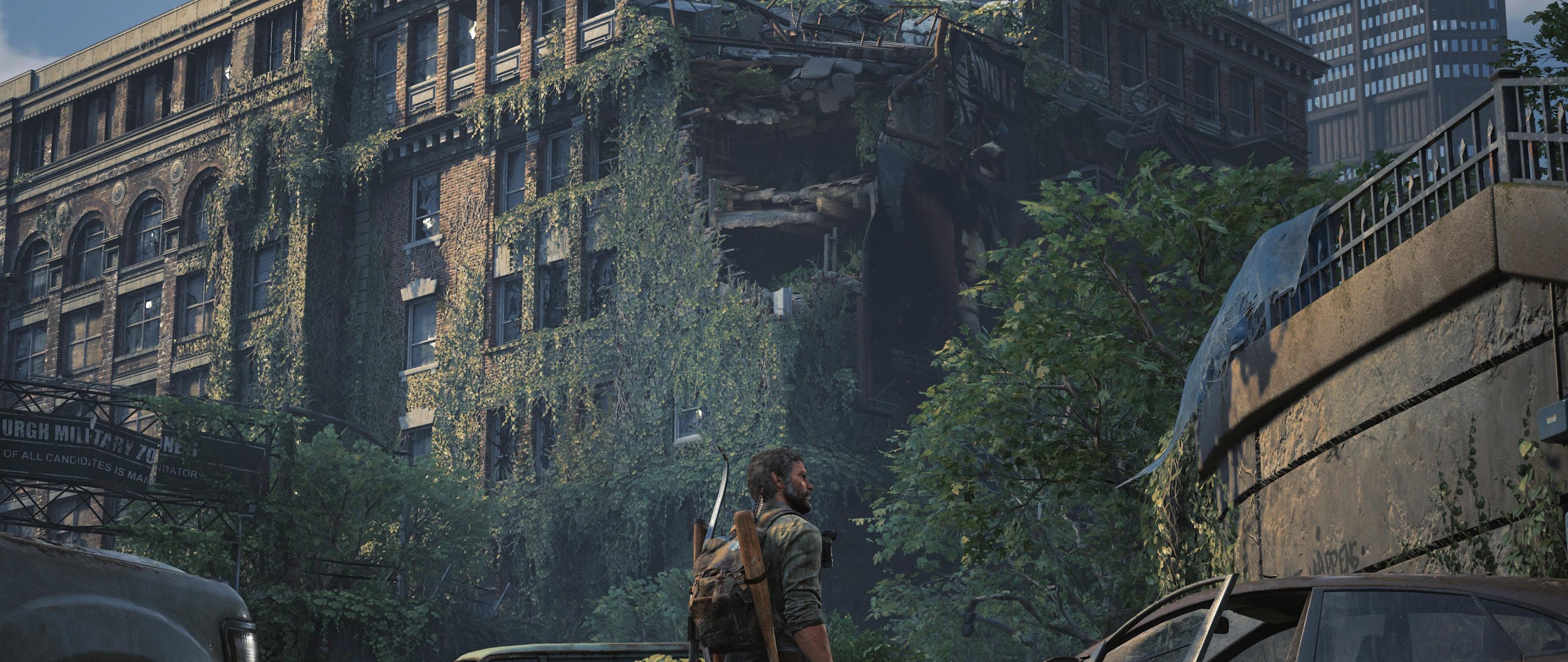 Joel from The Last of Us Part I stands in a ruined city street covered in thick green vines next to abandoned cars and destroyed brick buildings.