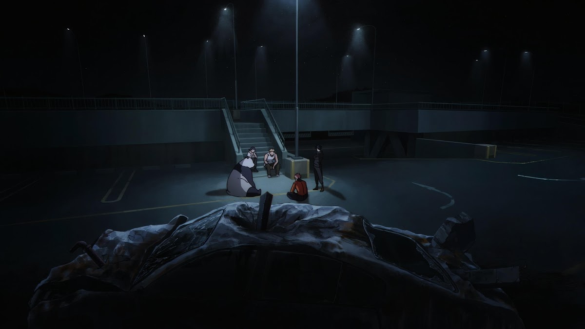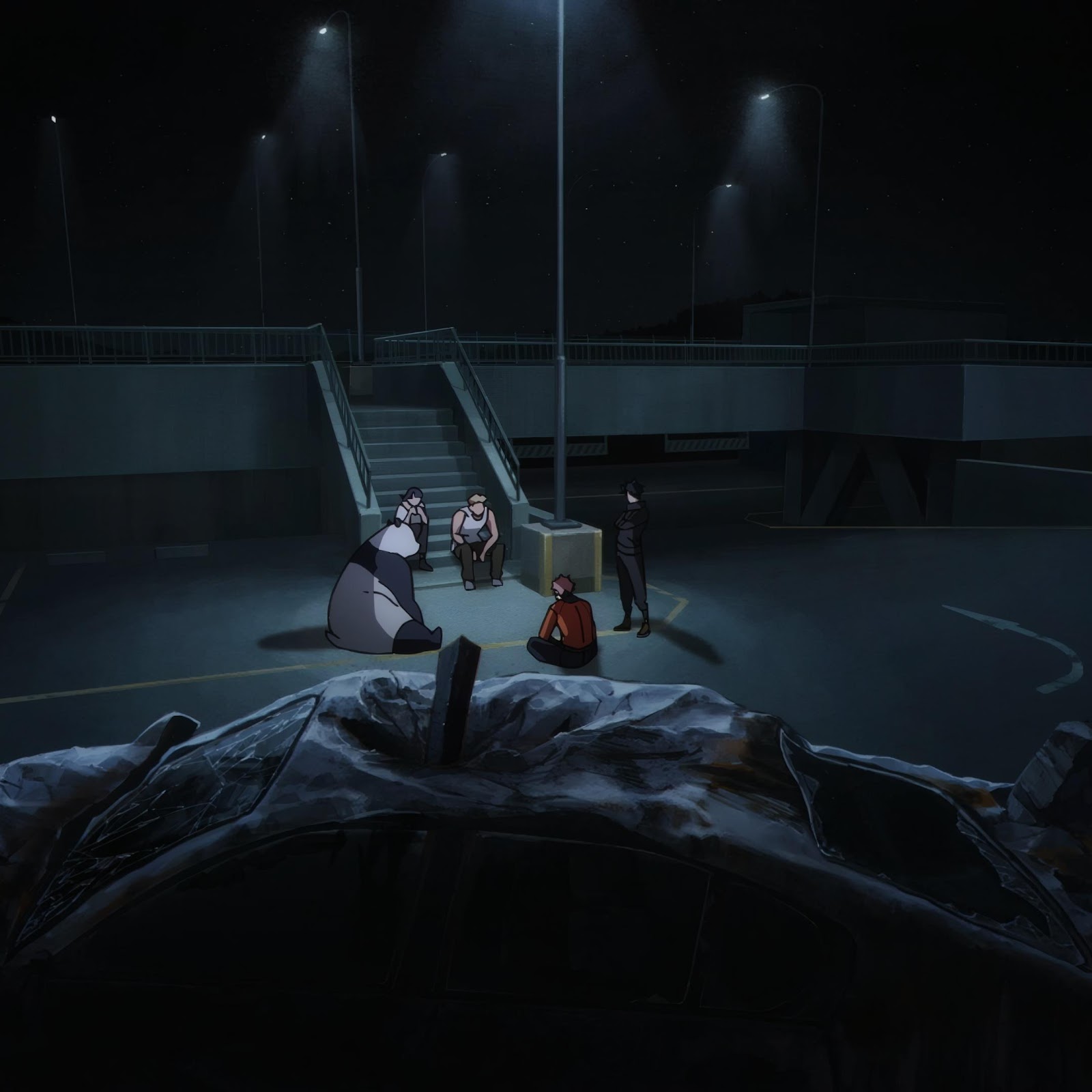Characters from the Jujutsu Kaisen series sit together in a dark parking lot at night under bright streetlights with a wrecked car in the foreground.