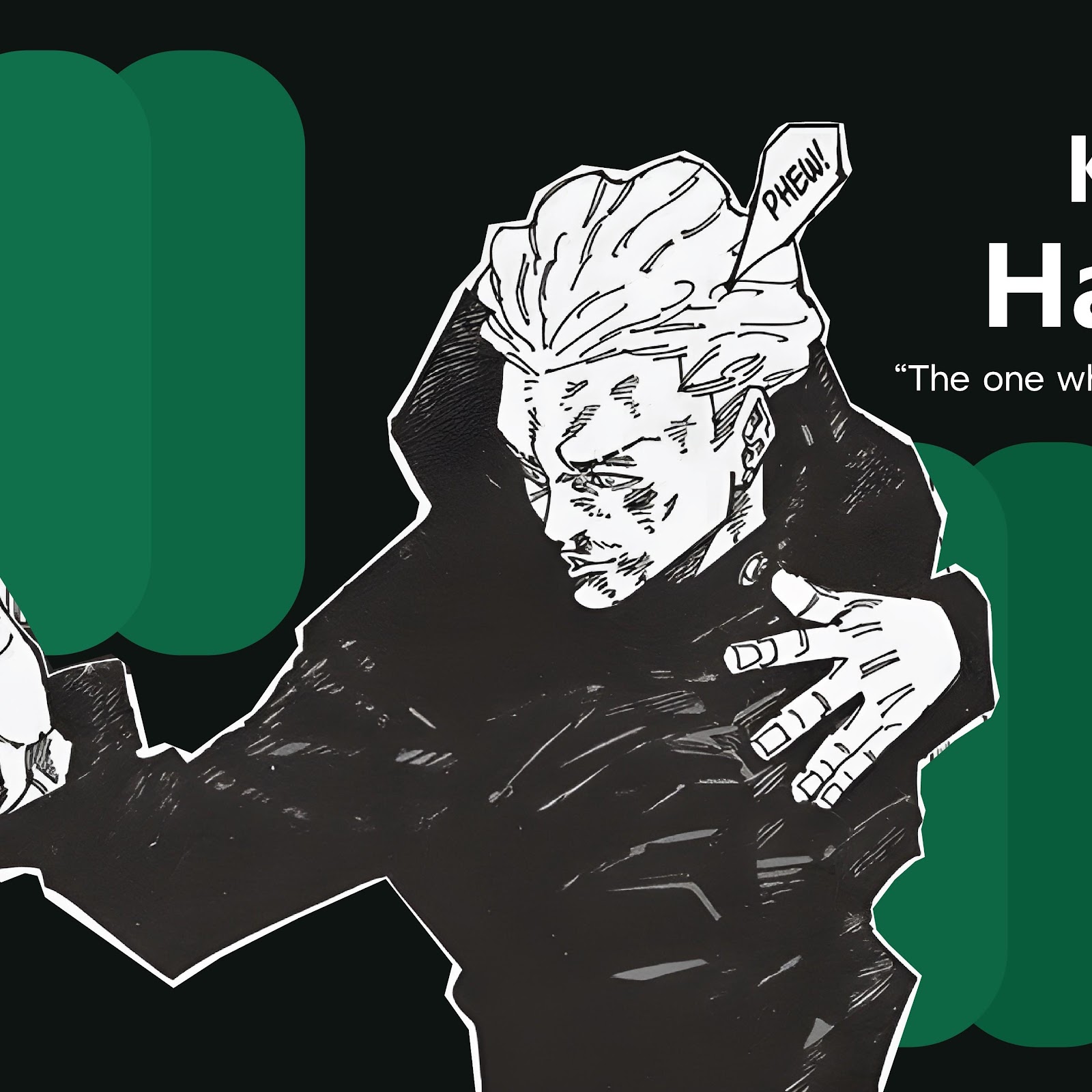 Kinji Hakari from the Jujutsu Kaisen manga performs a domain expansion hand sign against a dark background with green shapes and white text.