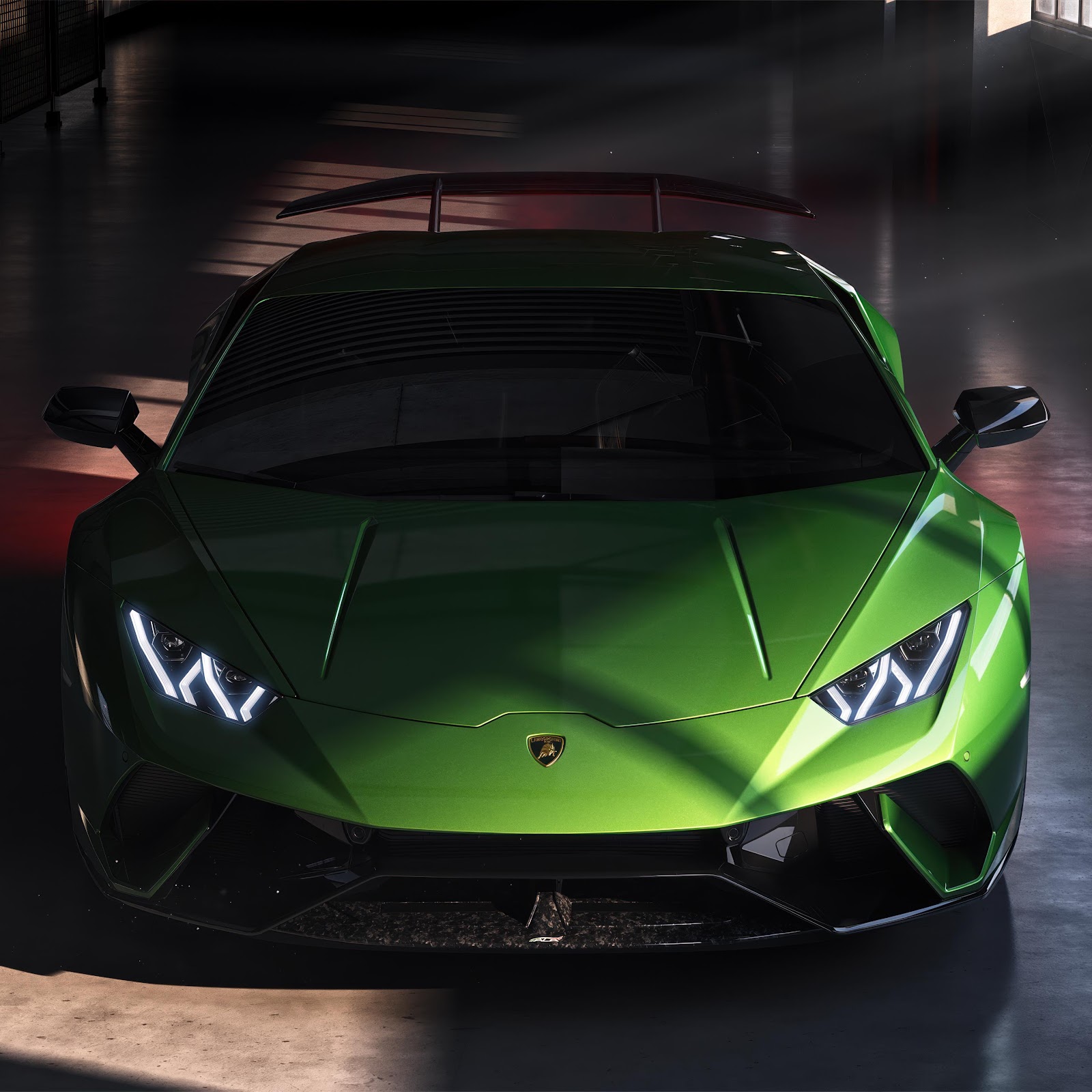 A lime green Lamborghini Huracán Performante parked in a dark garage with cinematic sunbeams shining across its hood and sharp headlights.