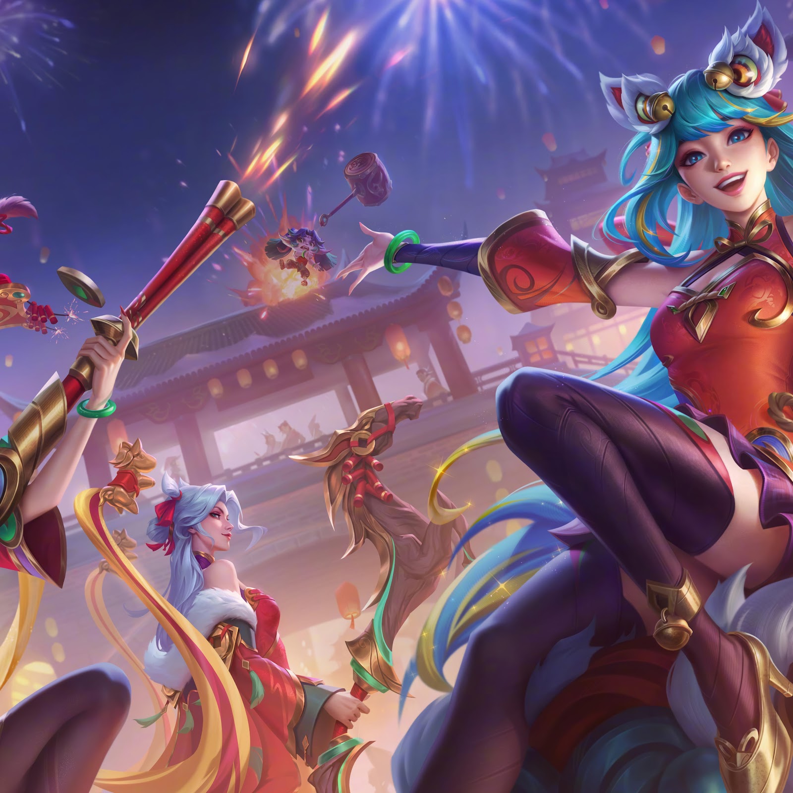 Seraphine from League of Legends celebrates the Lunar New Year with her friends and magical fireworks in a colorful festive city setting.