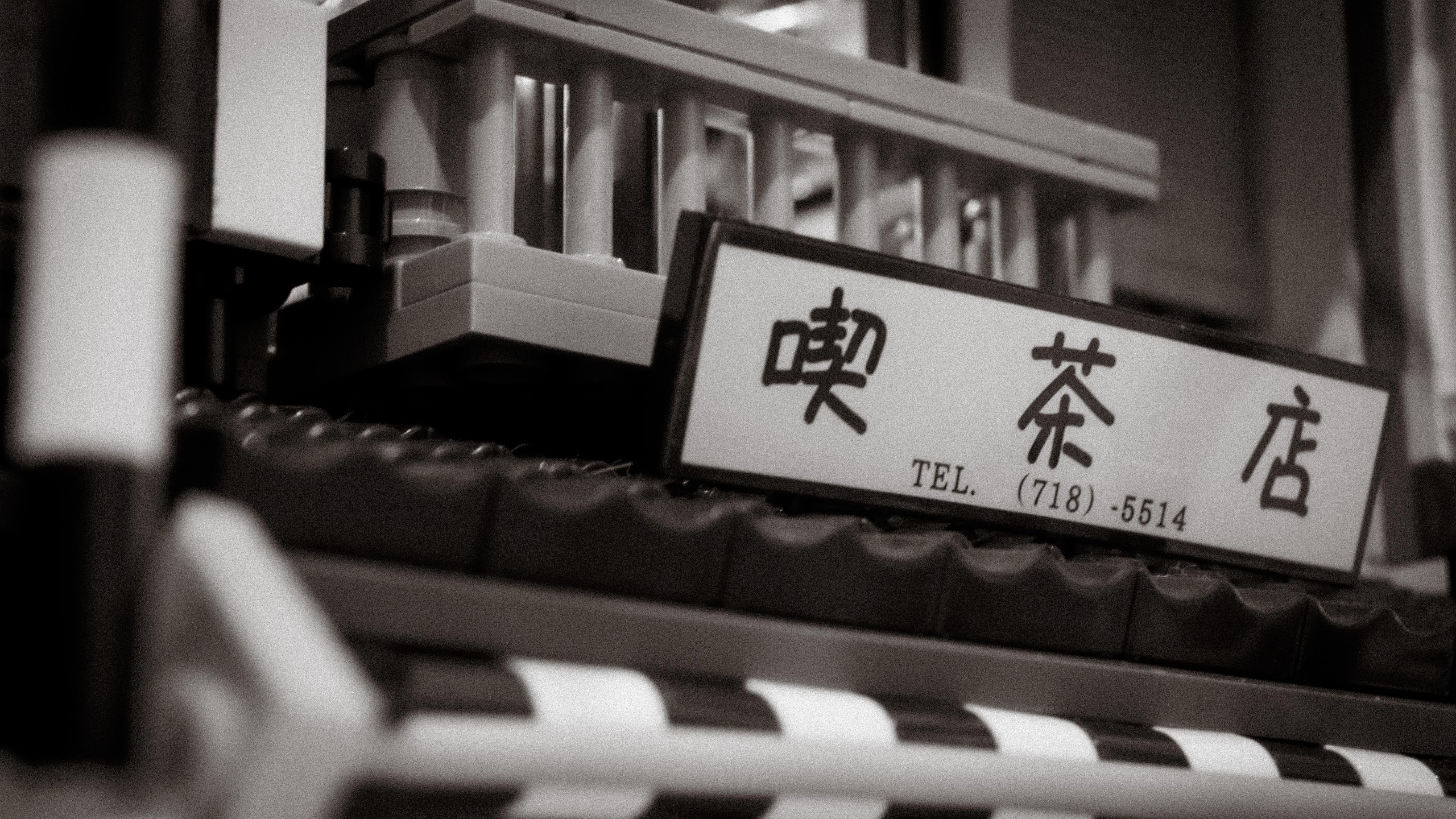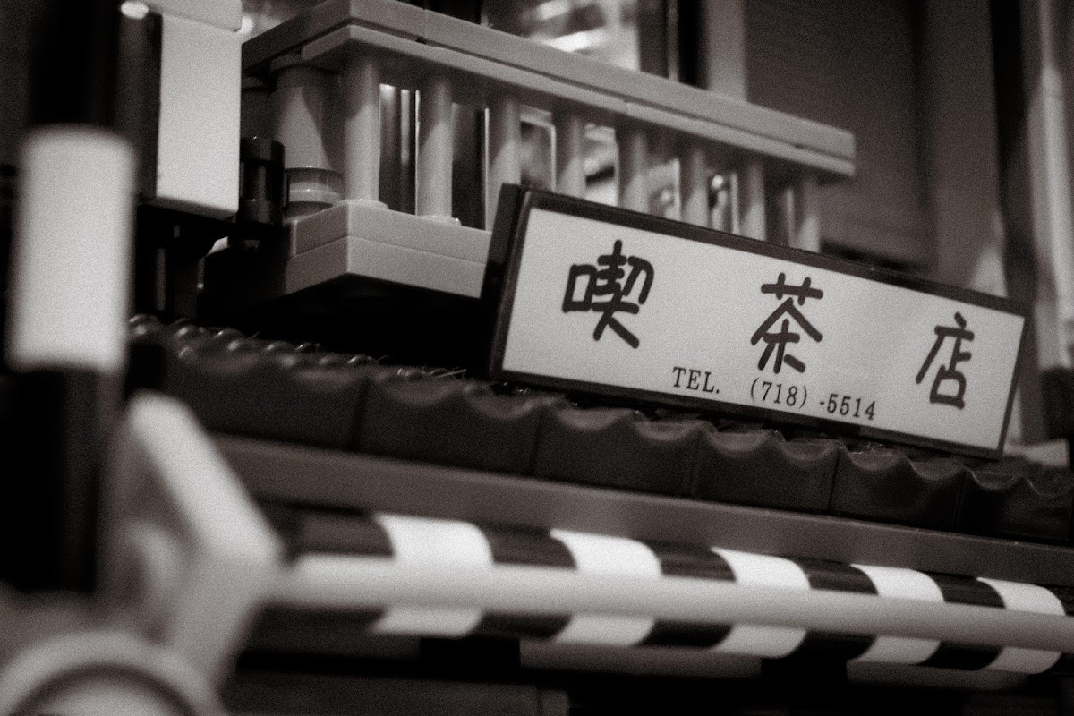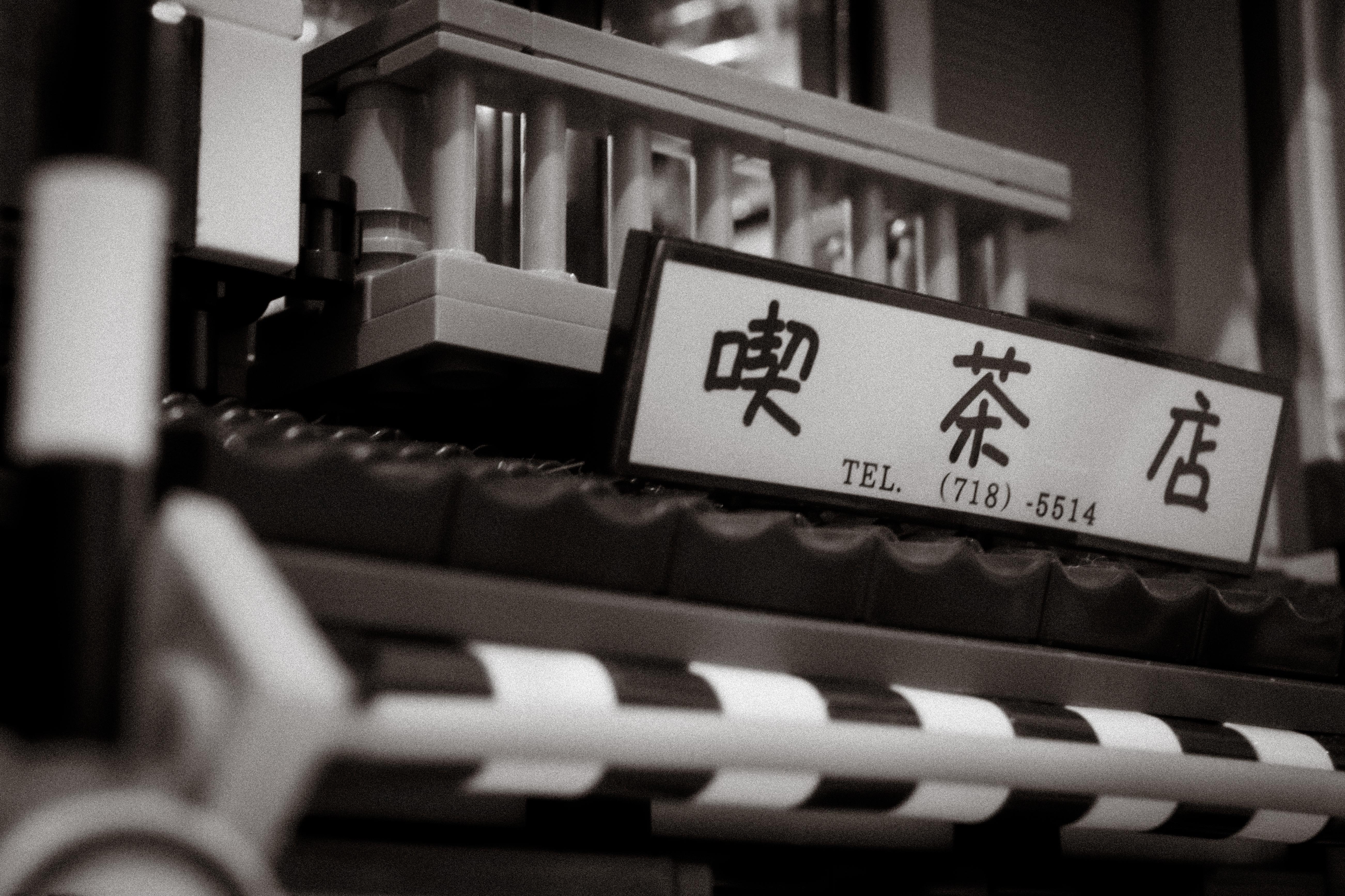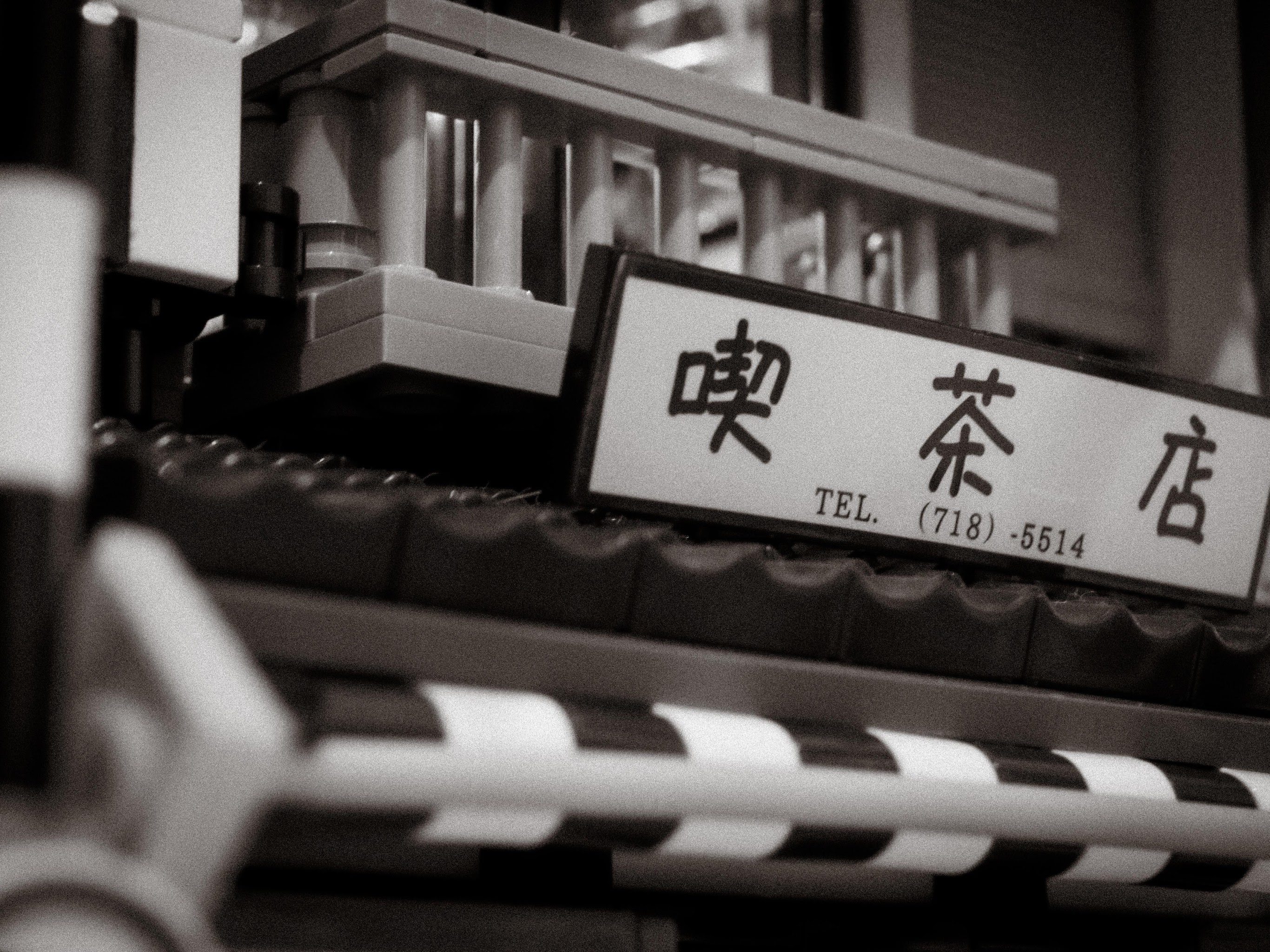A detailed Lego Japanese coffee shop building shows a sign with kanji characters and a phone number in a moody black and white photography style.