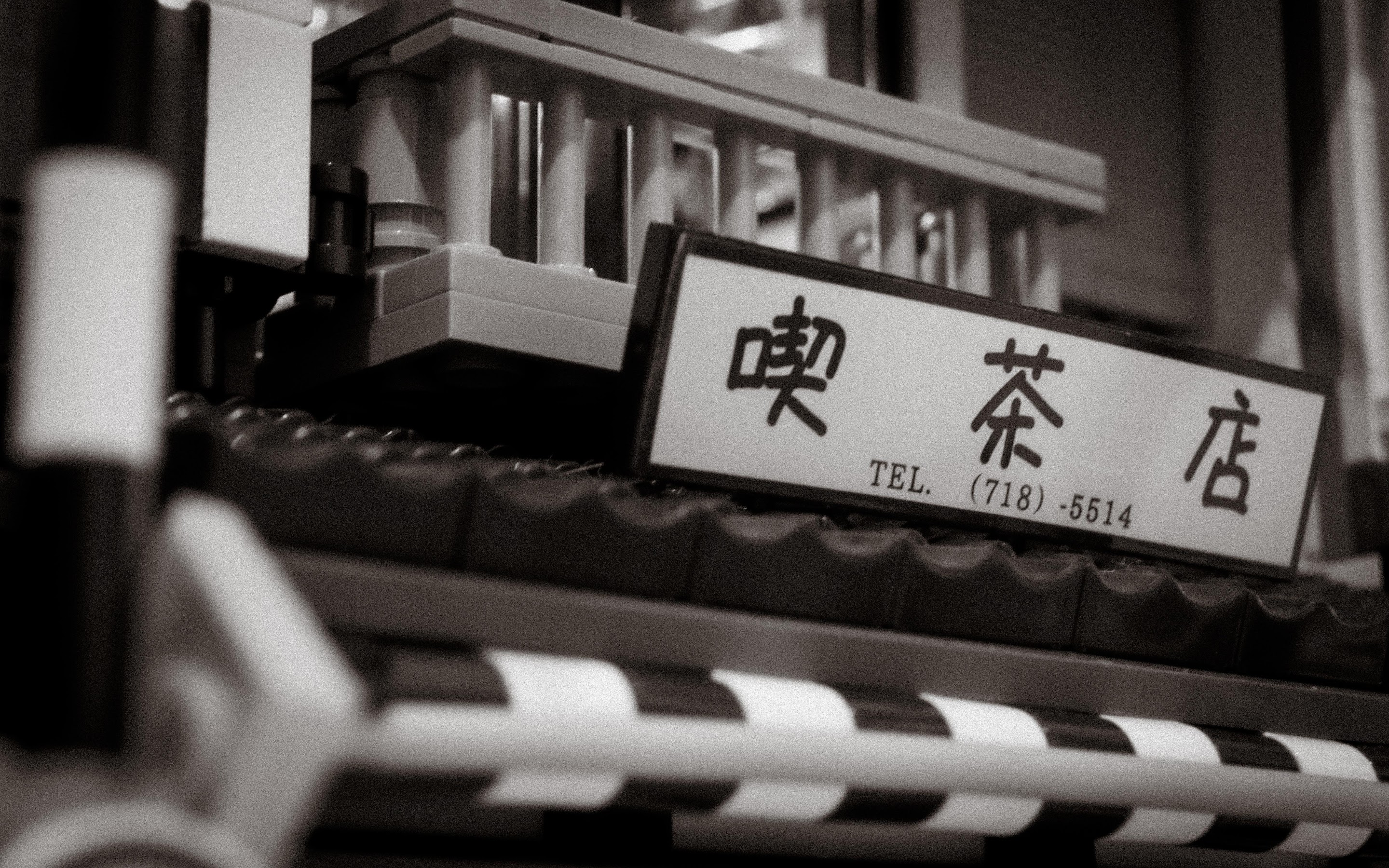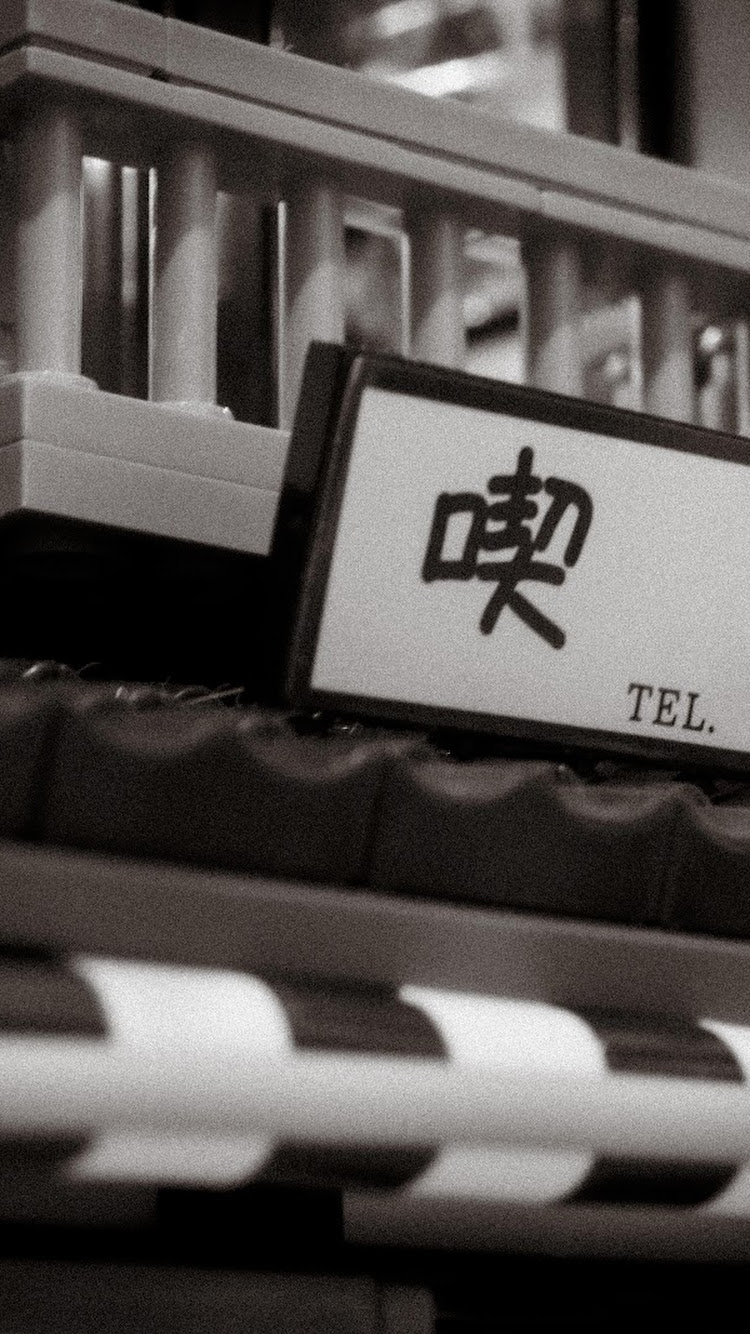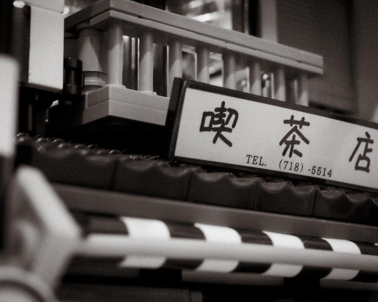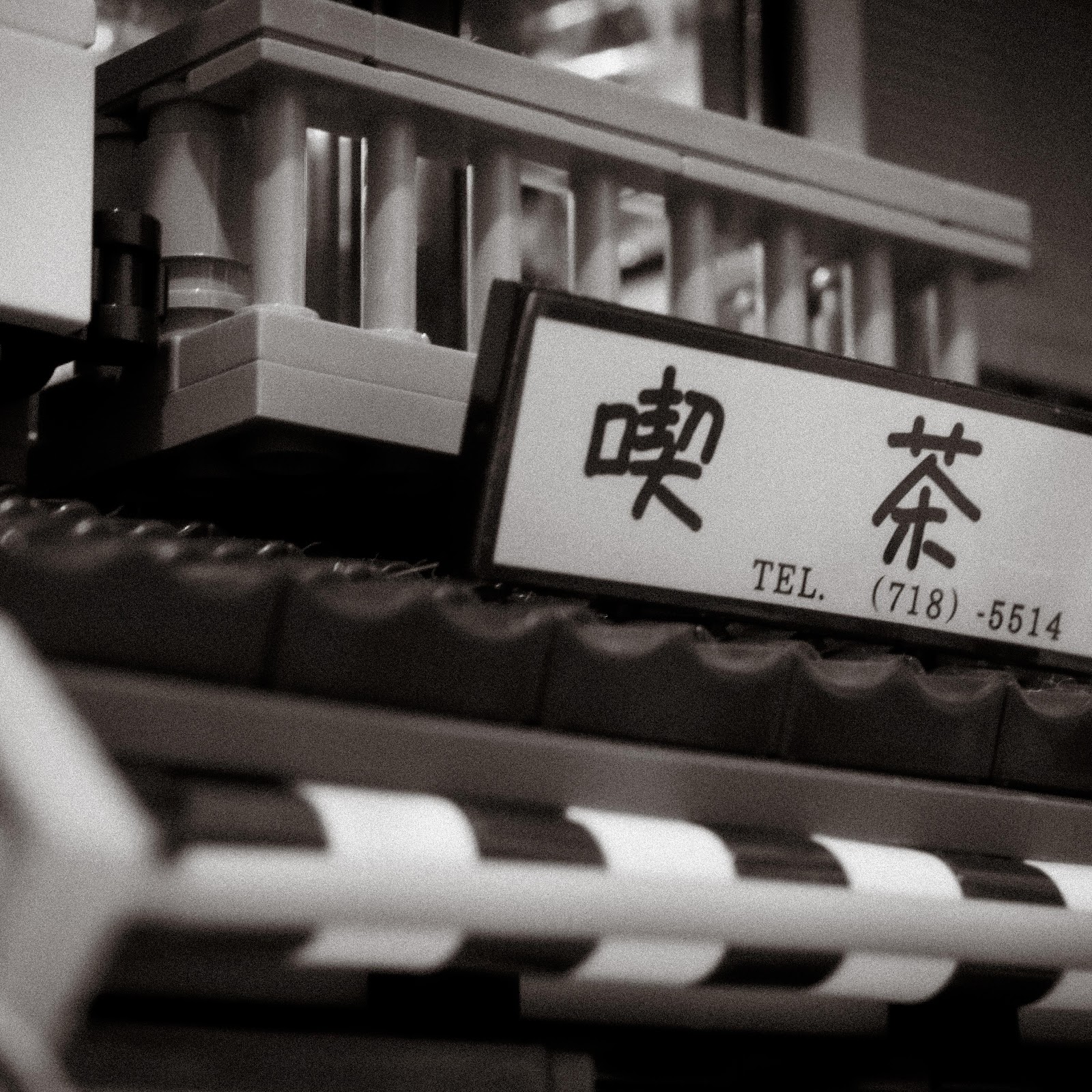 A detailed Lego Japanese coffee shop building shows a sign with kanji characters and a phone number in a moody black and white photography style.