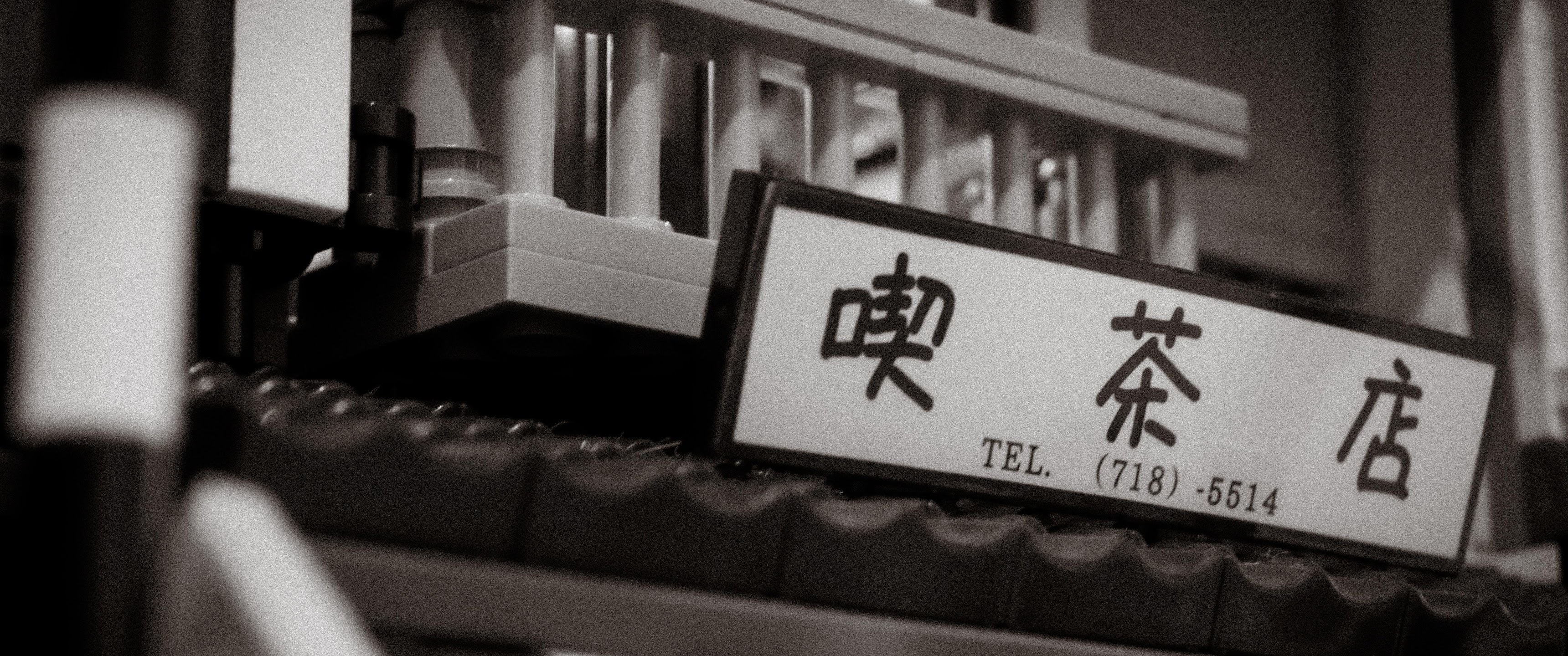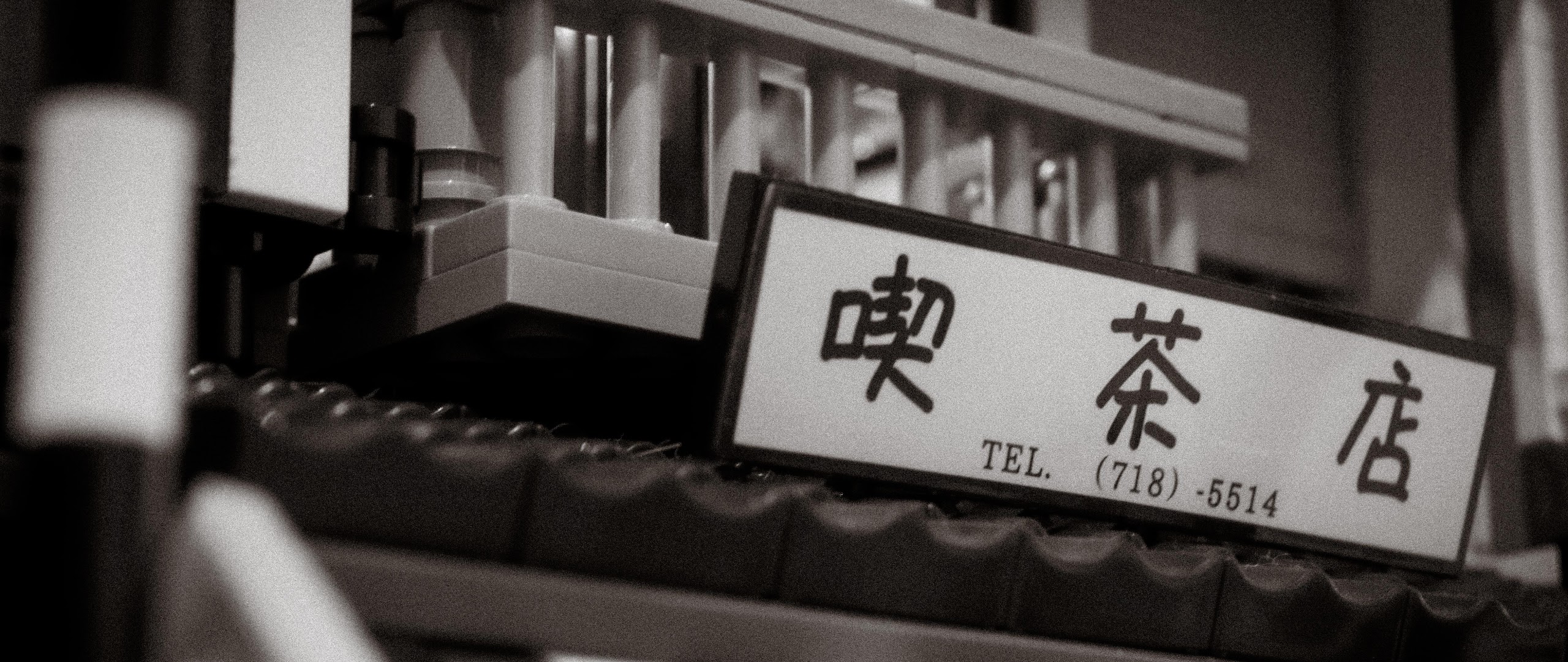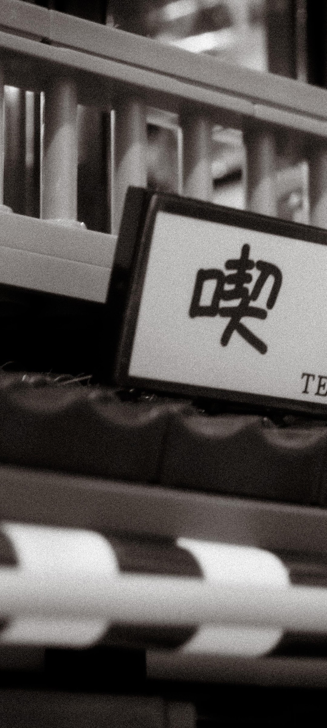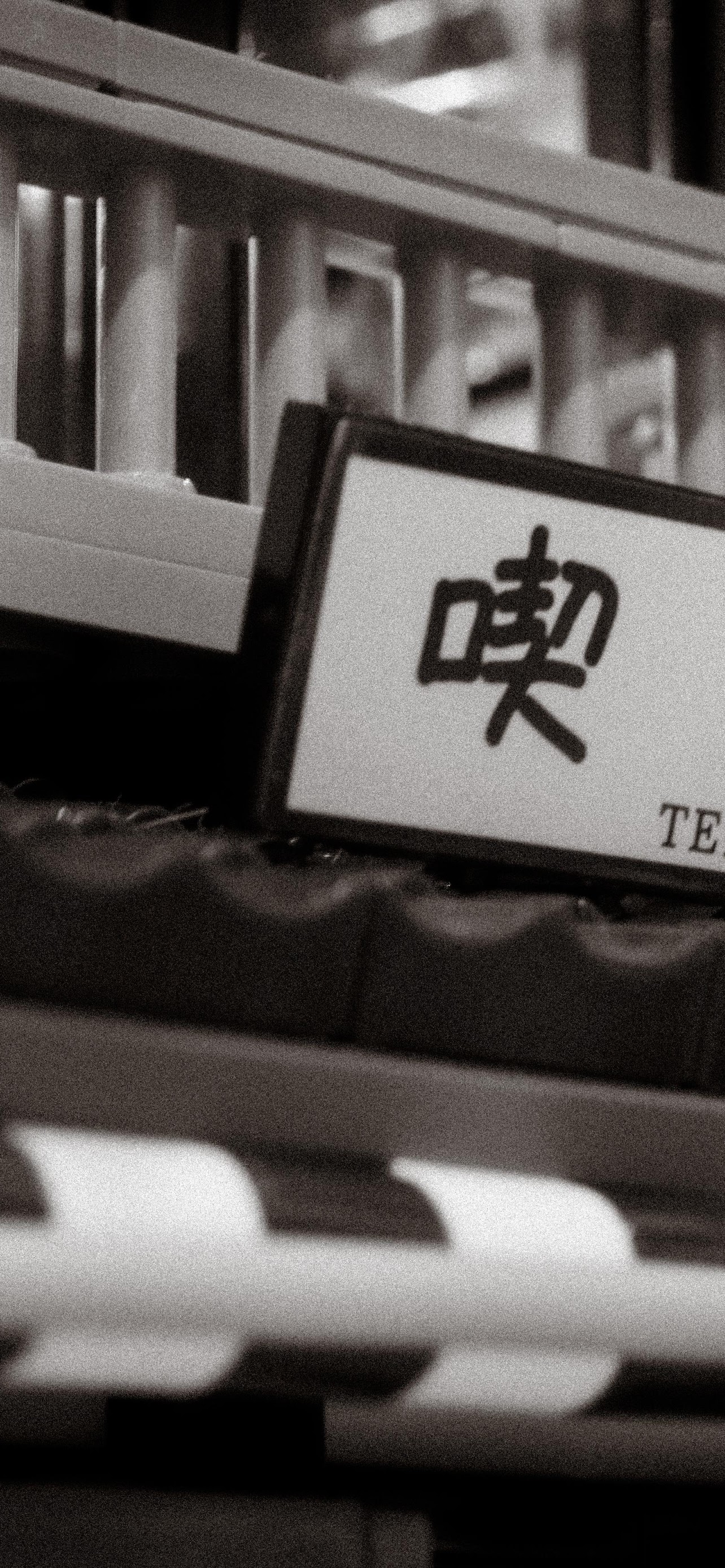 A detailed Lego Japanese coffee shop building shows a sign with kanji characters and a phone number in a moody black and white photography style.