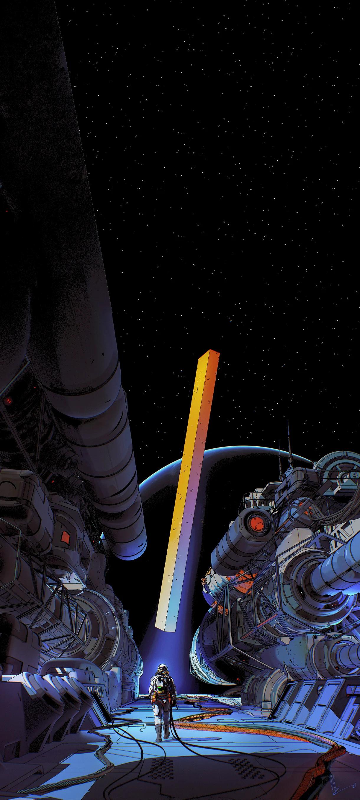 Lone Astronaut Near Space Monolith Full HD iPhone Wallpaper A lone astronaut stands on a space dock between large ship parts under a bright, colorful monolith. ll754 354.50 KB 1220x2712 Download original File Size: Dimensions: Resolution: Full HD Format: Mobile ID: Astronaut Black Digital Illustration Monolith Retro Futurism Sci-Fi Space Station