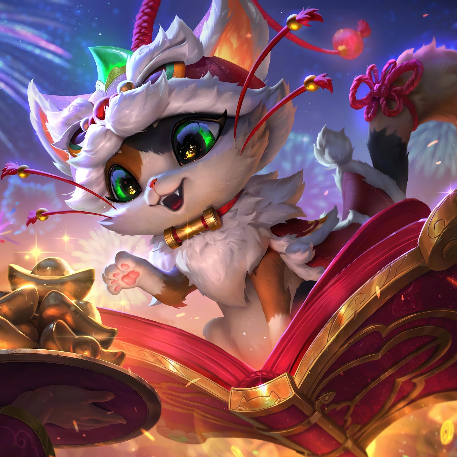 Yuumi from League of Legends sits on her magic book with gold coins under a bright firework display in this colorful festive digital art.