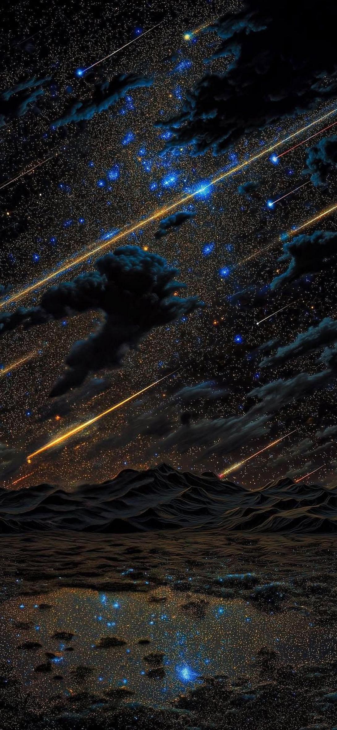 Meteor Shower Over Desert Mountains Full HD iPhone Wallpaper A bright meteor shower streaks across a dark night sky over rugged desert mountains with stars reflecting in a small puddle below. bj922 567.66 KB 1090x2360 Download original File Size: Dimensions: Resolution: Full HD Format: Mobile ID: Black Cosmic Art Desert Landscape Meteor Shower Night Sky Shooting Stars Starry Night