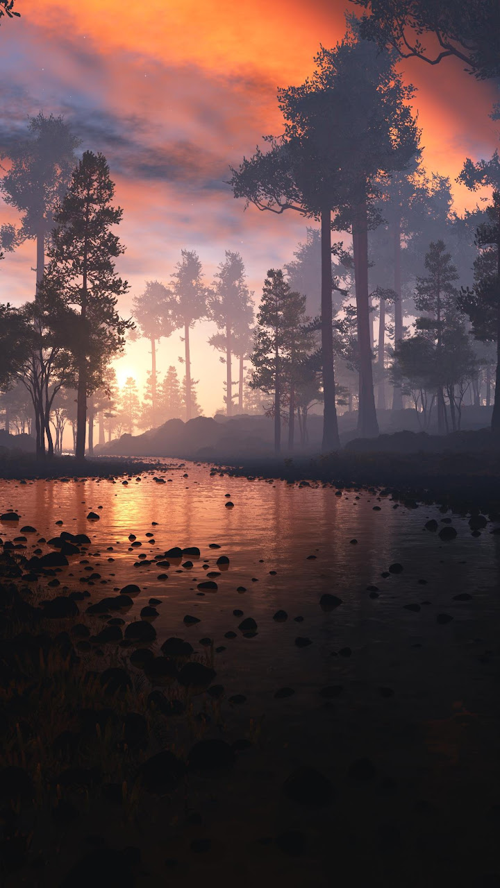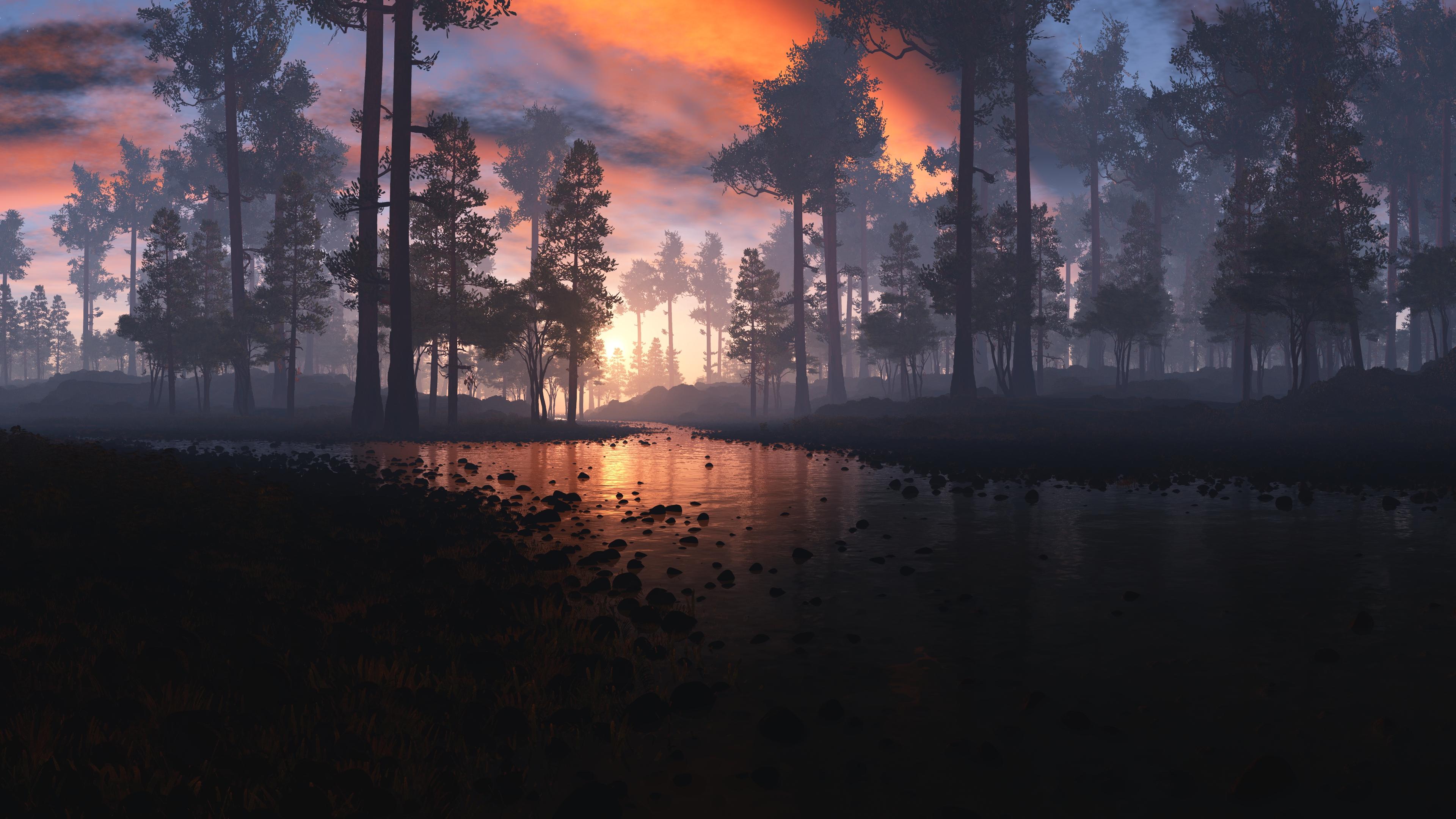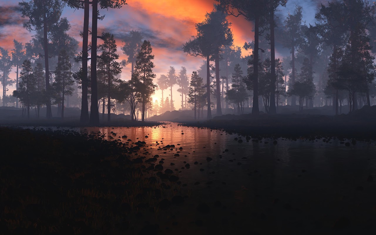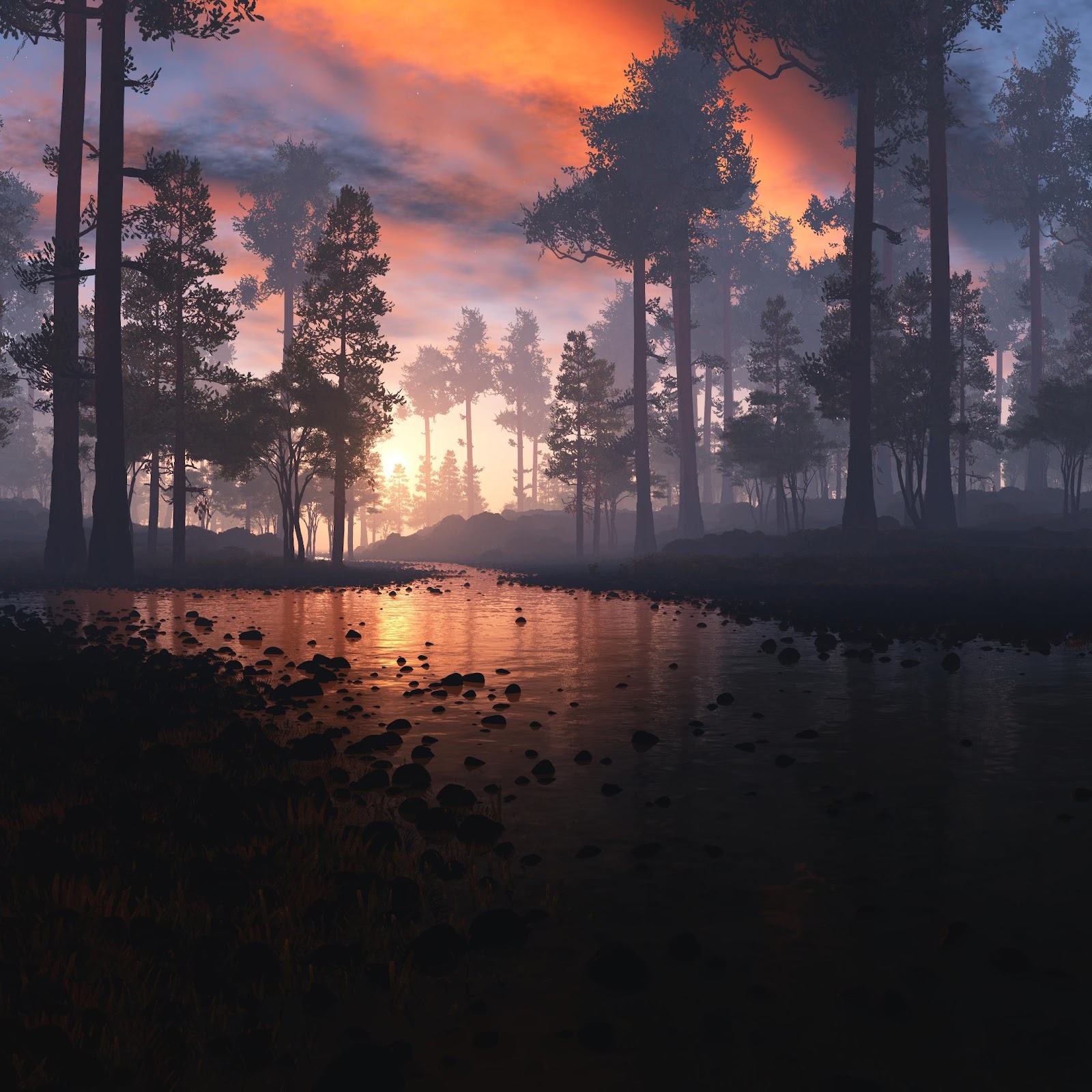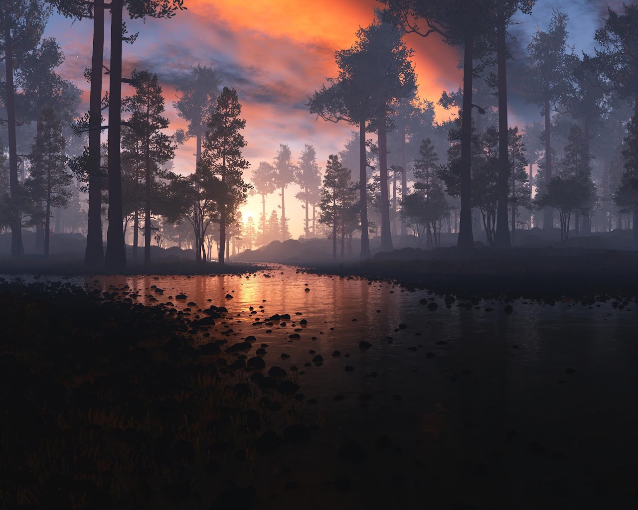 A winding stream flows through a dark forest with tall trees reflecting the intense orange and red sunset sky.