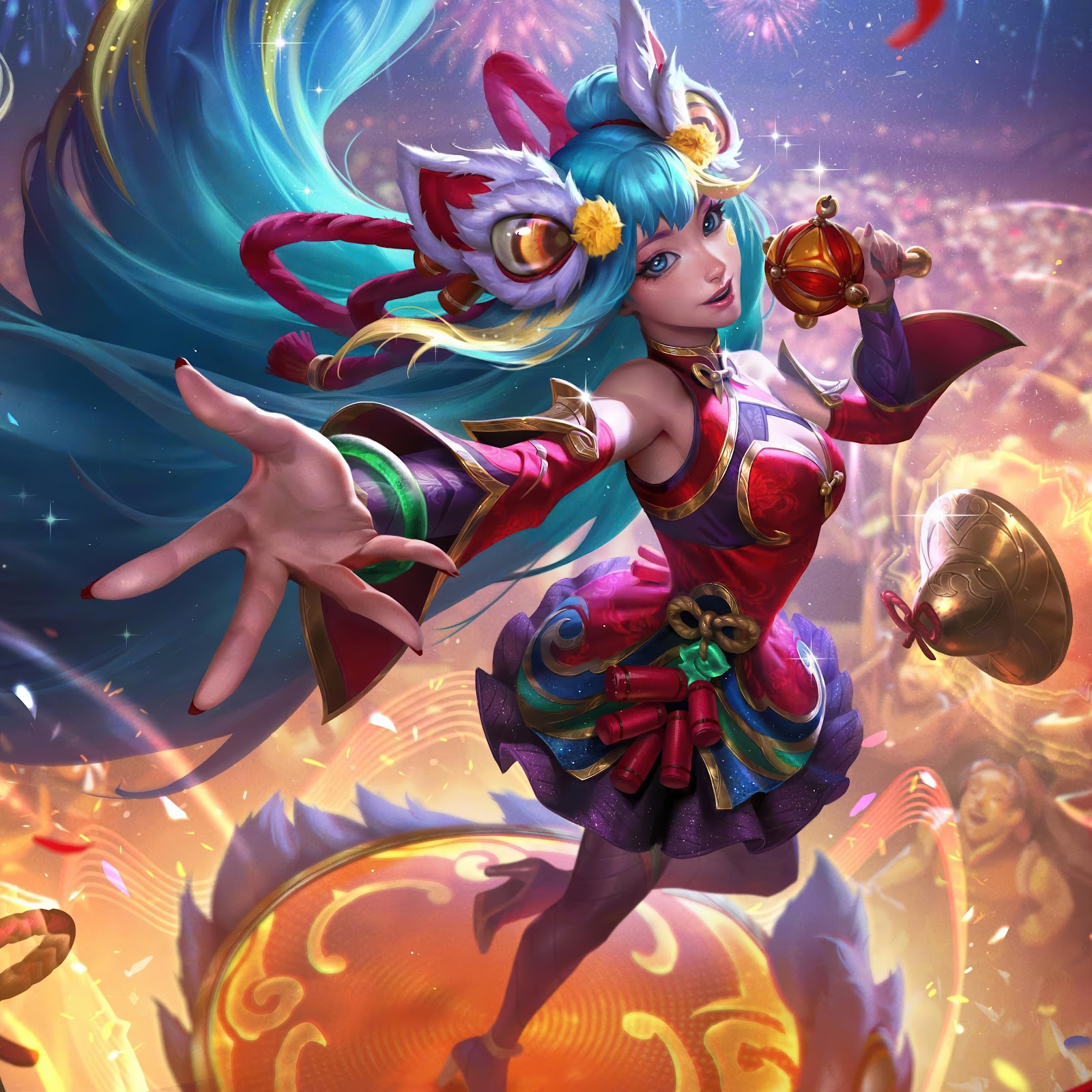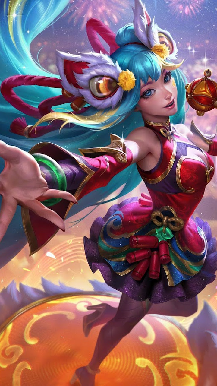 Seraphine from League of Legends performs in a vibrant Lunar New Year festival with her long blue hair flowing while golden fireworks light up the sky.