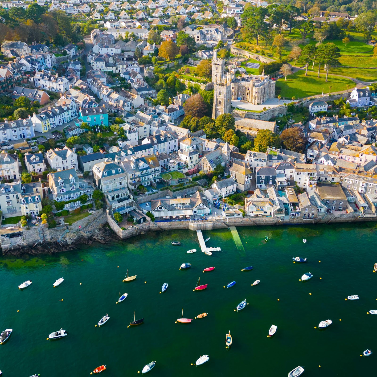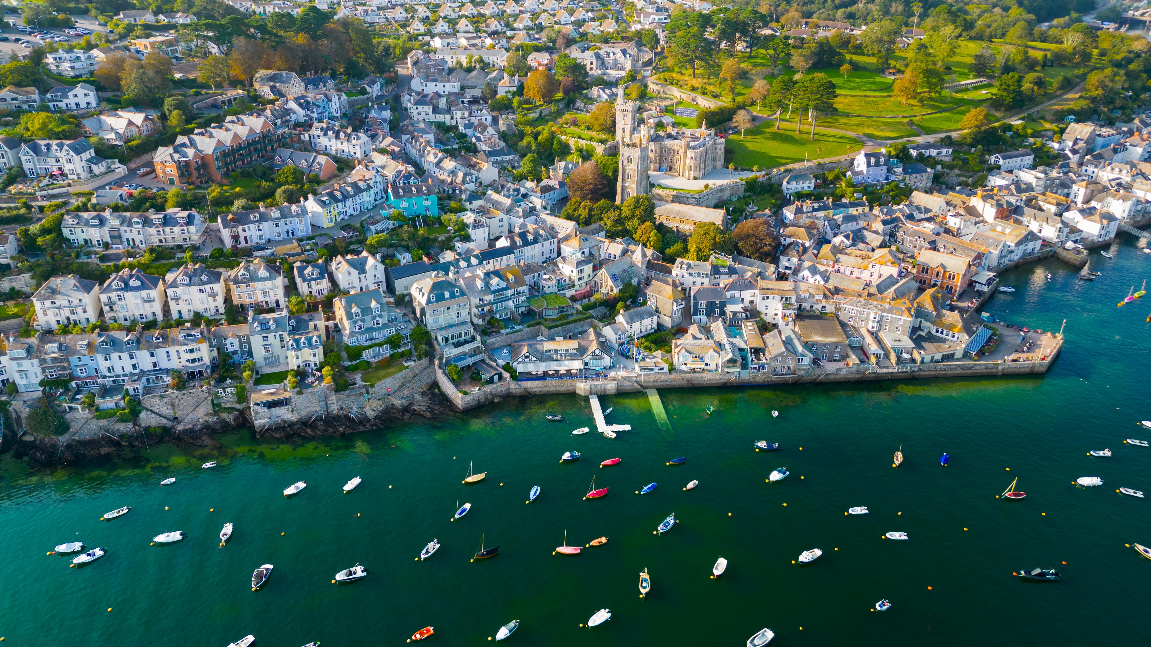 A charming historic village sits along a rocky coastline next to deep turquoise water filled with many small boats.