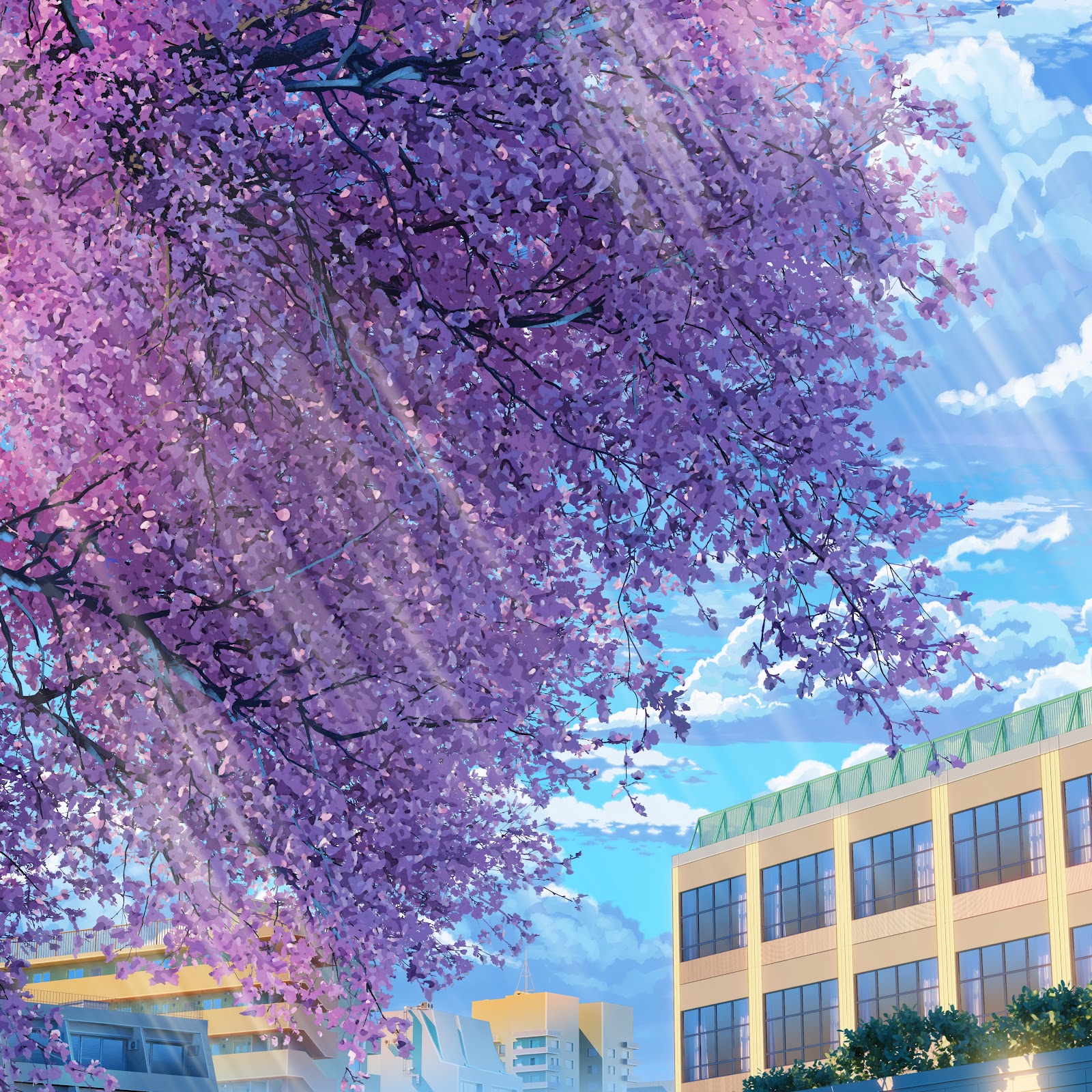 Large purple blossoms hang over a brightly lit school building under a detailed blue sky with beautiful sun rays.