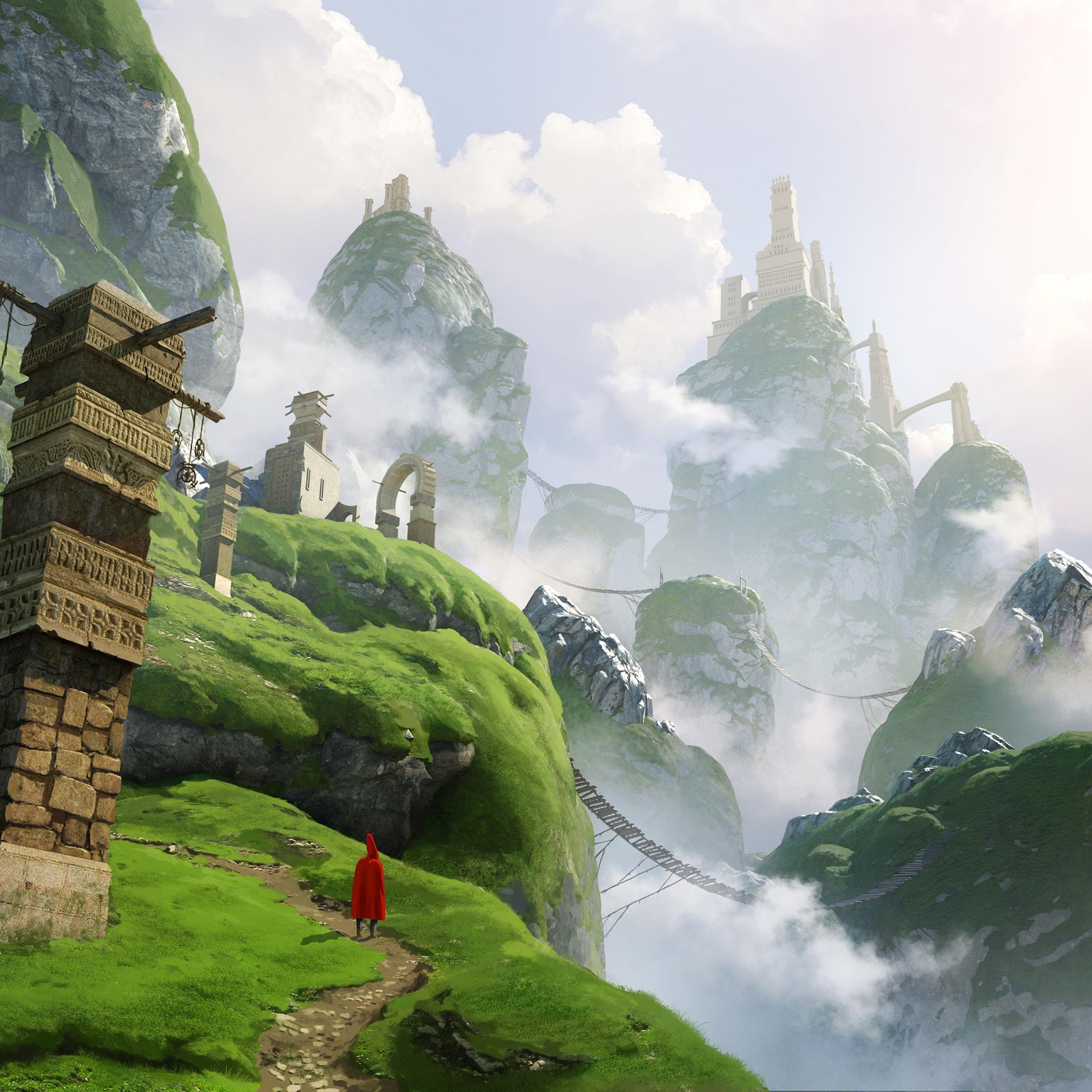 A small figure in a red cloak walks along a grassy path toward floating castles and ancient stone towers in a bright fantasy mountain landscape.