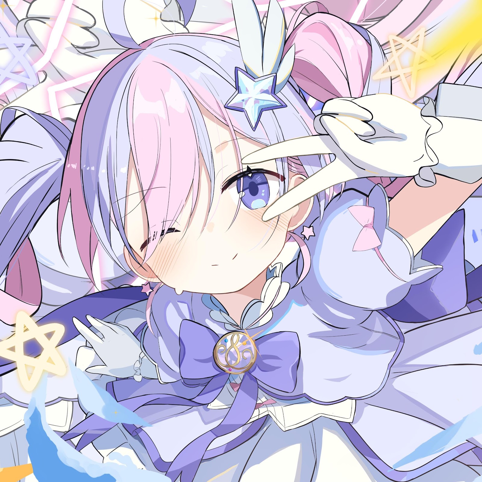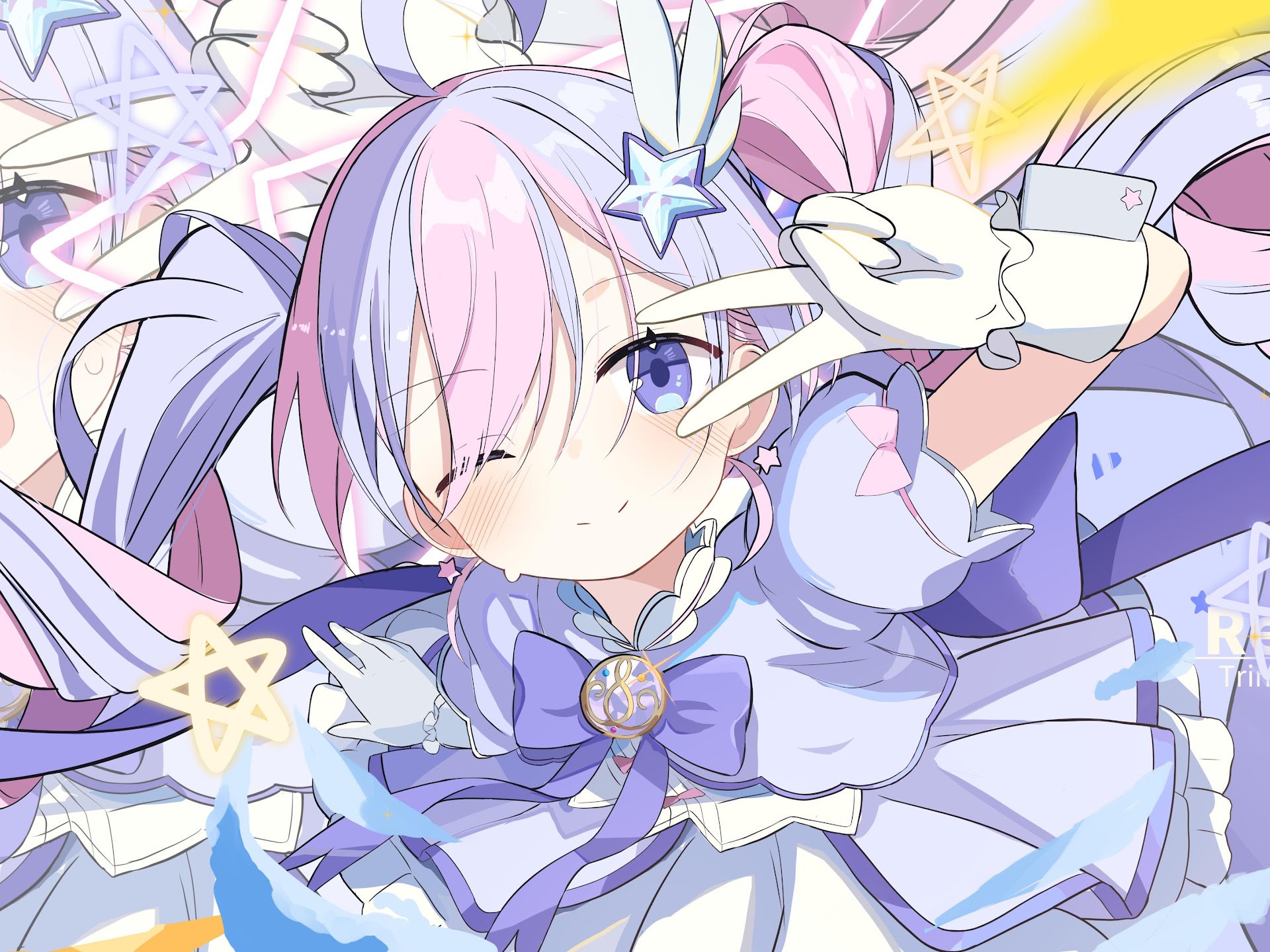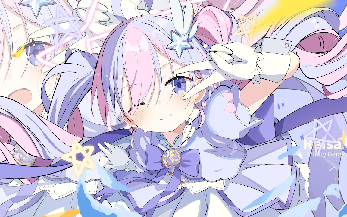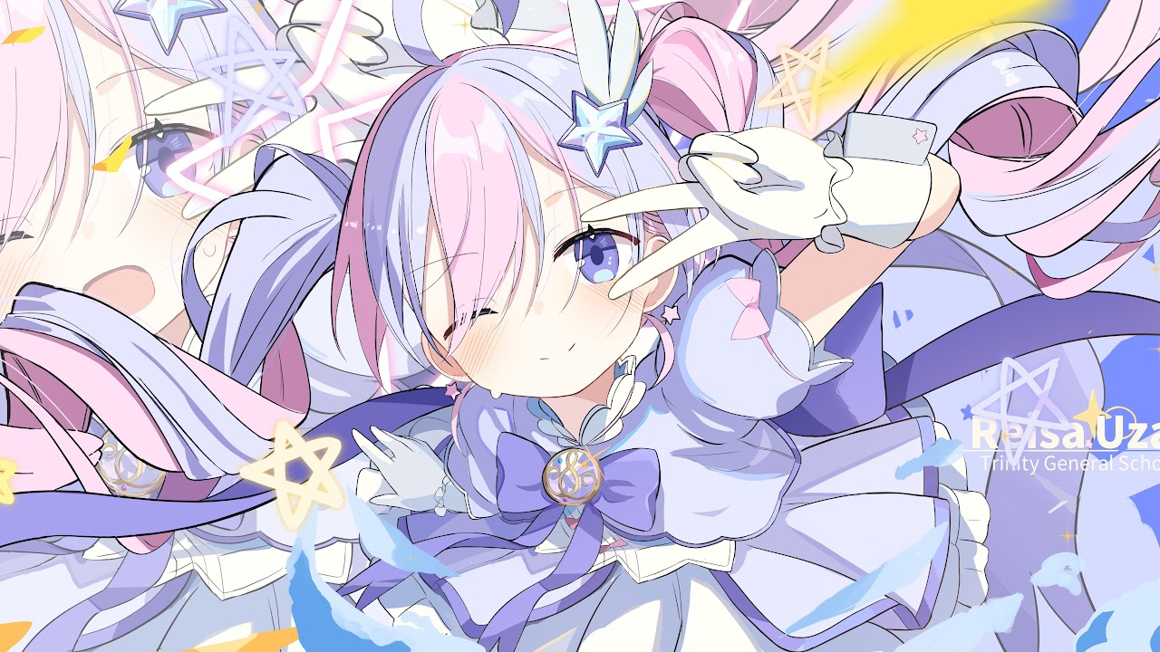 Reisa Uzawa from Blue Archive poses with a peace sign amidst pastel colors and twinkling stars in this vibrant anime illustration.