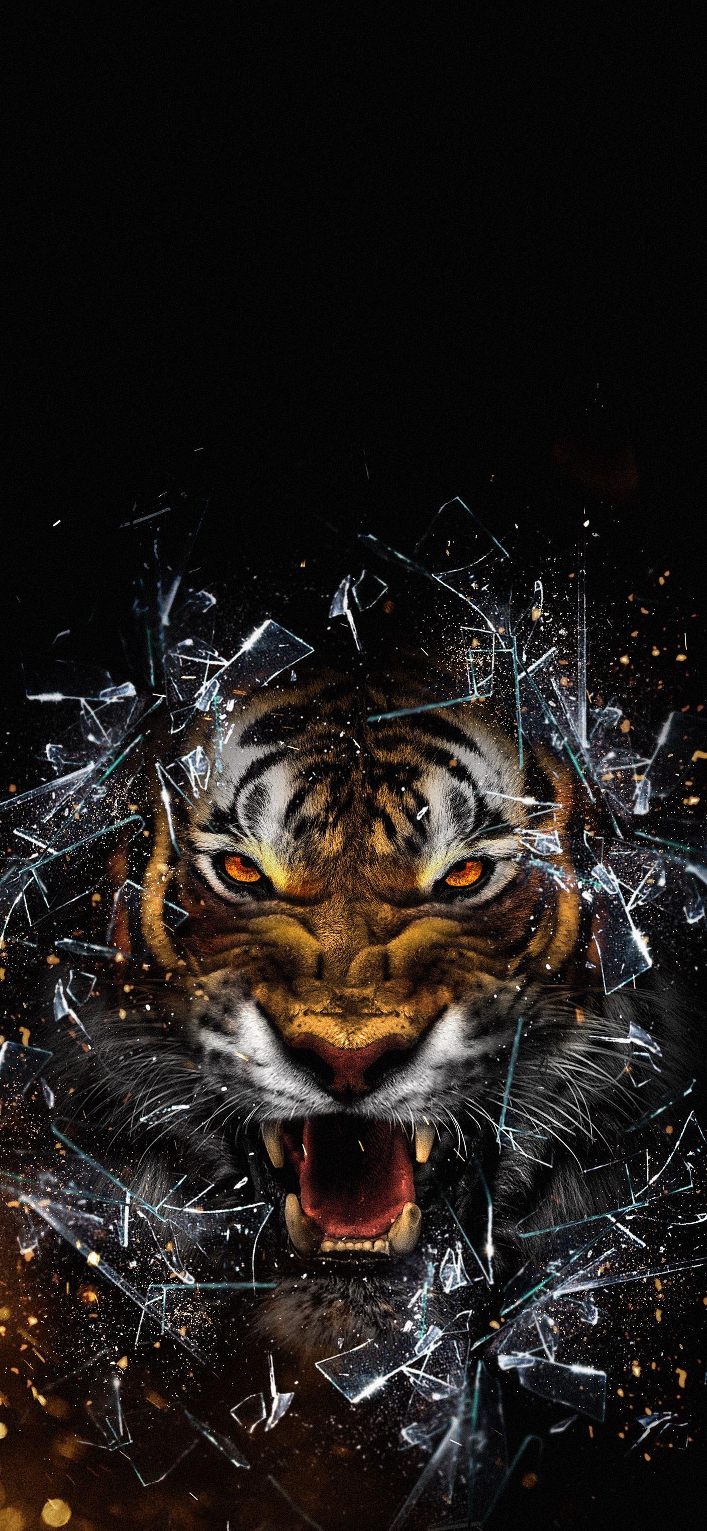 Roaring Tiger Breaking Through Glass Full HD iPhone Wallpaper A fierce tiger roars with its mouth open as it bursts through a sheet of shattered glass against a dark background with golden sparks. uk185 794.95 KB 1407x3045 Download original File Size: Dimensions: Resolution: Full HD Format: Mobile ID: Black Fierce Predator Roaring Shattered Glass Tiger Wildlife