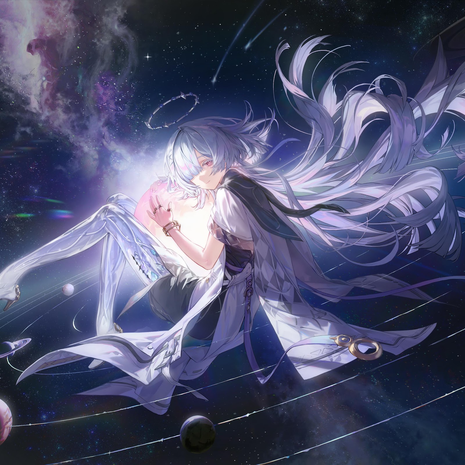 Robin from Honkai Star Rail floats gracefully in the vastness of space surrounded by glowing planets and distant nebulae with a cosmic aesthetic.