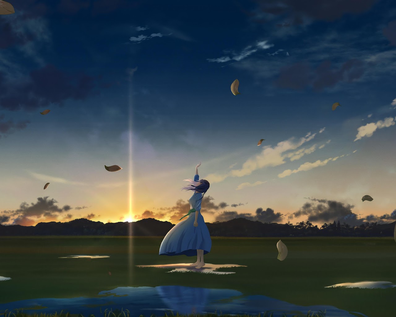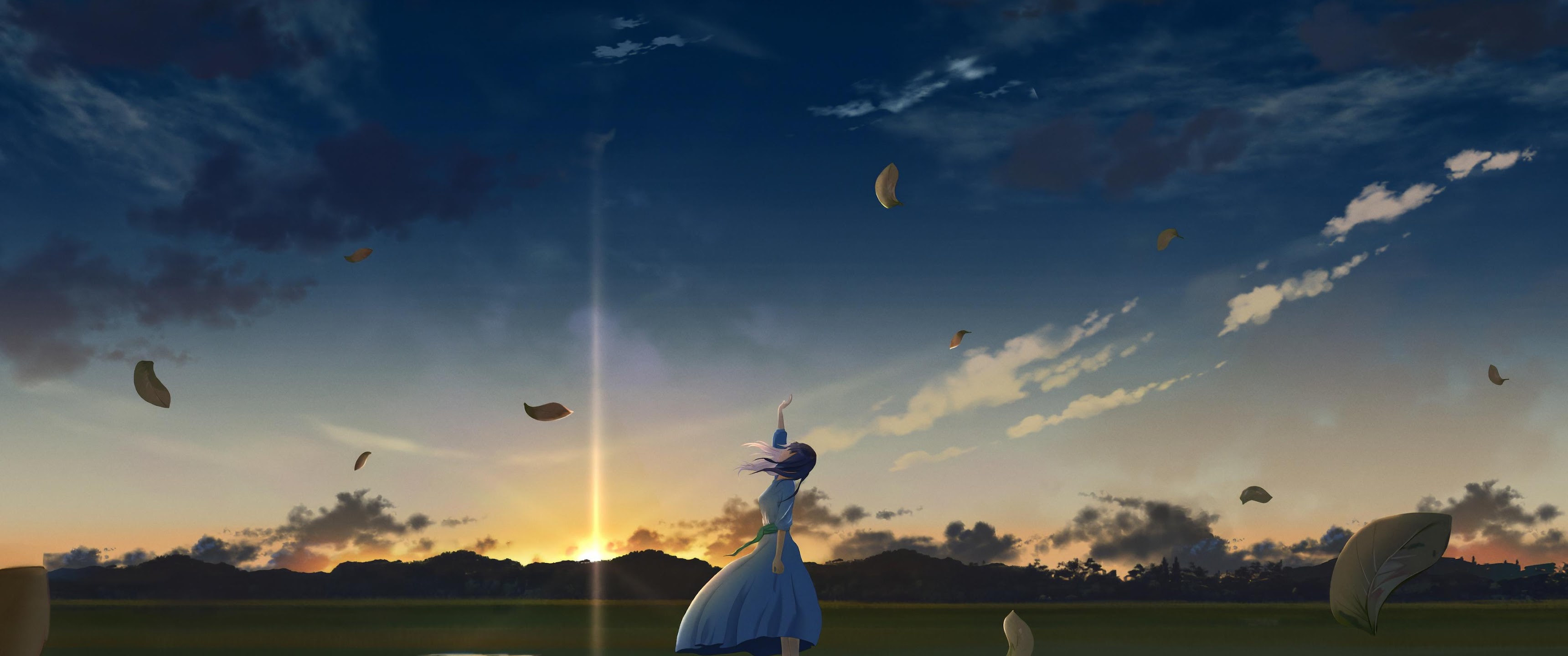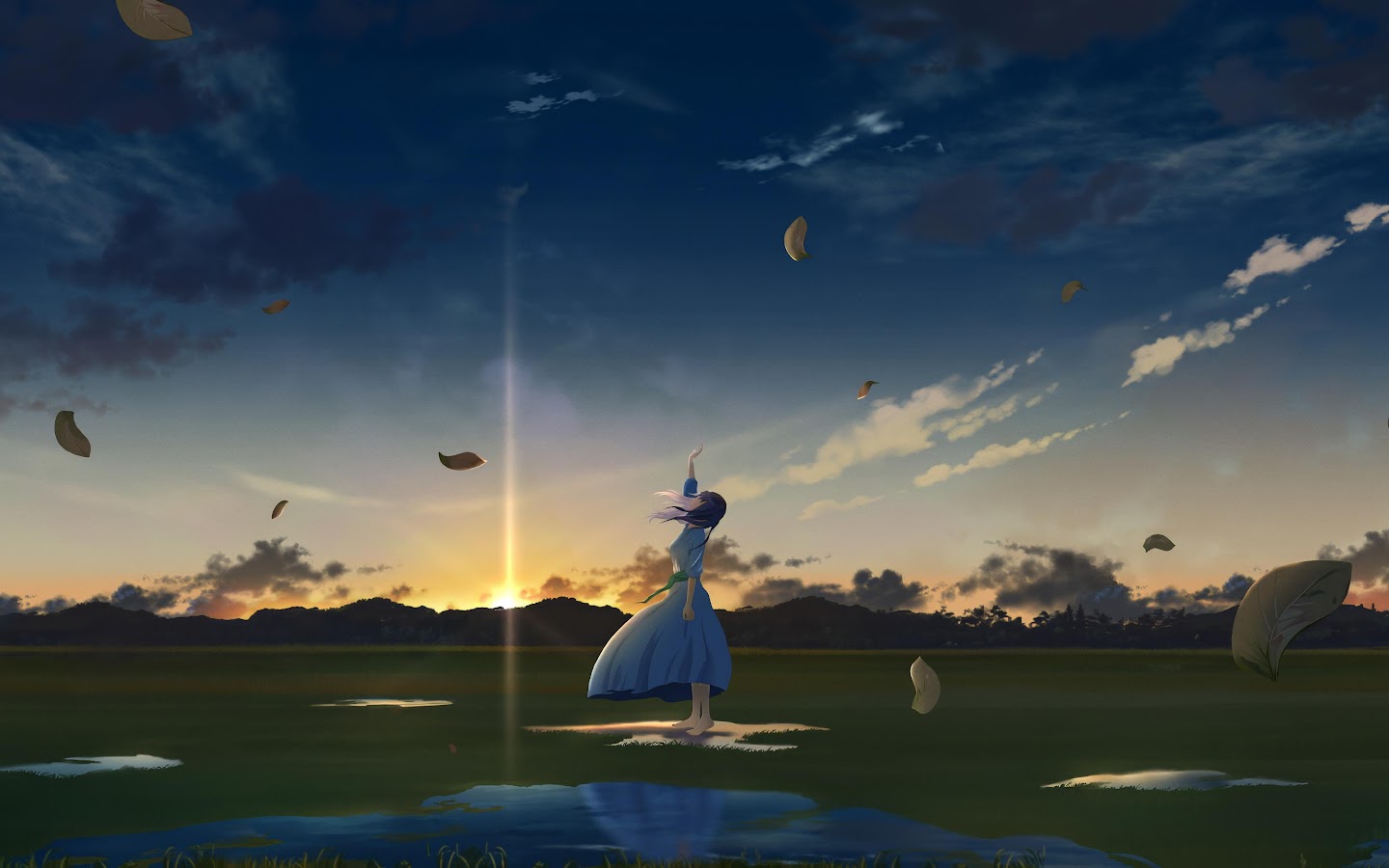 Sakura Matou from the Fate series stands in a grassy field at sunset reaching toward the sky as leaves fall around her in a beautiful anime scene.