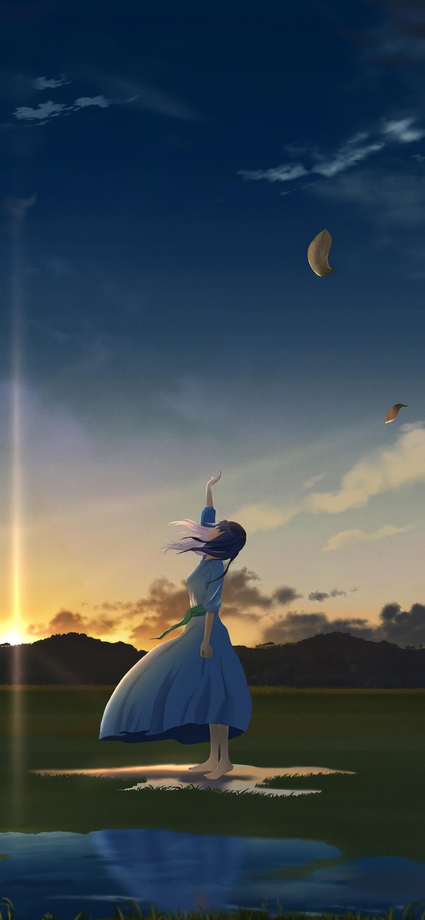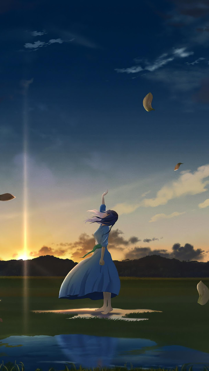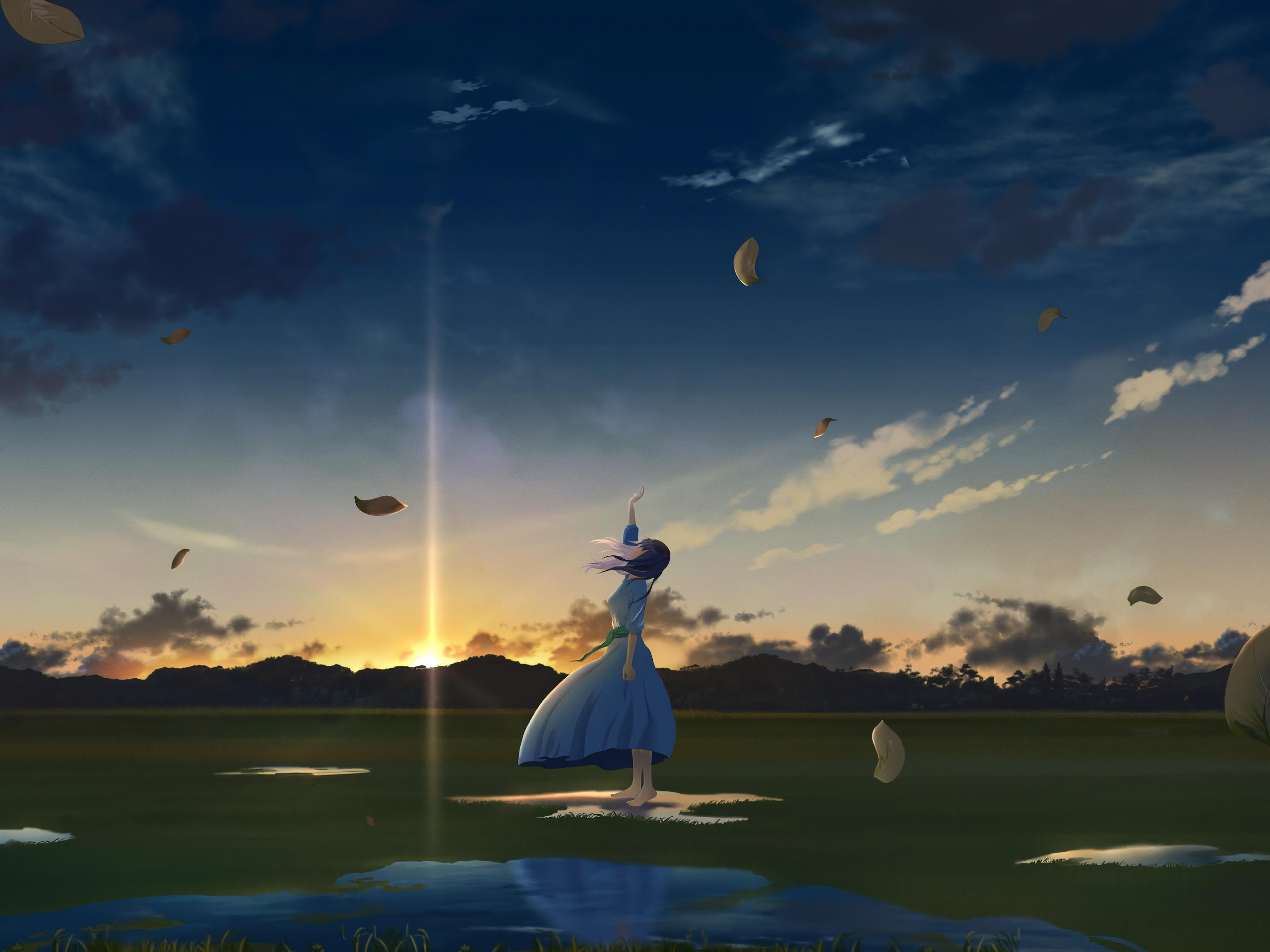 Sakura Matou from the Fate series stands in a grassy field at sunset reaching toward the sky as leaves fall around her in a beautiful anime scene.