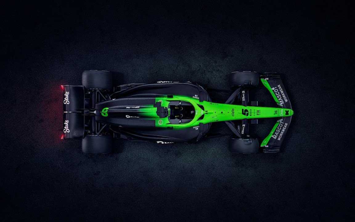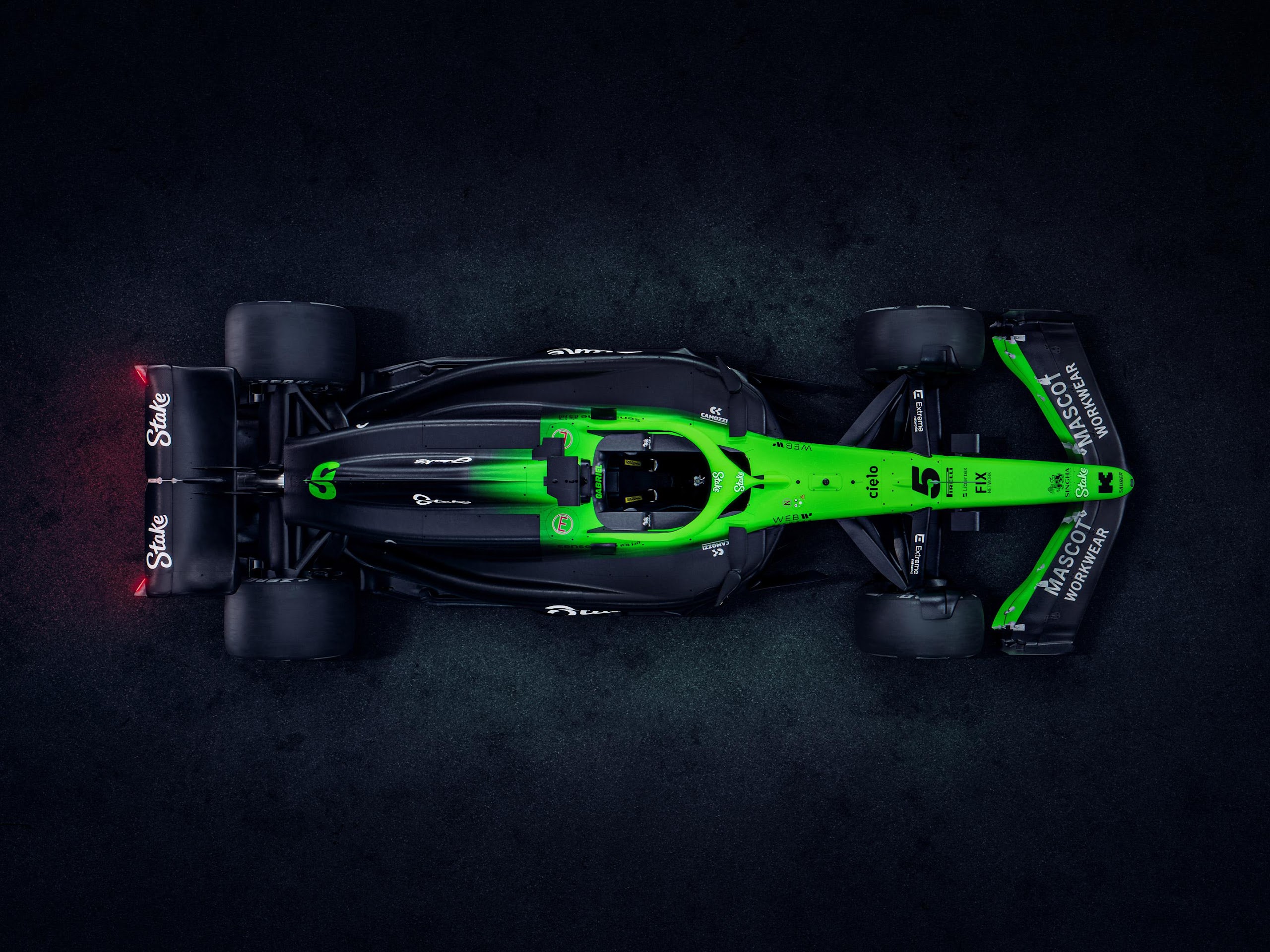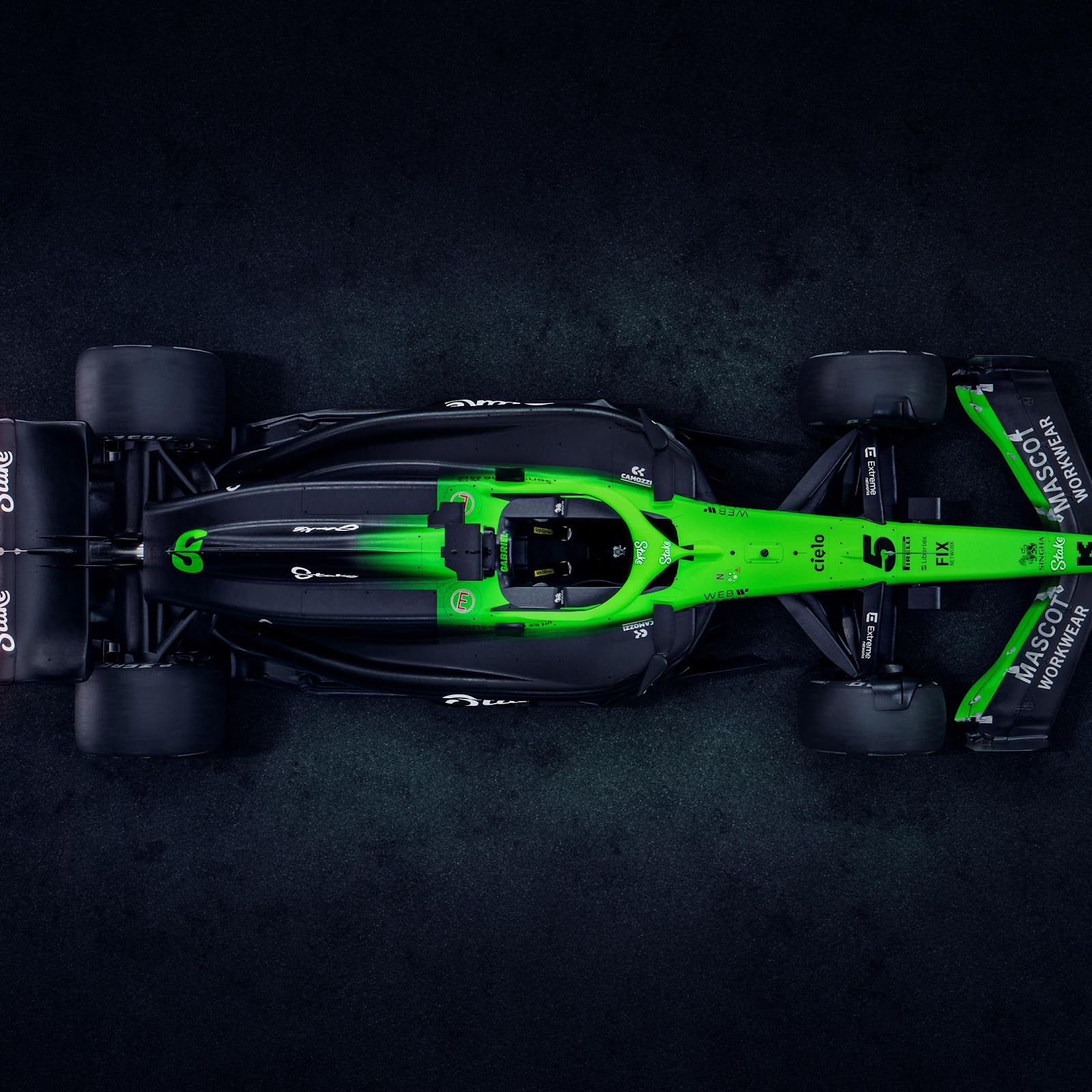 A Sauber C44 Formula One car sits on a dark textured surface showing its bright green accents with a clean top-down perspective and professional studio lighting.