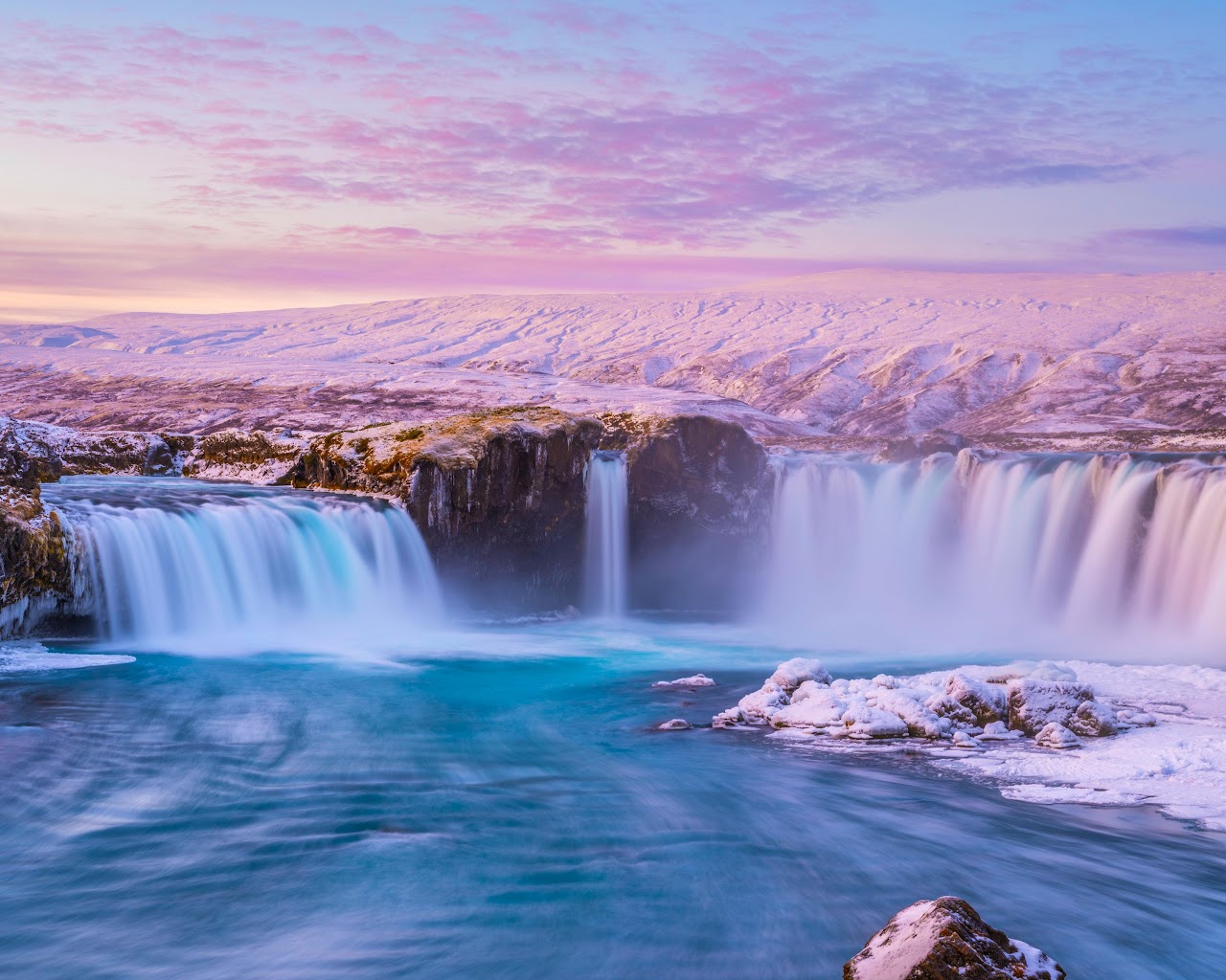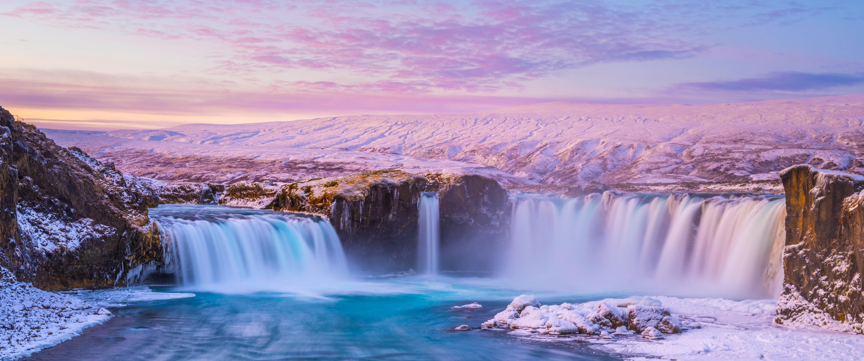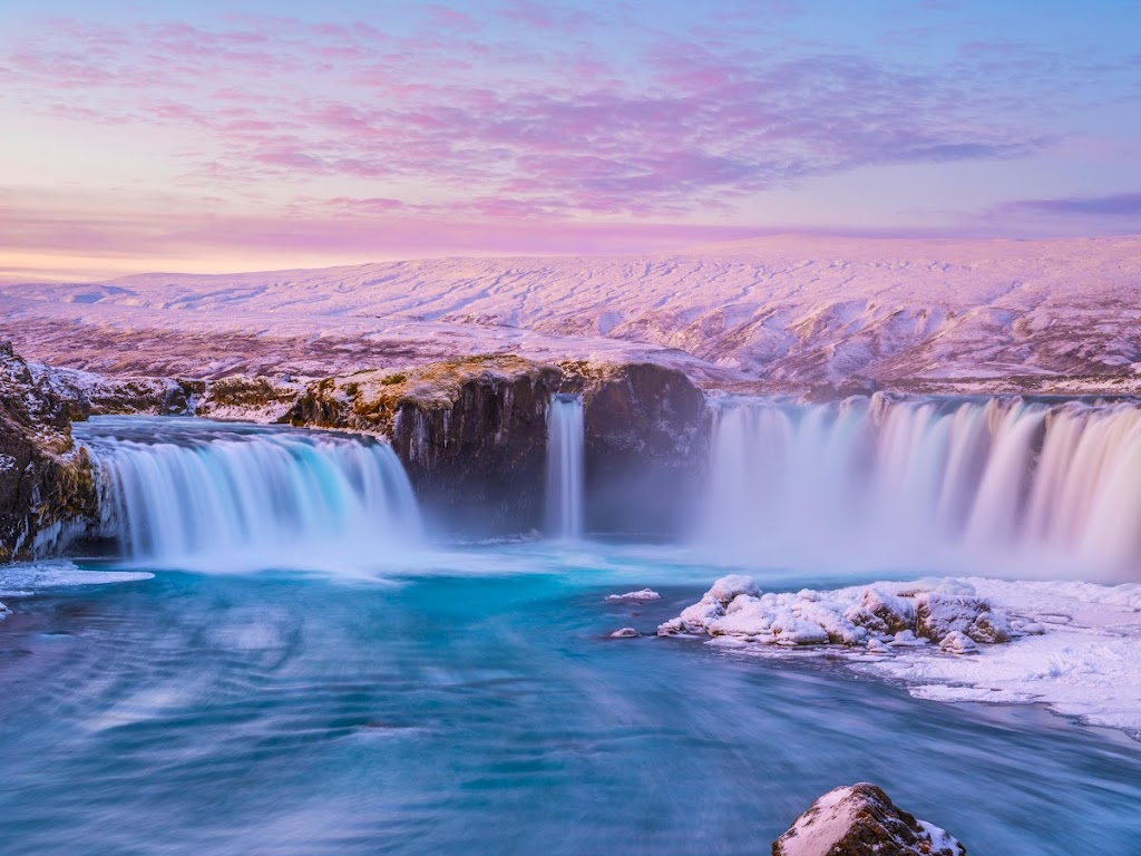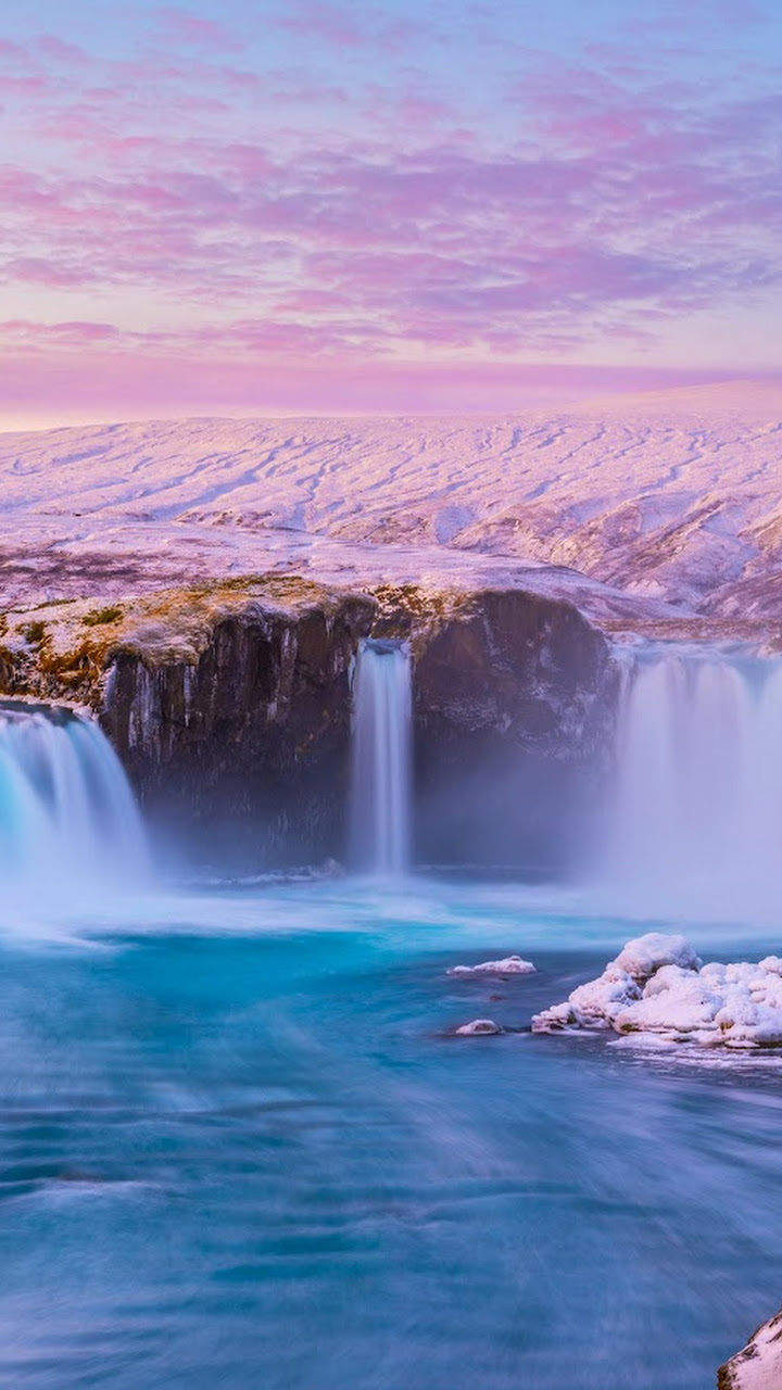 A large winter waterfall flows strongly into a blue river, framed by snow-covered cliffs under a vibrant pink sunset.