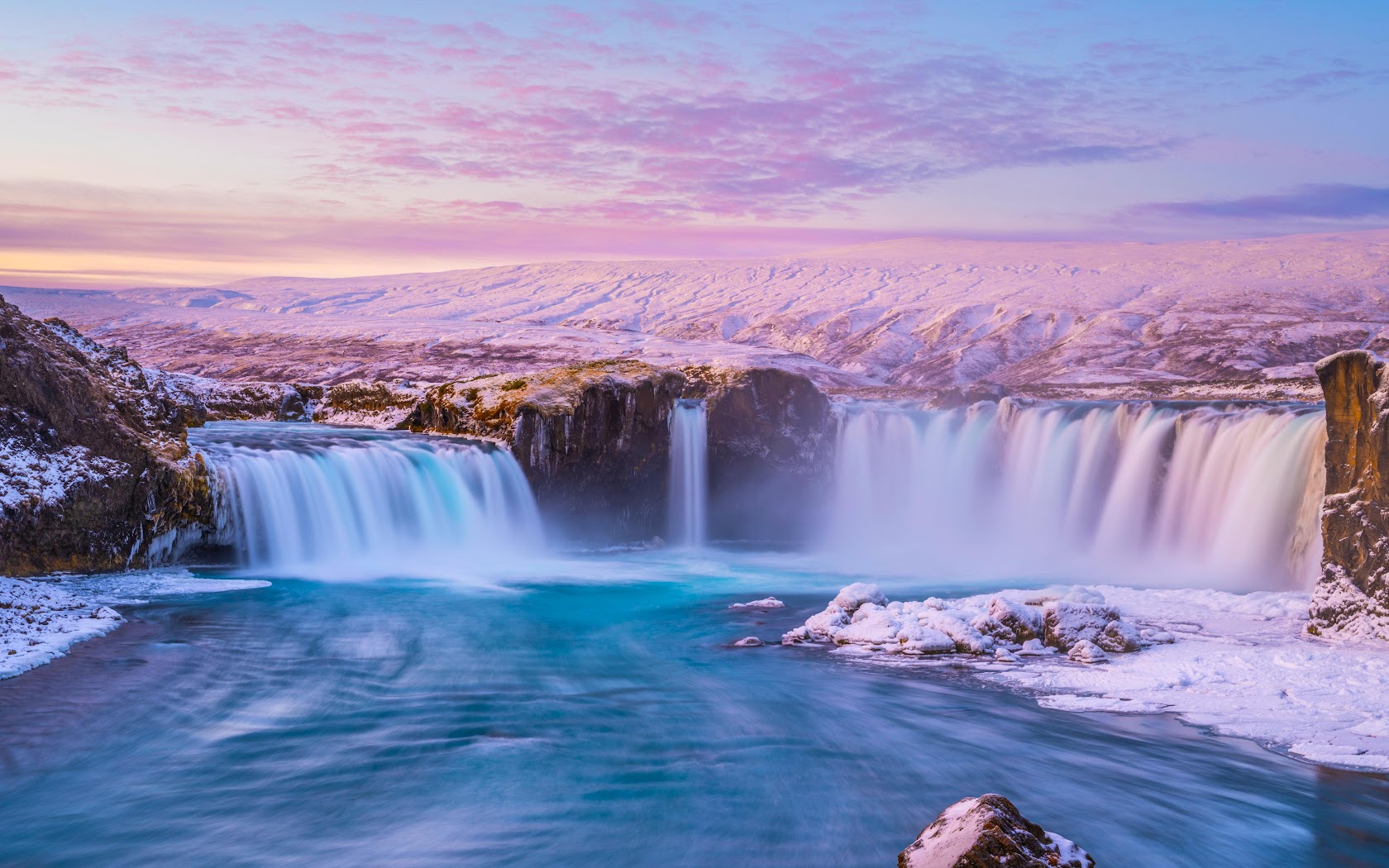 Snowy Waterfall Under Pink Sky 5K Desktop Wallpaper