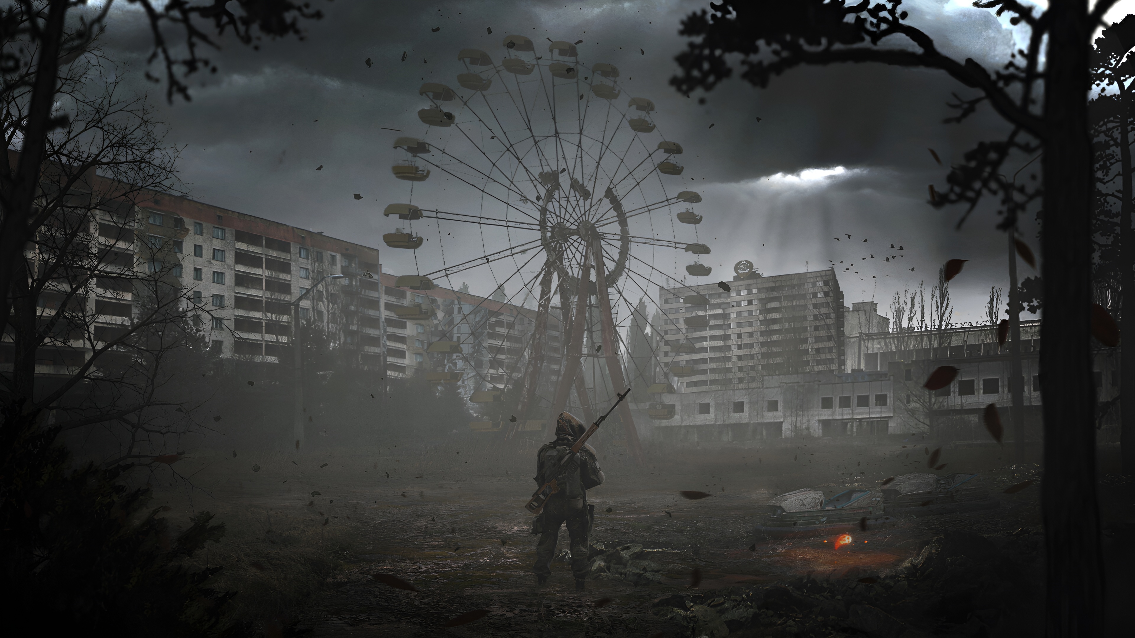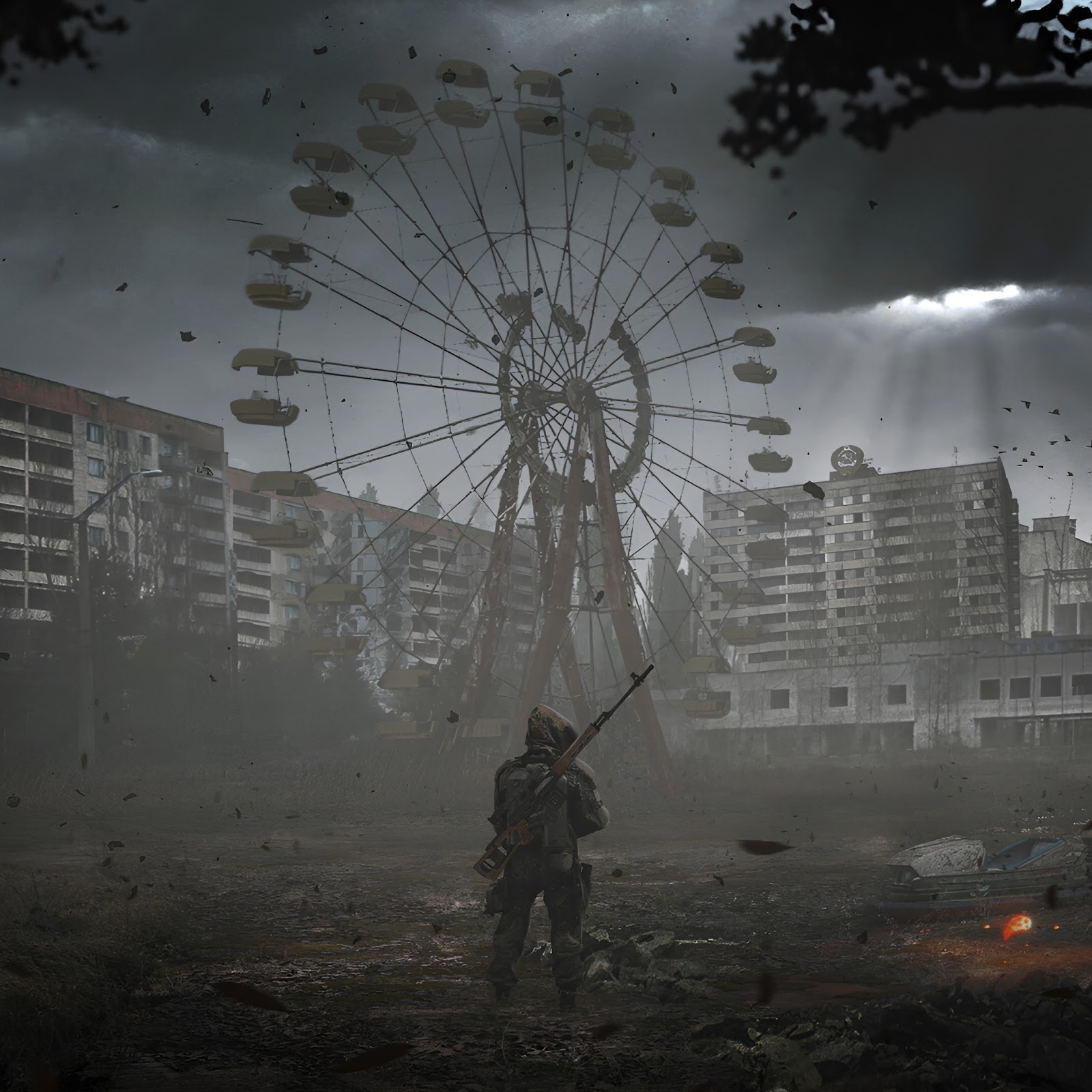 A soldier stands in the abandoned Pripyat amusement park near the iconic Ferris wheel under a dark and stormy sky.