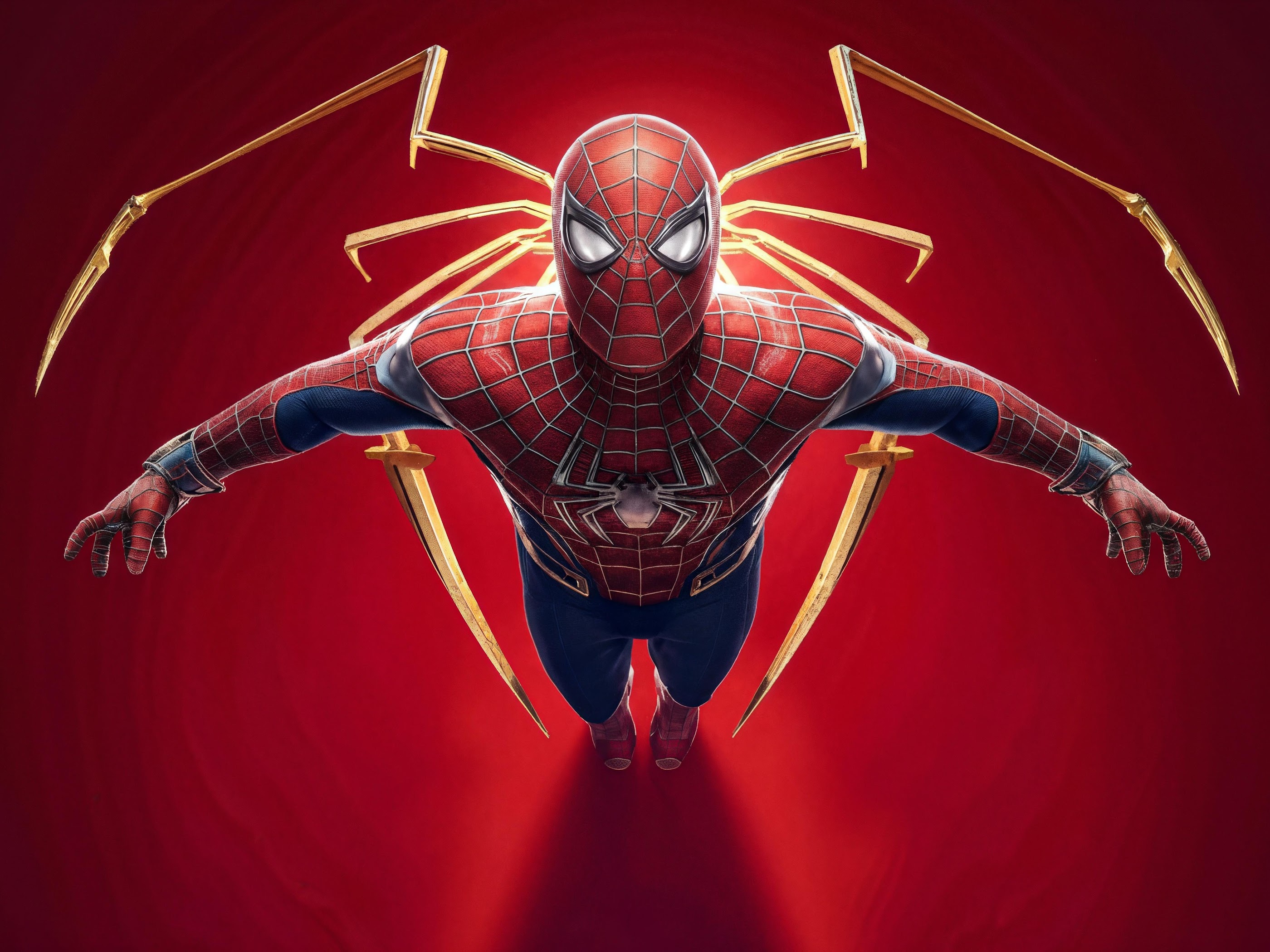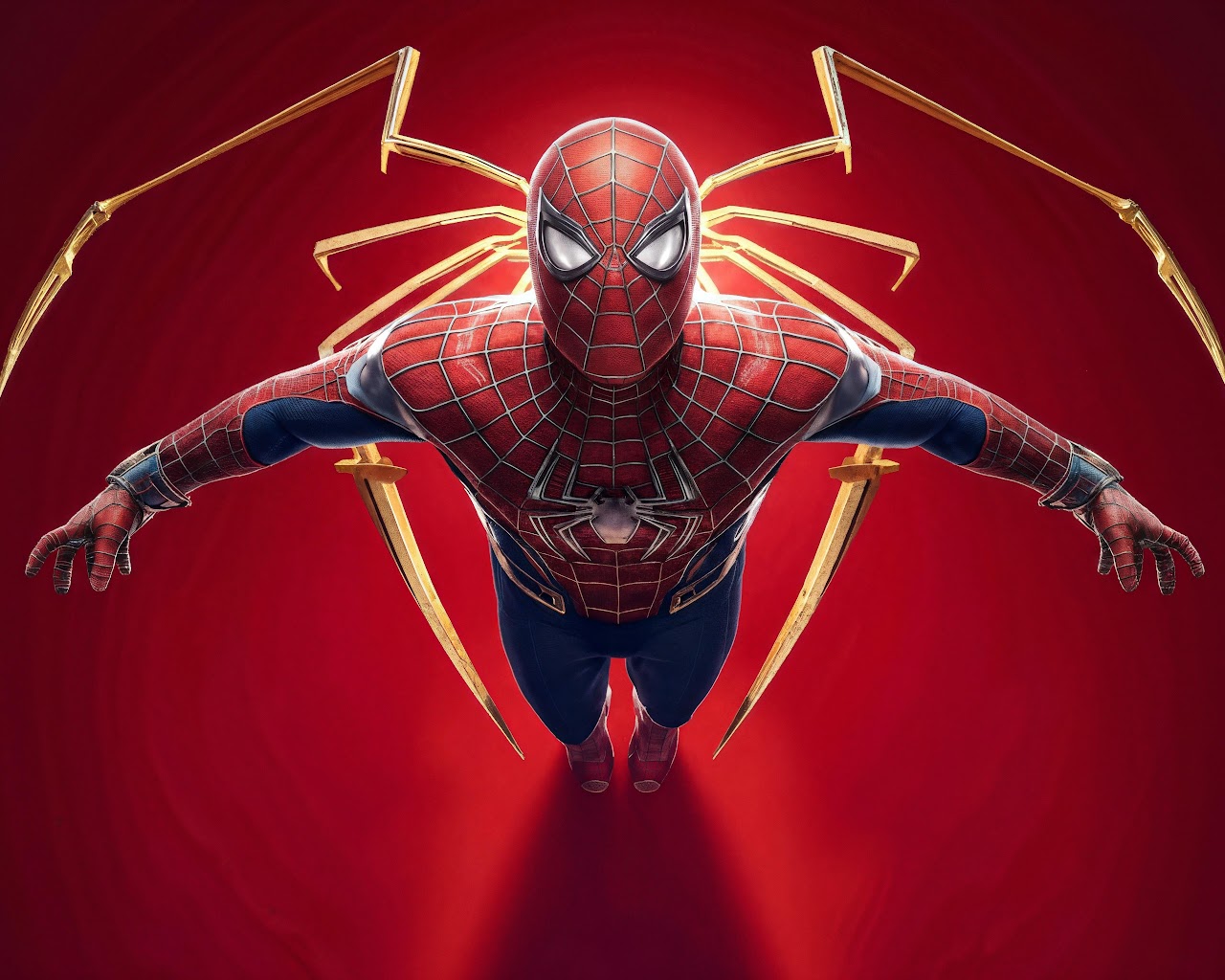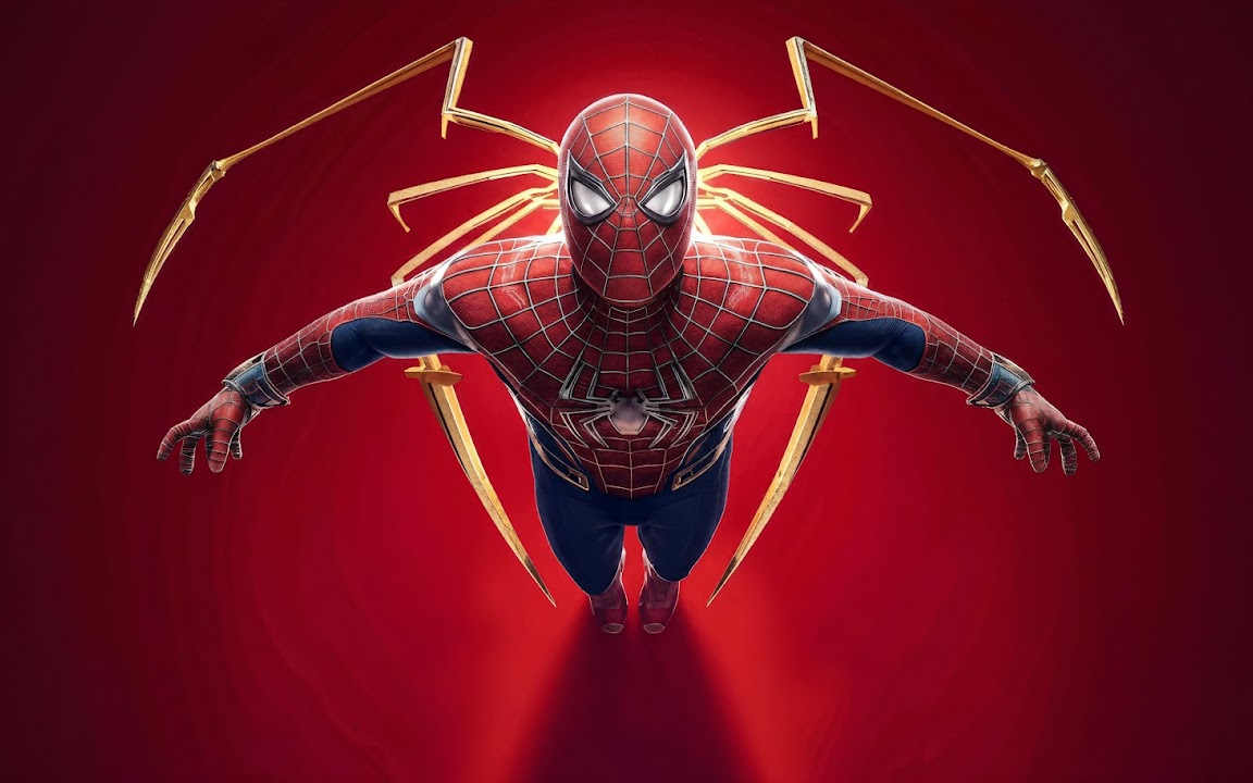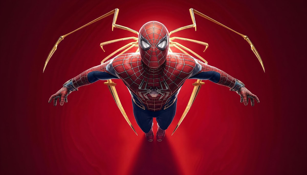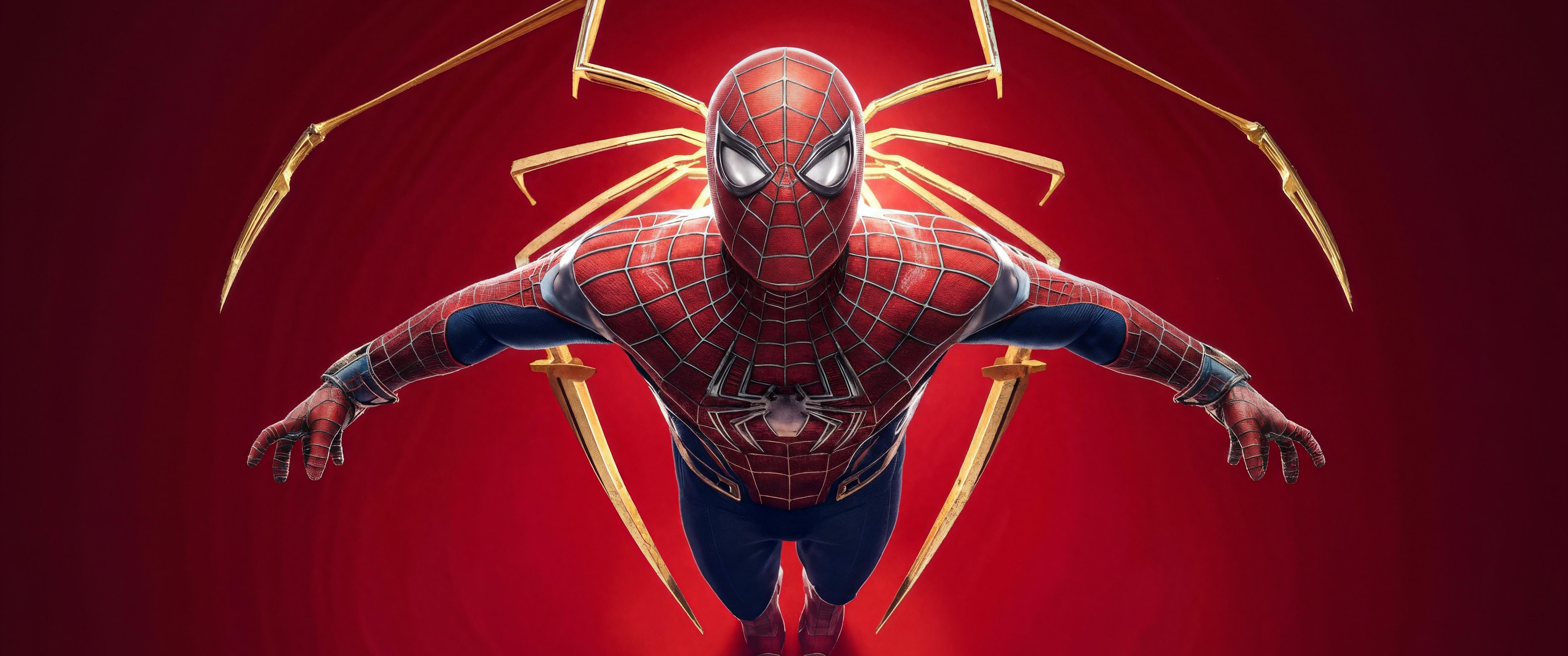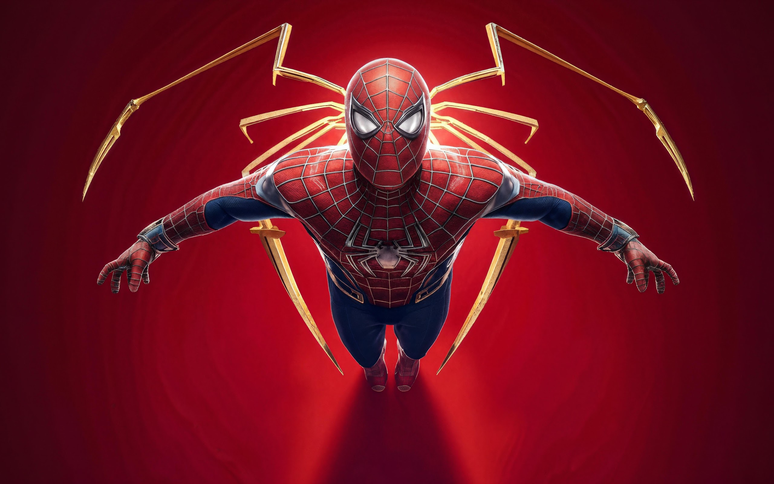 Spider-Man in his Iron Spider suit leaps forward with golden mechanical legs deployed against a bright red background in a cinematic superhero pose.
