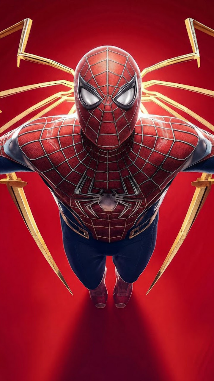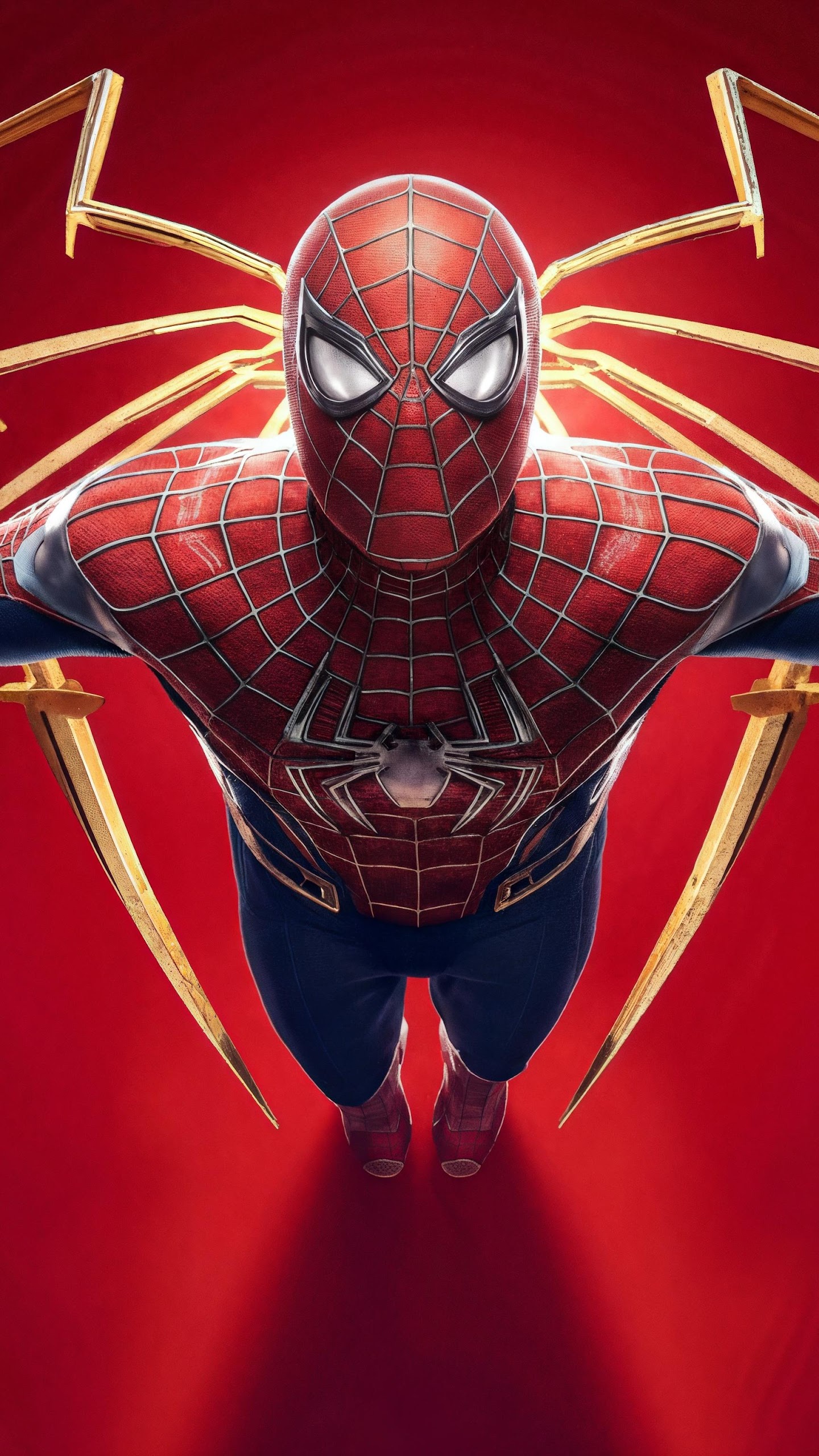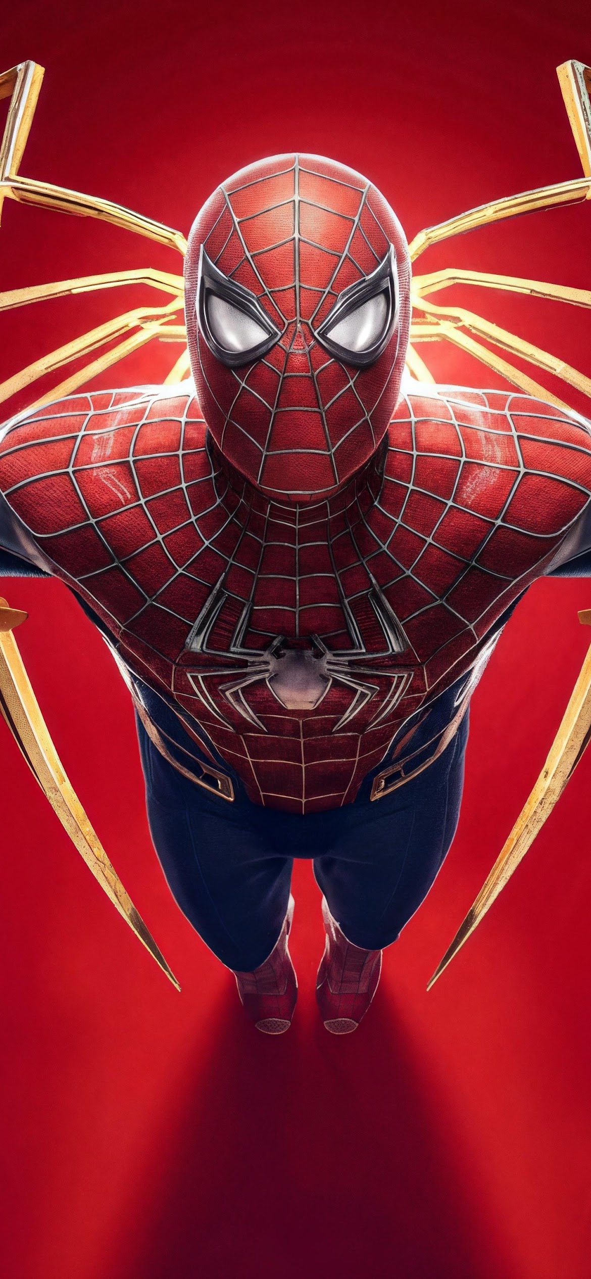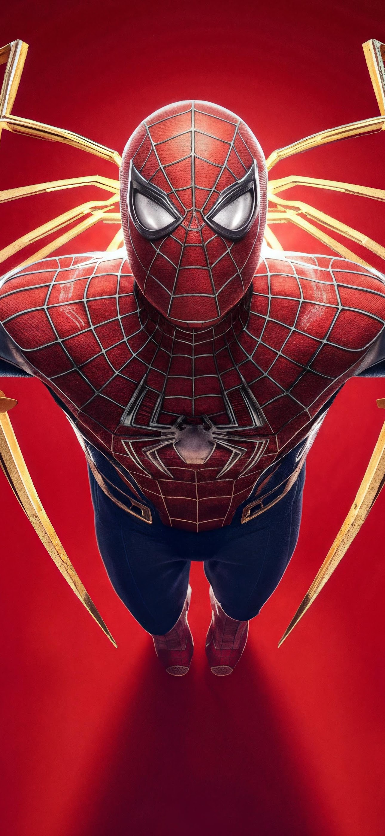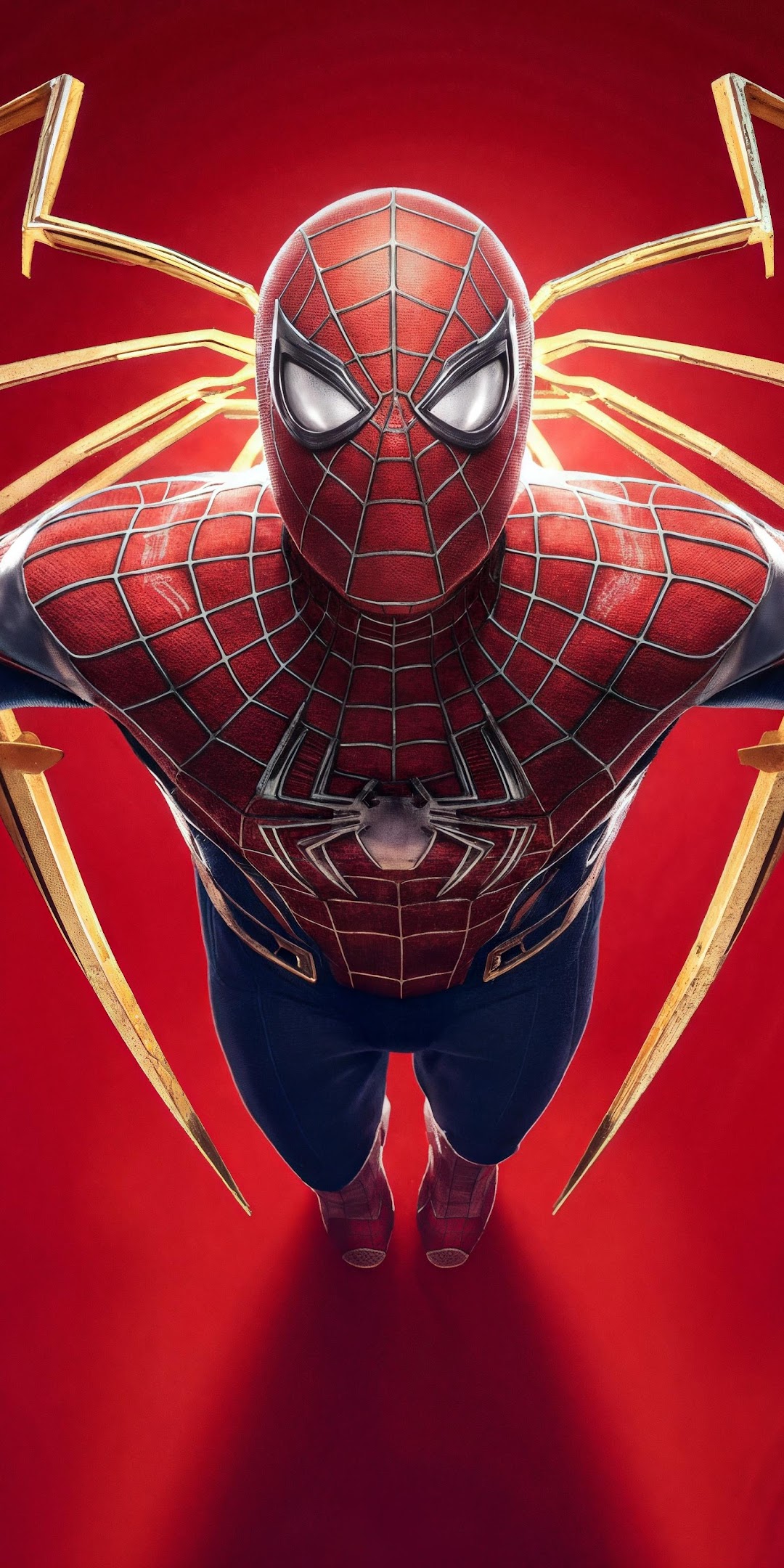 Spider-Man in his Iron Spider suit leaps forward with golden mechanical legs deployed against a bright red background in a cinematic superhero pose.