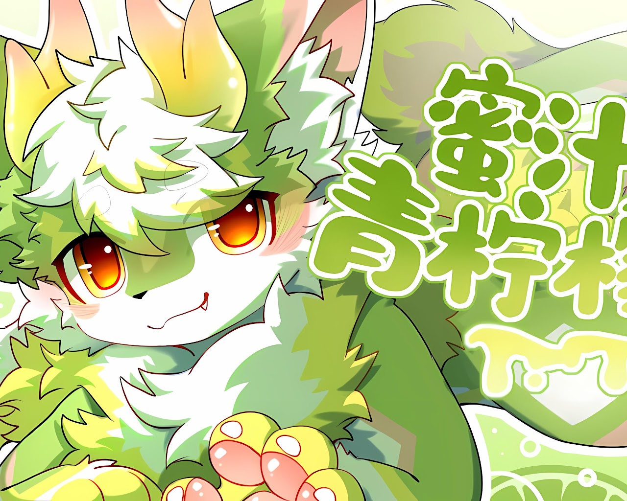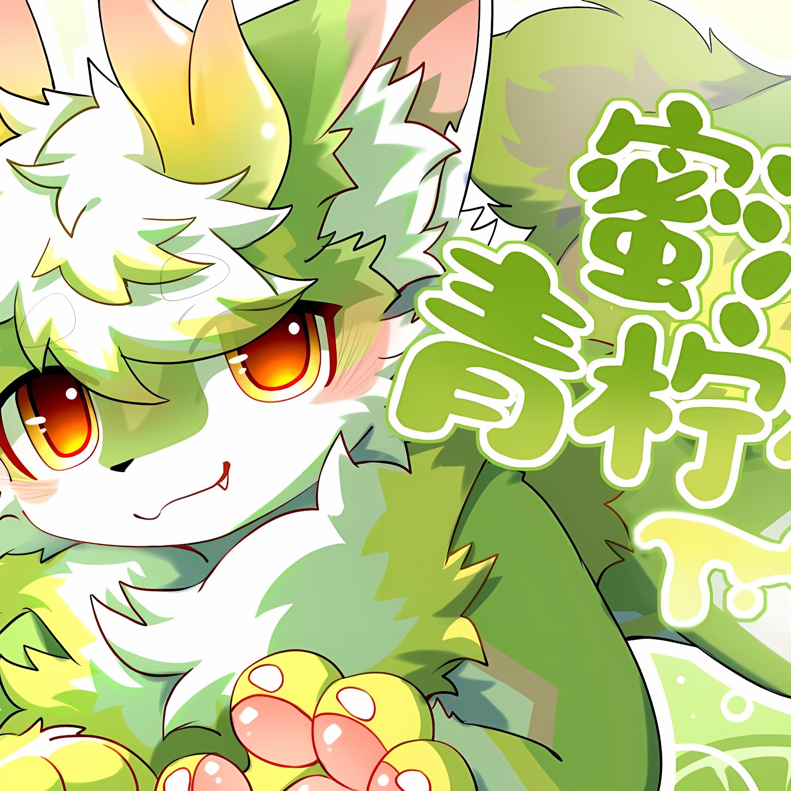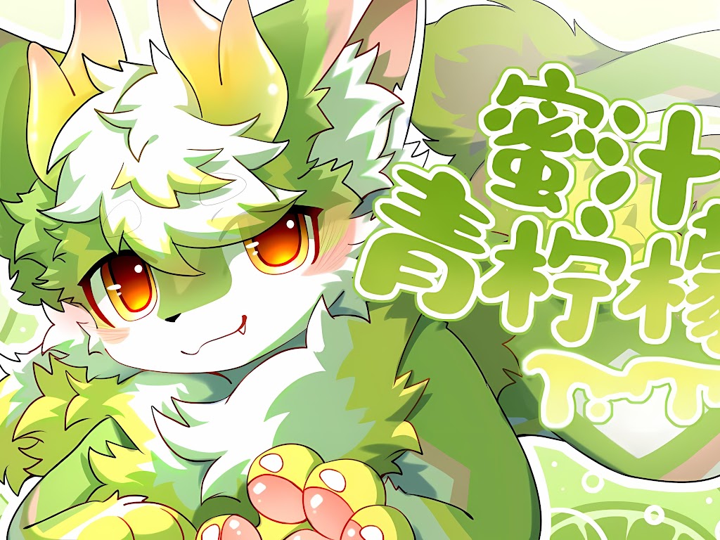 This cute furry character with bright green fur and huge orange eyes is rendered in a vibrant anime illustration style.