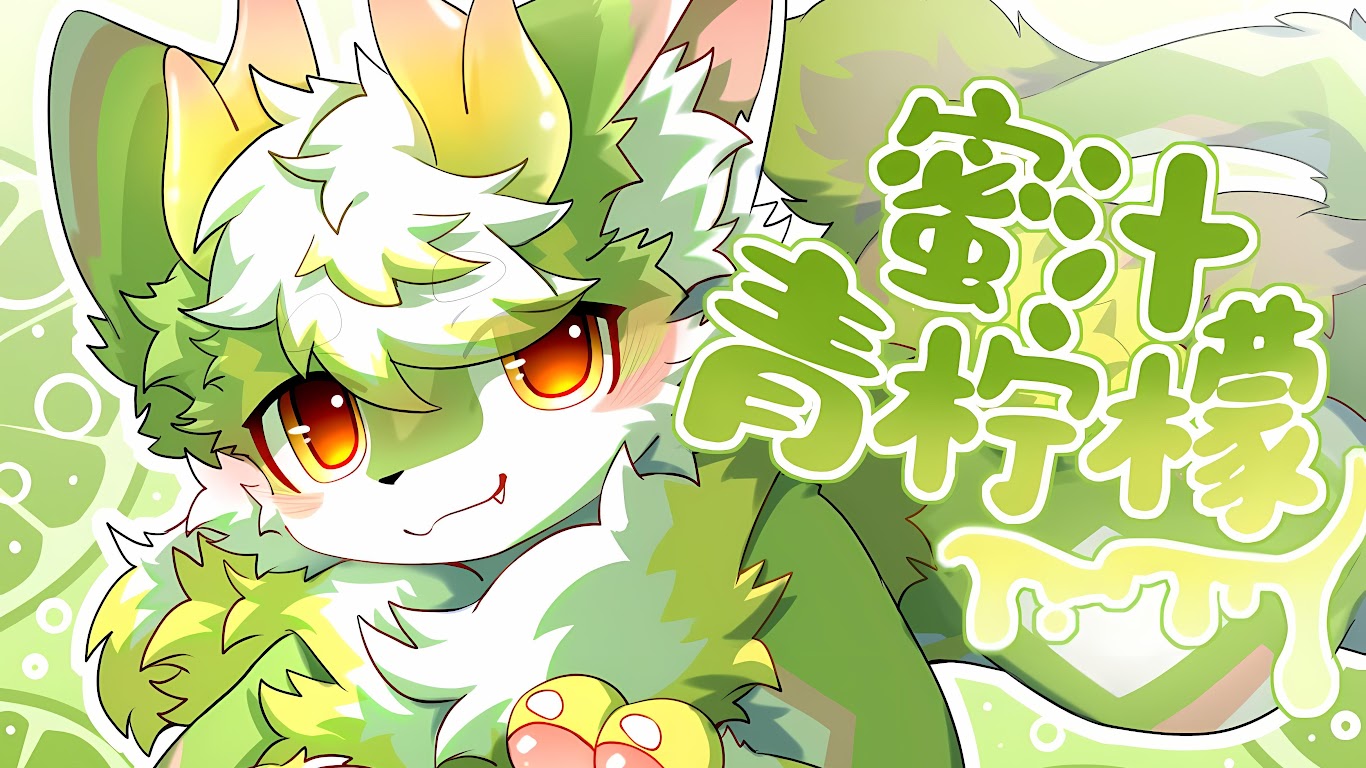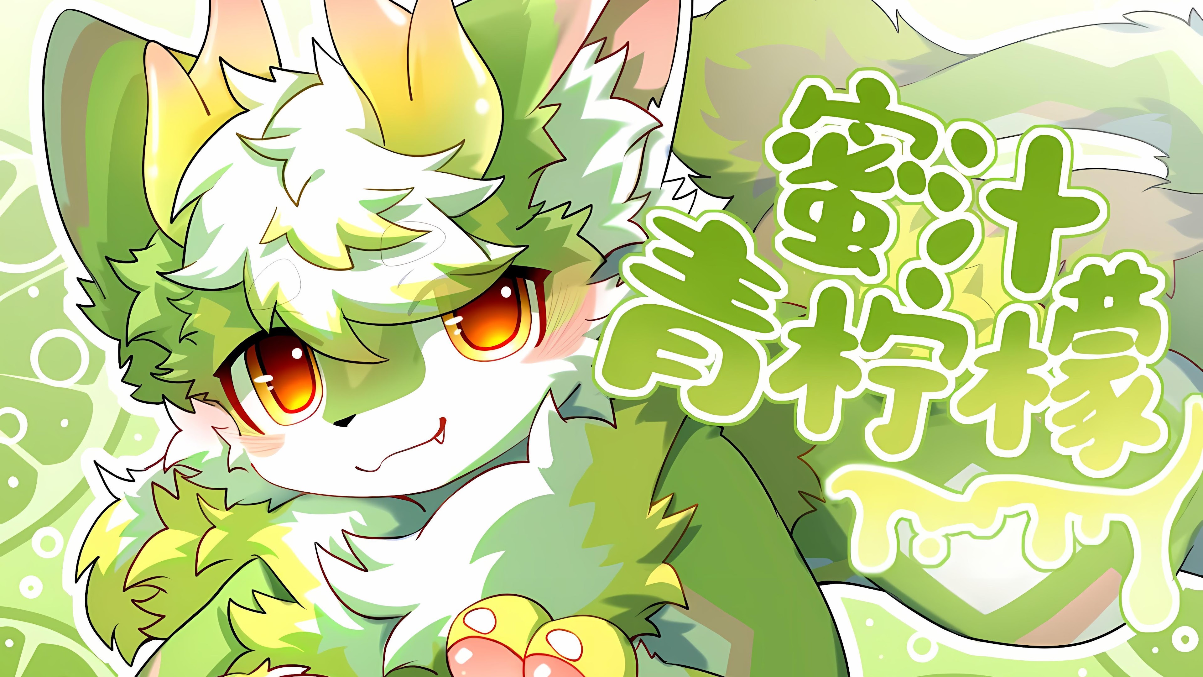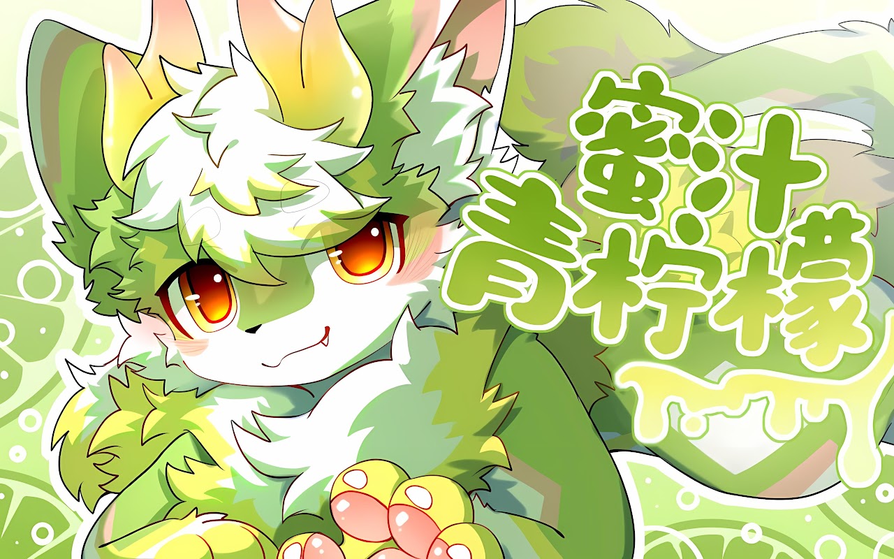 This cute furry character with bright green fur and huge orange eyes is rendered in a vibrant anime illustration style.