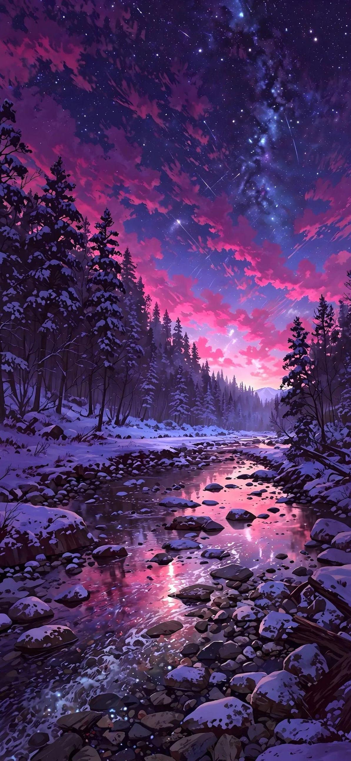 Starry Night Over Winter River Full HD iPhone Wallpaper A calm river flows through a snowy forest under a vibrant purple night sky filled with stars and shooting stars in a beautiful anime style. bu604 479.68 KB 1193x2584 Download original File Size: Dimensions: Resolution: Full HD Format: Mobile ID: Landscape Pine Forest Purple Purple Aesthetic River Starry Sky Winter