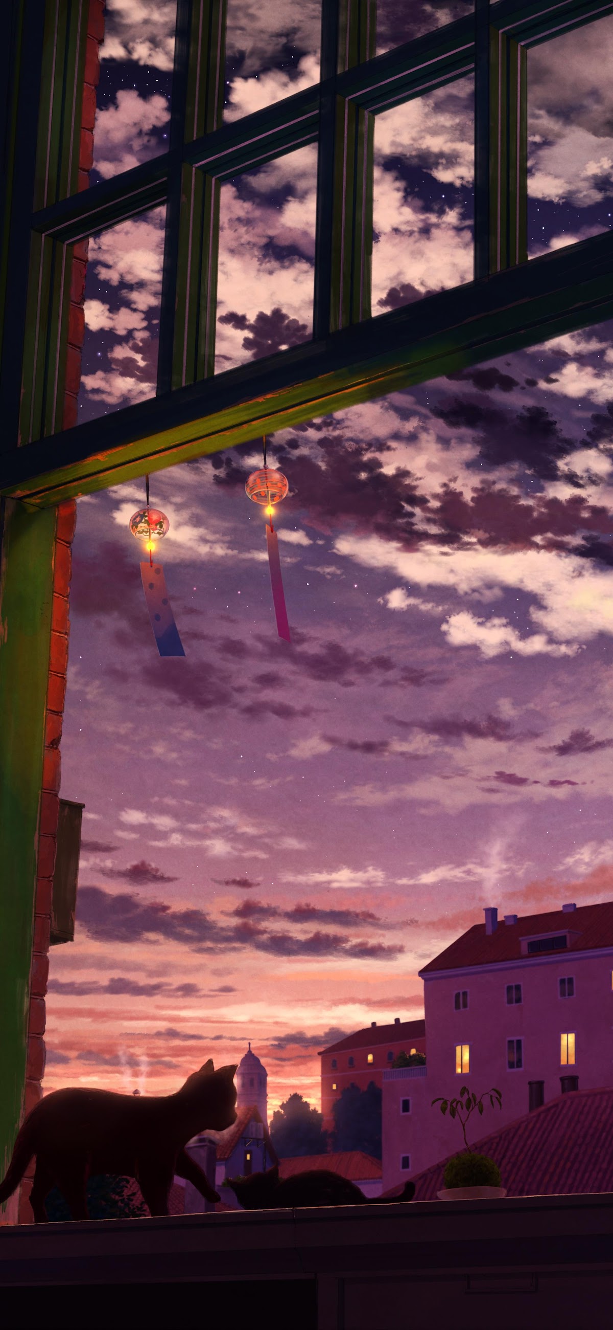 Sunset Window View With Cat 2K iPhone Wallpaper A black cat walks across a window sill looking at a beautiful purple sunset sky and hanging wind chimes above a peaceful city landscape. am176 533.98 KB 1882x4077 Download original File Size: Dimensions: Resolution: 2K Format: Mobile ID: Aesthetic Anime Style Cat Lo-Fi Purple Sunset Window View