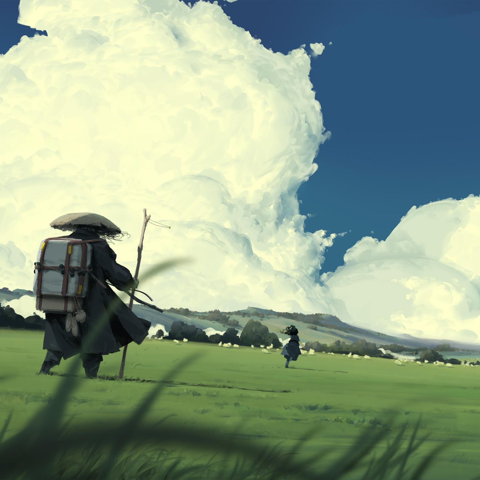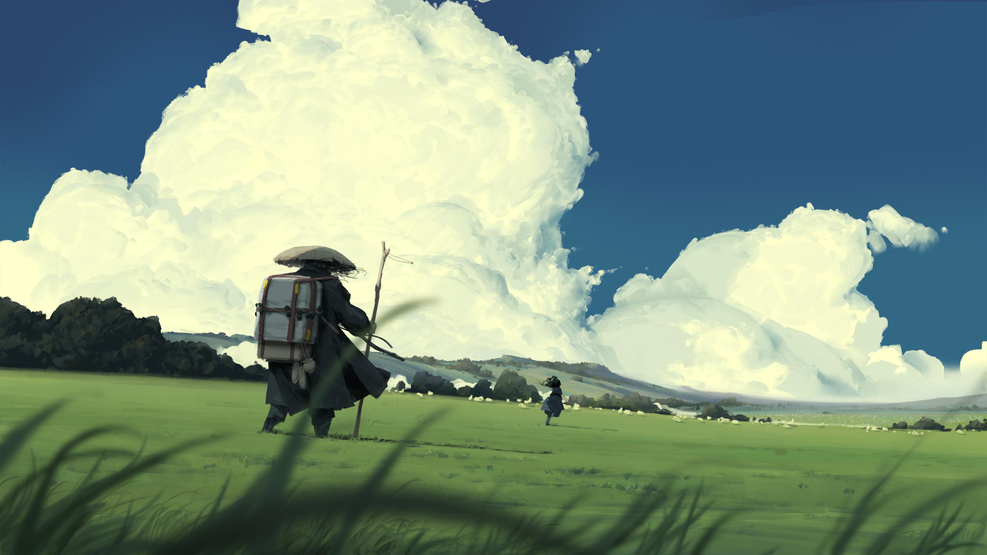 A mysterious traveler wearing a dark coat and straw hat walks across a vibrant green field under huge white cumulus clouds.