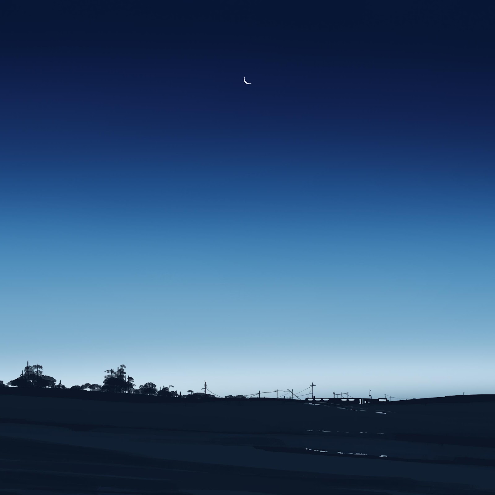 Dark pine trees stand silhouetted against a deep blue twilight sky showing a tiny crescent moon in a serene digital art style.