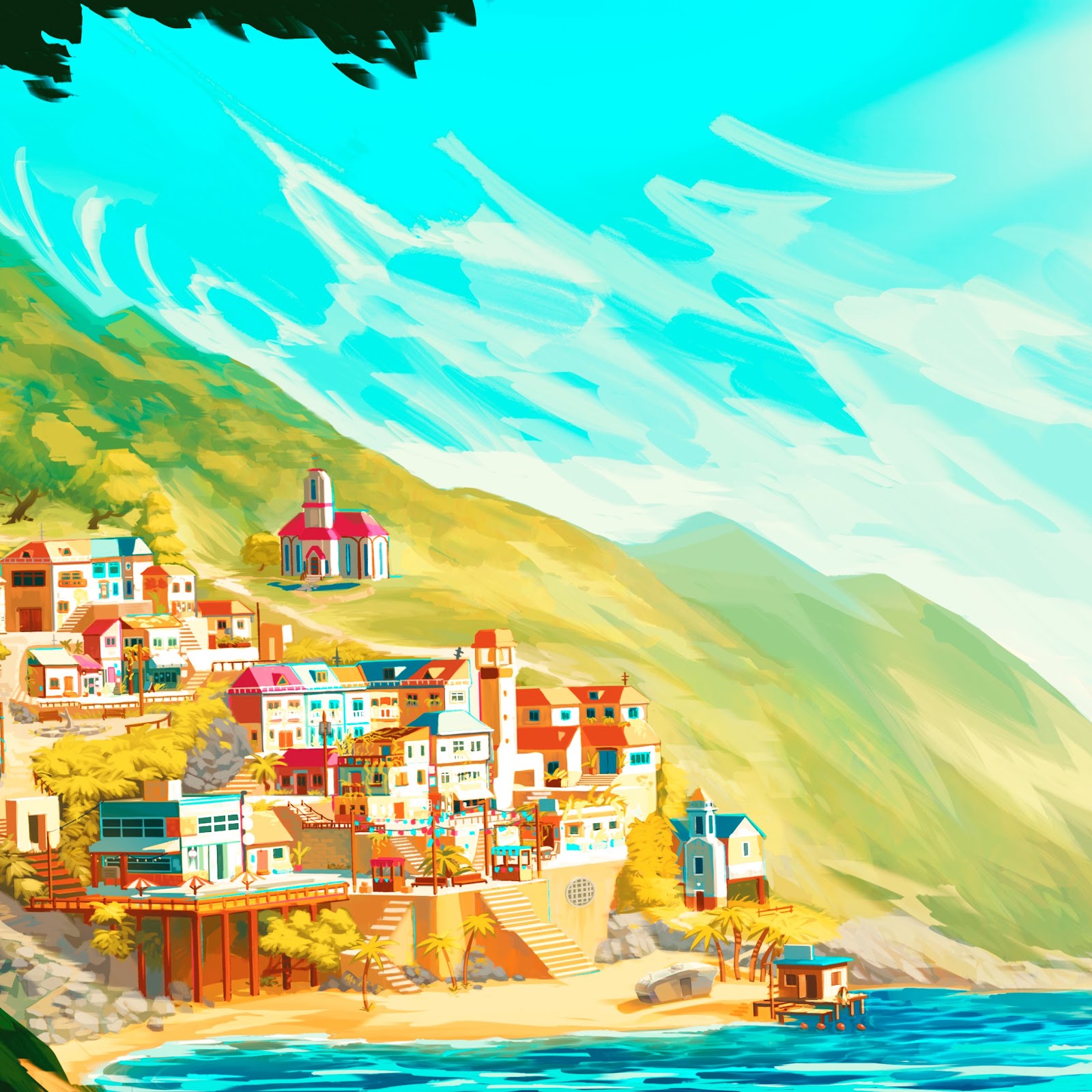 A colorful hillside village stands next to the bright blue ocean water under a sunny sky with a cheerful, vibrant digital art style.