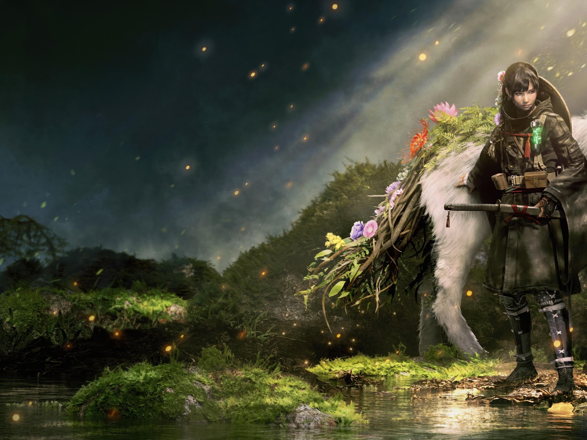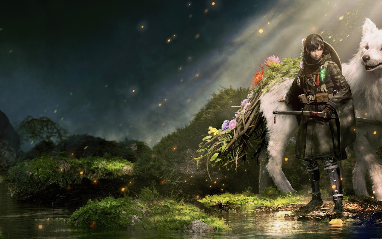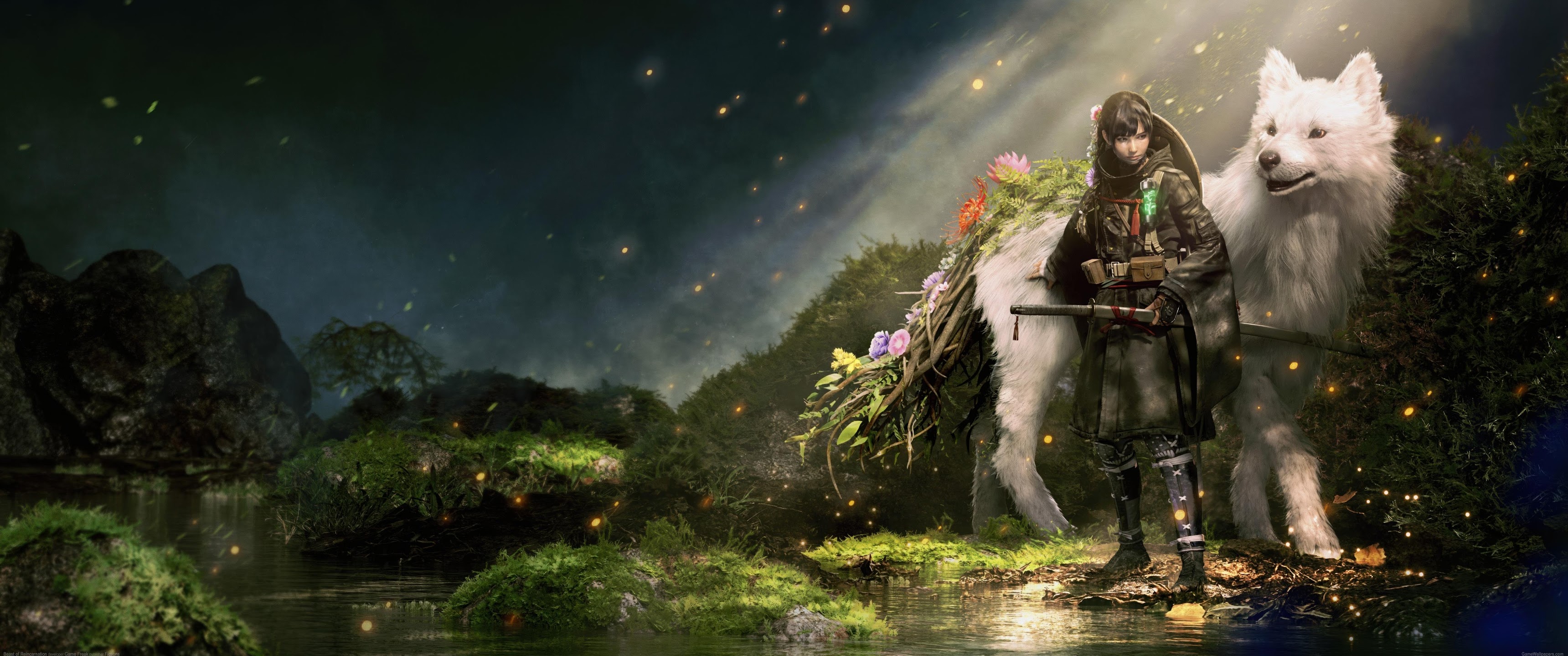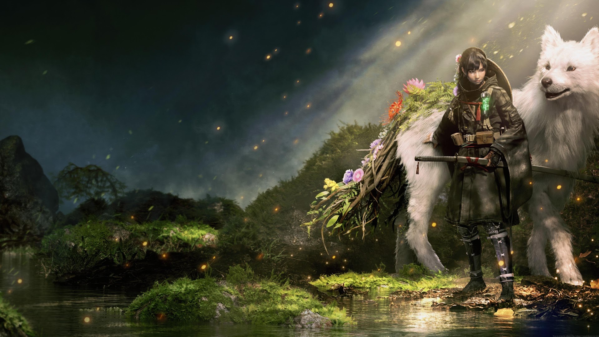 A dark warrior girl stands next to a large, floral-decorated white wolf in a misty, enchanted forest scene.